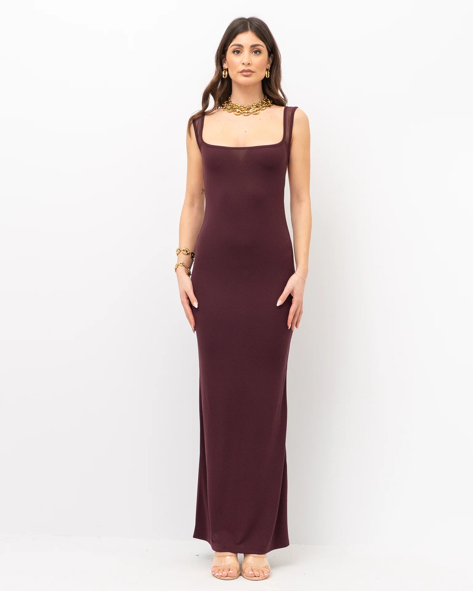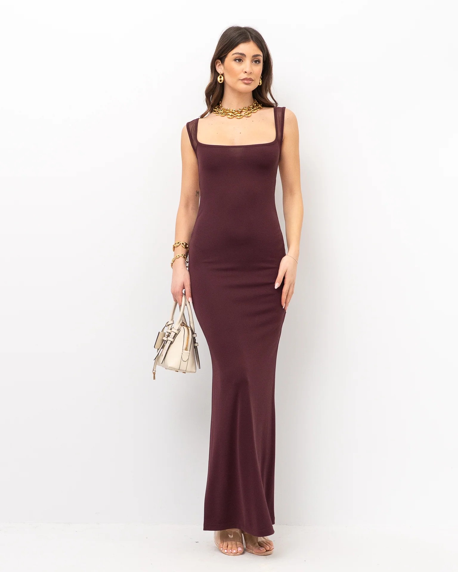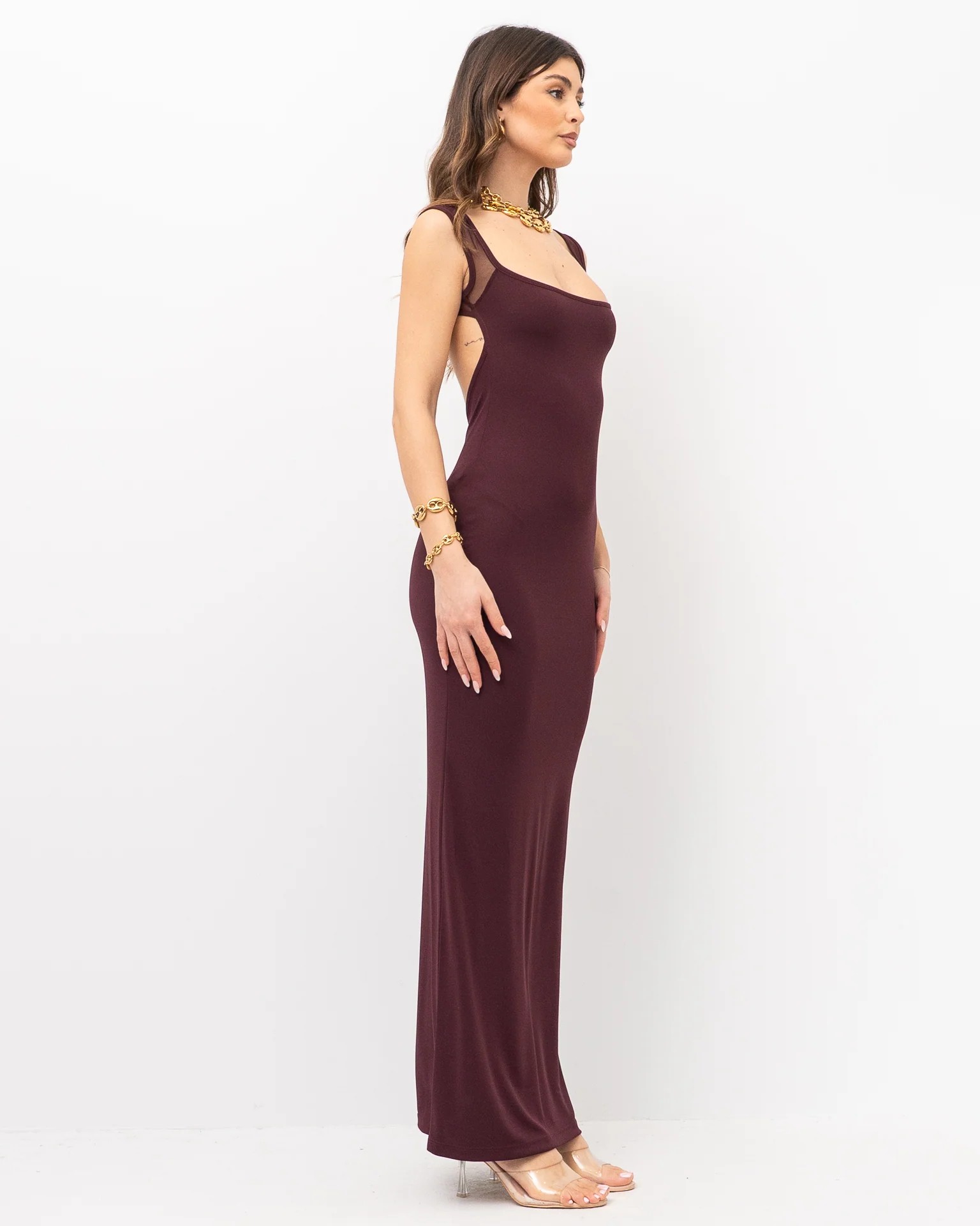 L’abito della collezione primavera/estate di Kostumn°1 è caratterizzato da una silhouette aderente con scollo squadrato e spalline larghe. Il design è arricchito da inserti in tulle trasparente nella parte superiore, che proseguono sul retro creando una schiena scoperta con dettaglio incrociato. La linea scivolata accompagna la figura fino al fondo con eleganza essenziale.