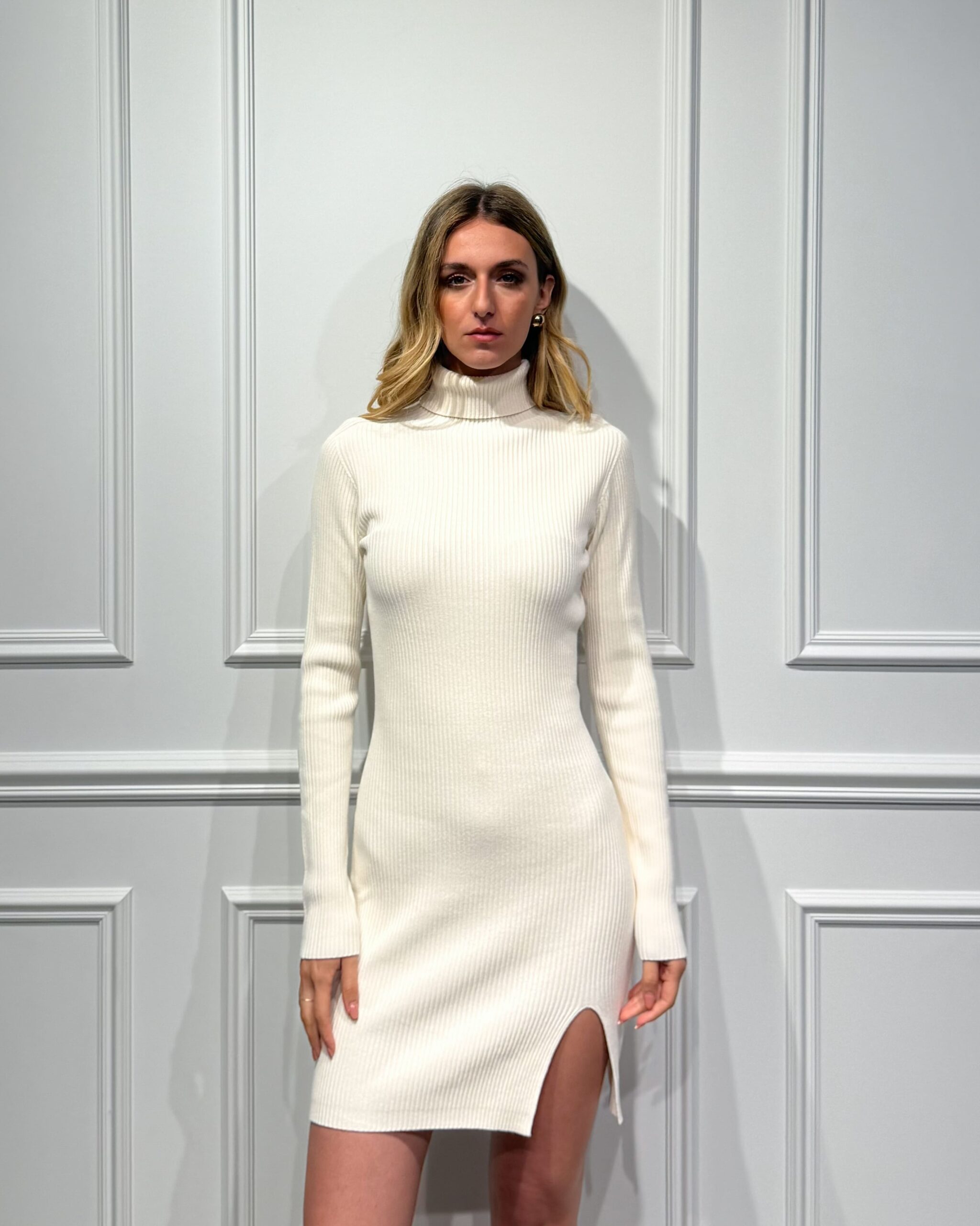 L’abito in viscosa della collezione autunno/inverno di Kontatto è caratterizzato dalla lavorazione a costine e presenta collo alto e spacchetto laterale.