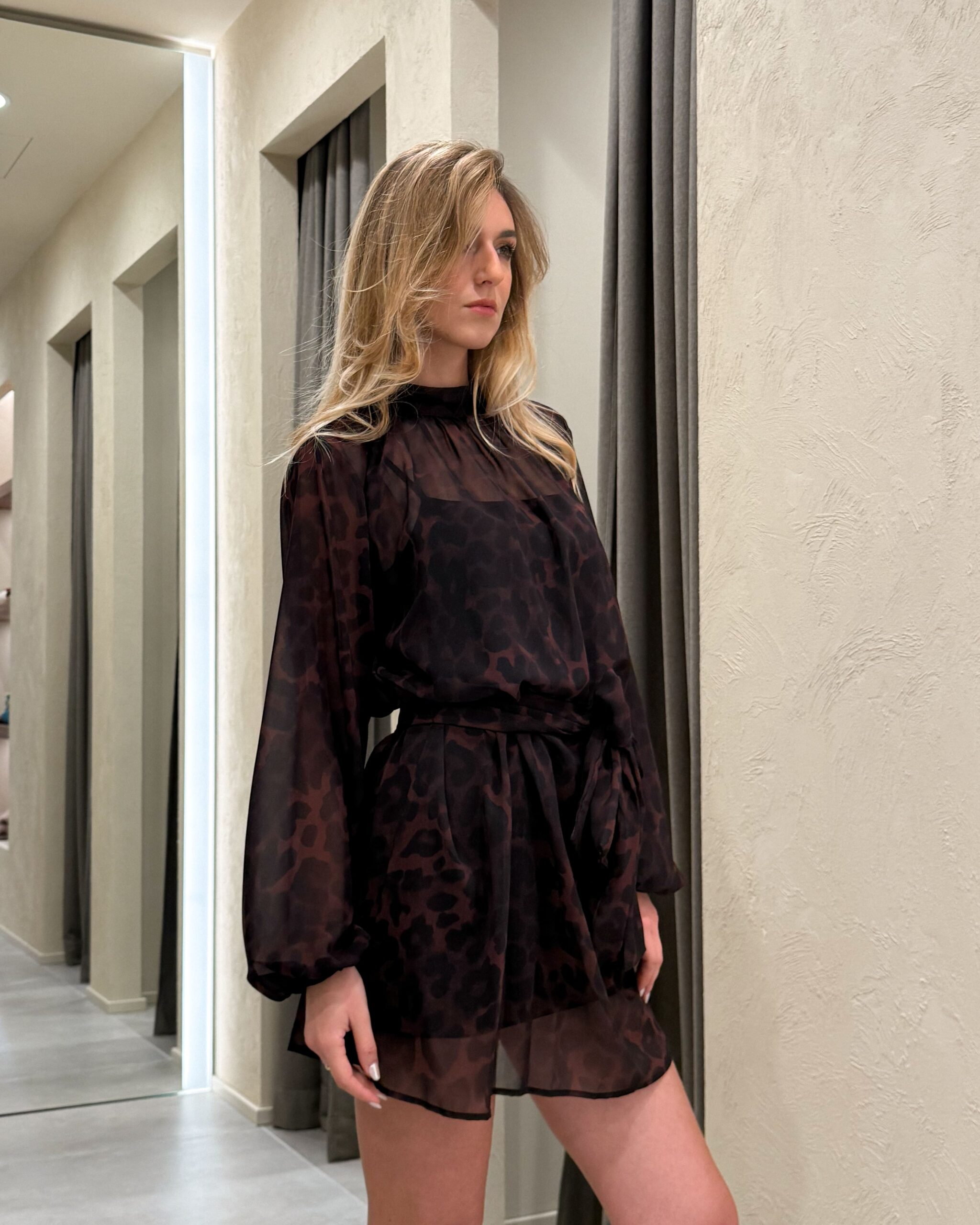 L’abito animalier della collezione autunno/inverno di Kontatto combina dettagli femminili e silhouette armoniosa: colletto, maniche a palloncino dall’effetto romantico e fusciacca coordinata che definisce la vita. La gonna dalla linea morbida crea volume fluido, completata dalla sottoveste che ne garantisce copertura e comfort. Chiusura posteriore al collo.