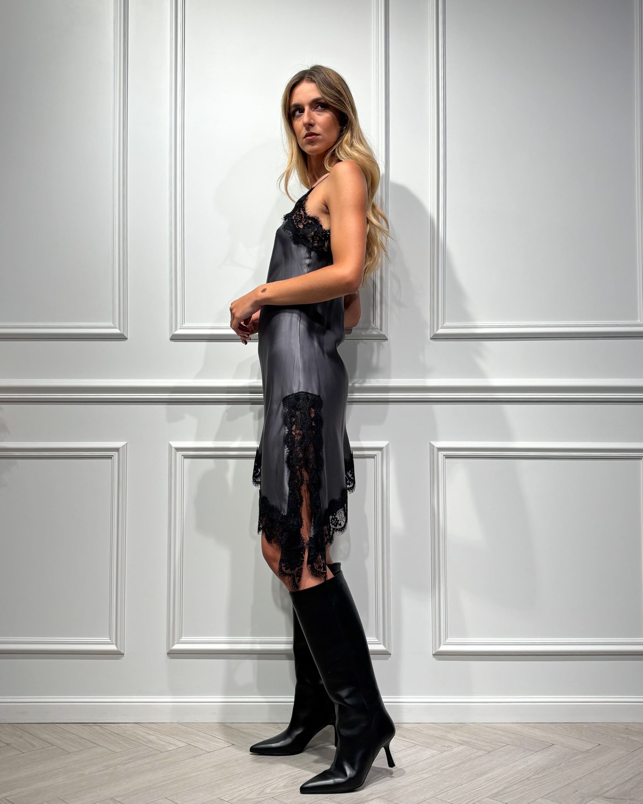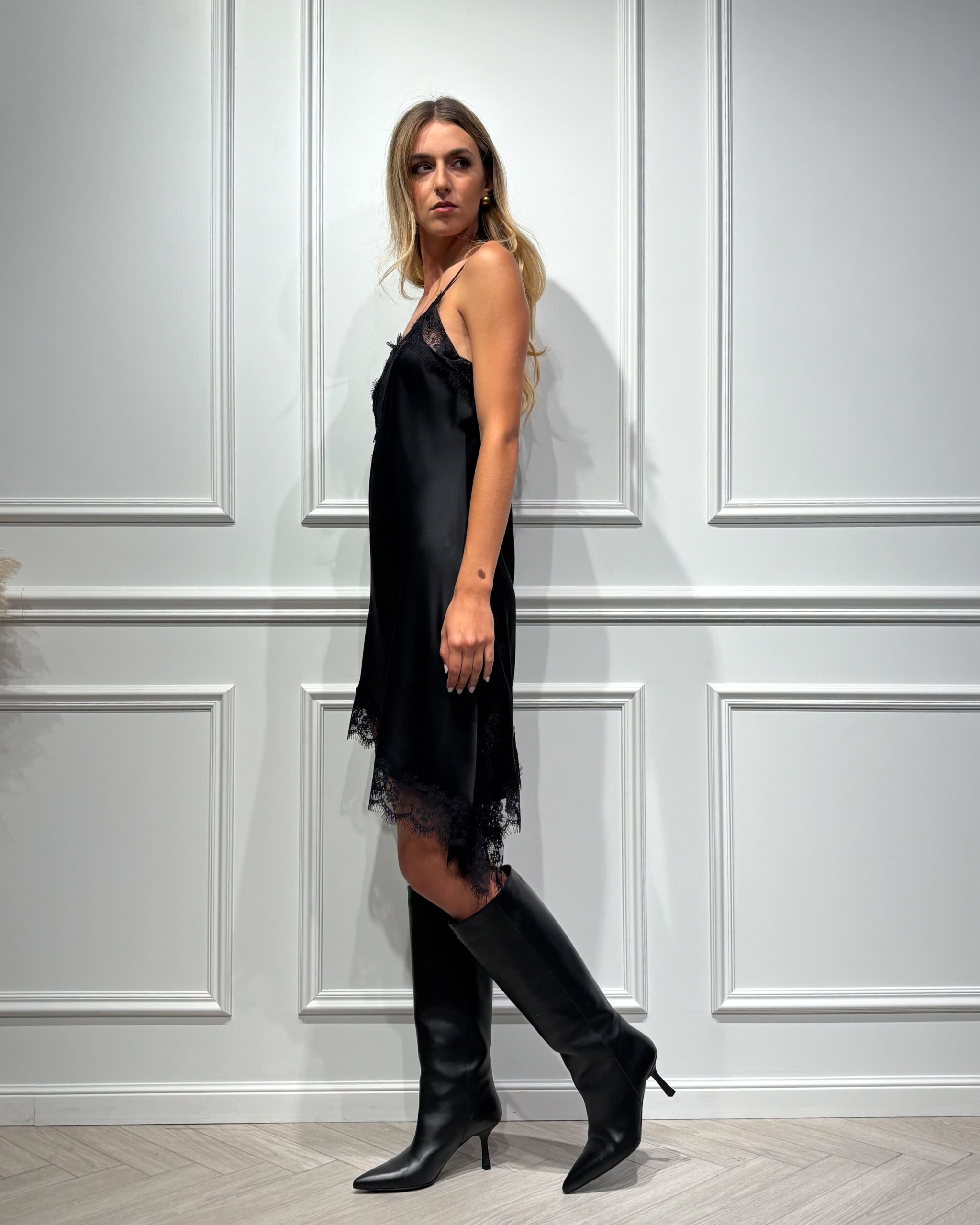 Lo slip dress della collezione autunno/inverno di Vicolo è realizzato in tessuto satinato con inserti in pizzo nero ed orlo asimmetrico con spacco. Presenta spallini sottili regolabili e vestibilità scivolata a valorizzare con eleganza la figura.