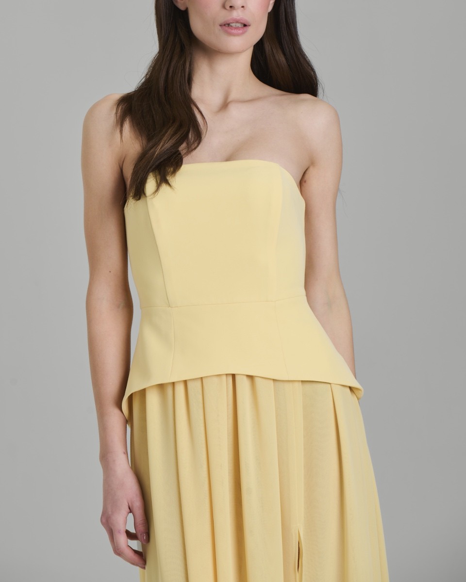 L’abito della collezione primavera/estate di Face to Face Style è caratterizzato da un elegante design lungo con scollo a fascia dritto e silhouette senza spalline. Il corpino strutturato valorizza la figura, mentre il punto vita definito lascia spazio a una morbida balza asimmetrica che introduce la gonna ampia e fluida in chiffon. Il delicato tono giallo illumina il look con raffinata leggerezza.