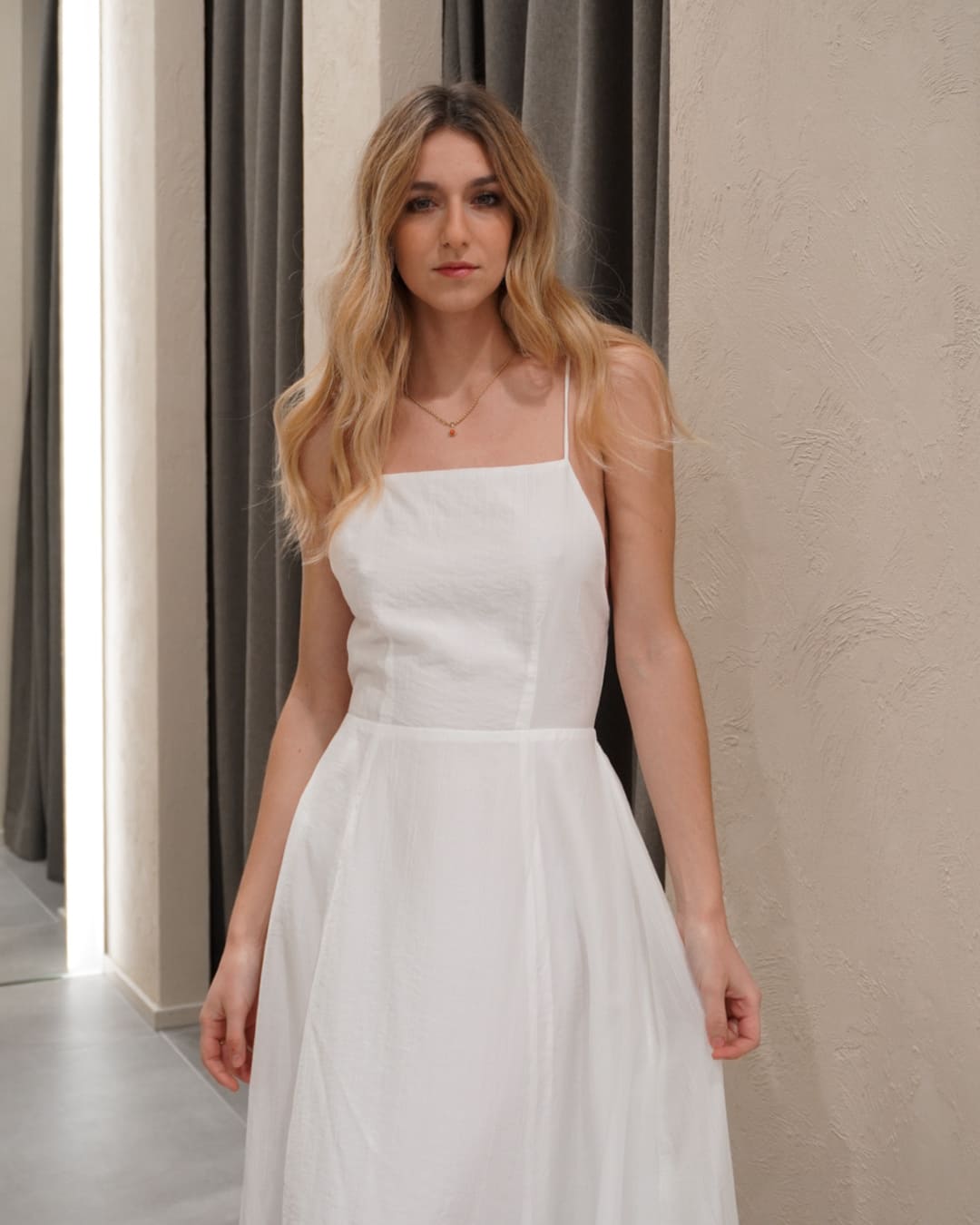 L’abito della collezione primavera/estate di Eleh si distingue per la linea fluida della gonna svasata e per il raffinato scollo halter che lascia la schiena scoperta. La chiusura con lacci sul retro e l’elastico posteriore assicurano una vestibilità confortevole e adattabile. Sottoveste in dotazione.
