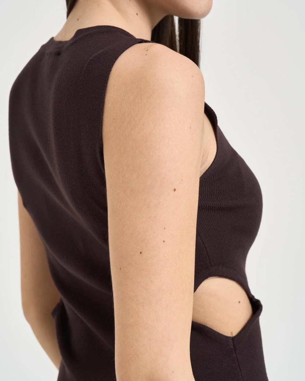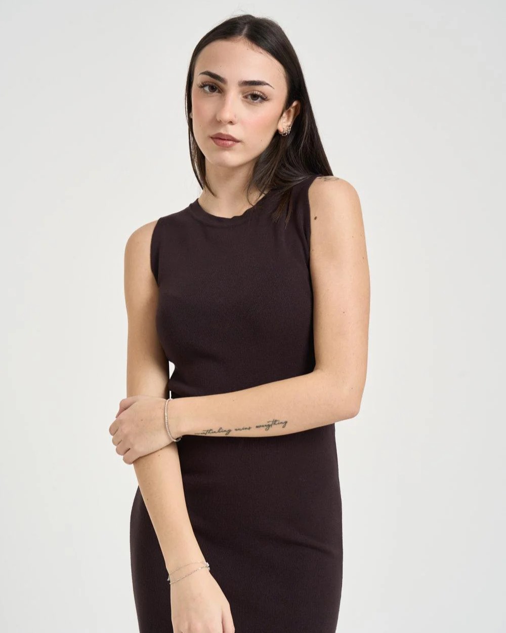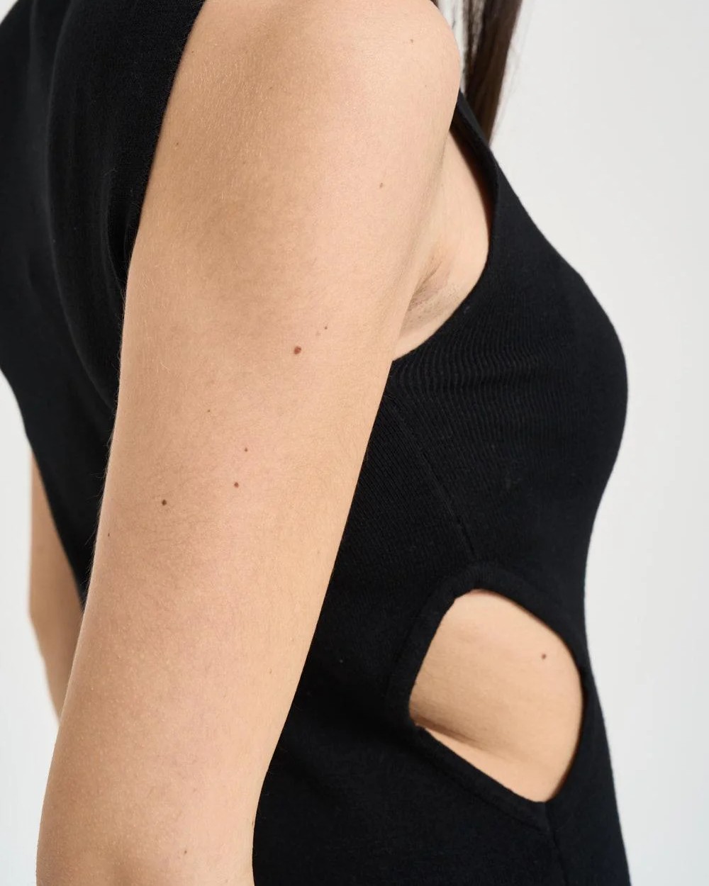 L’abito della collezione primavera/estate di Kontatto si distingue per il fit aderente e taglio midi. Presenta collo a giro, design smanicato e distintivi cut-out laterali che scolpiscono il punto vita. La lavorazione a costine verticali slancia la figura e valorizza le forme con equilibrio.