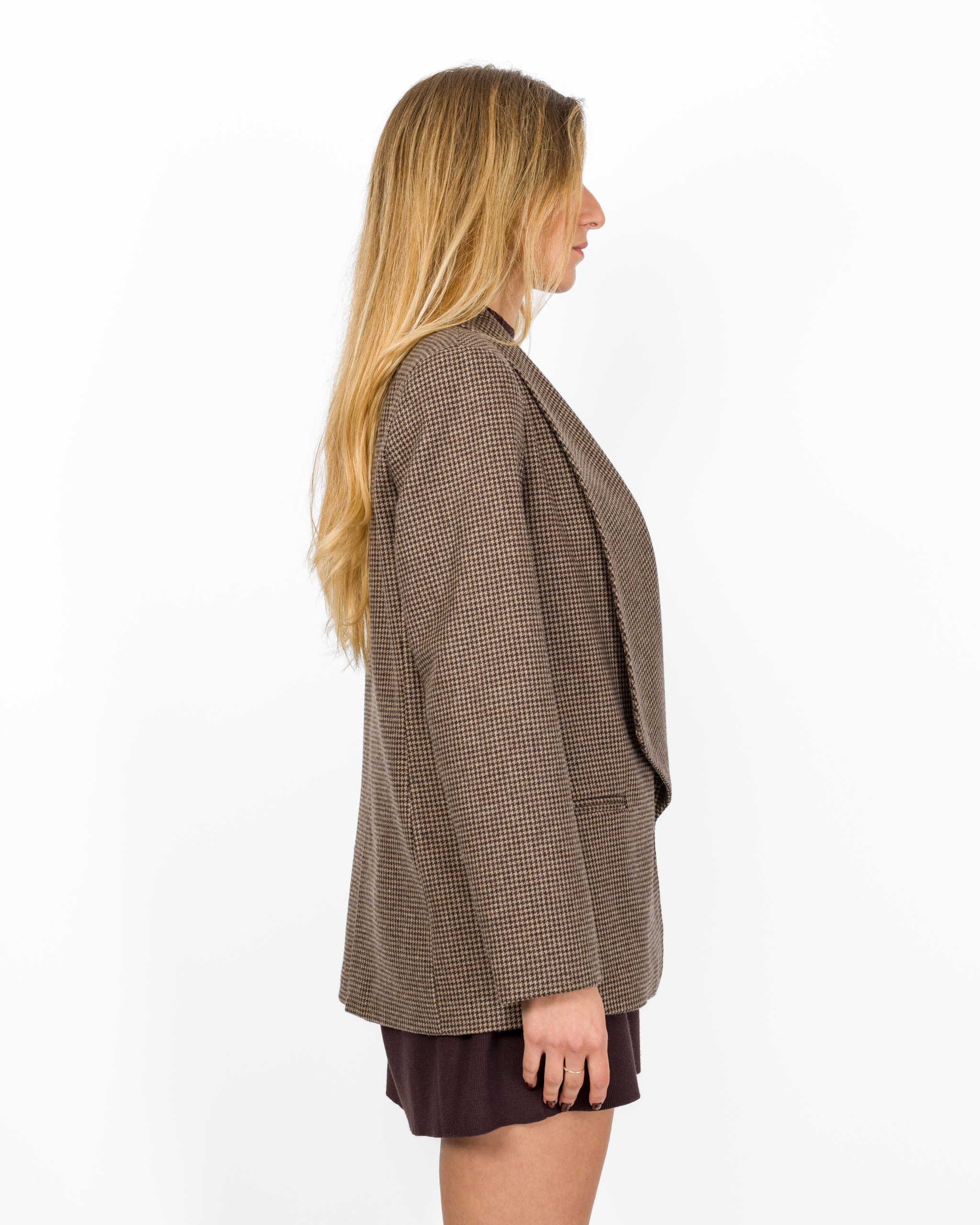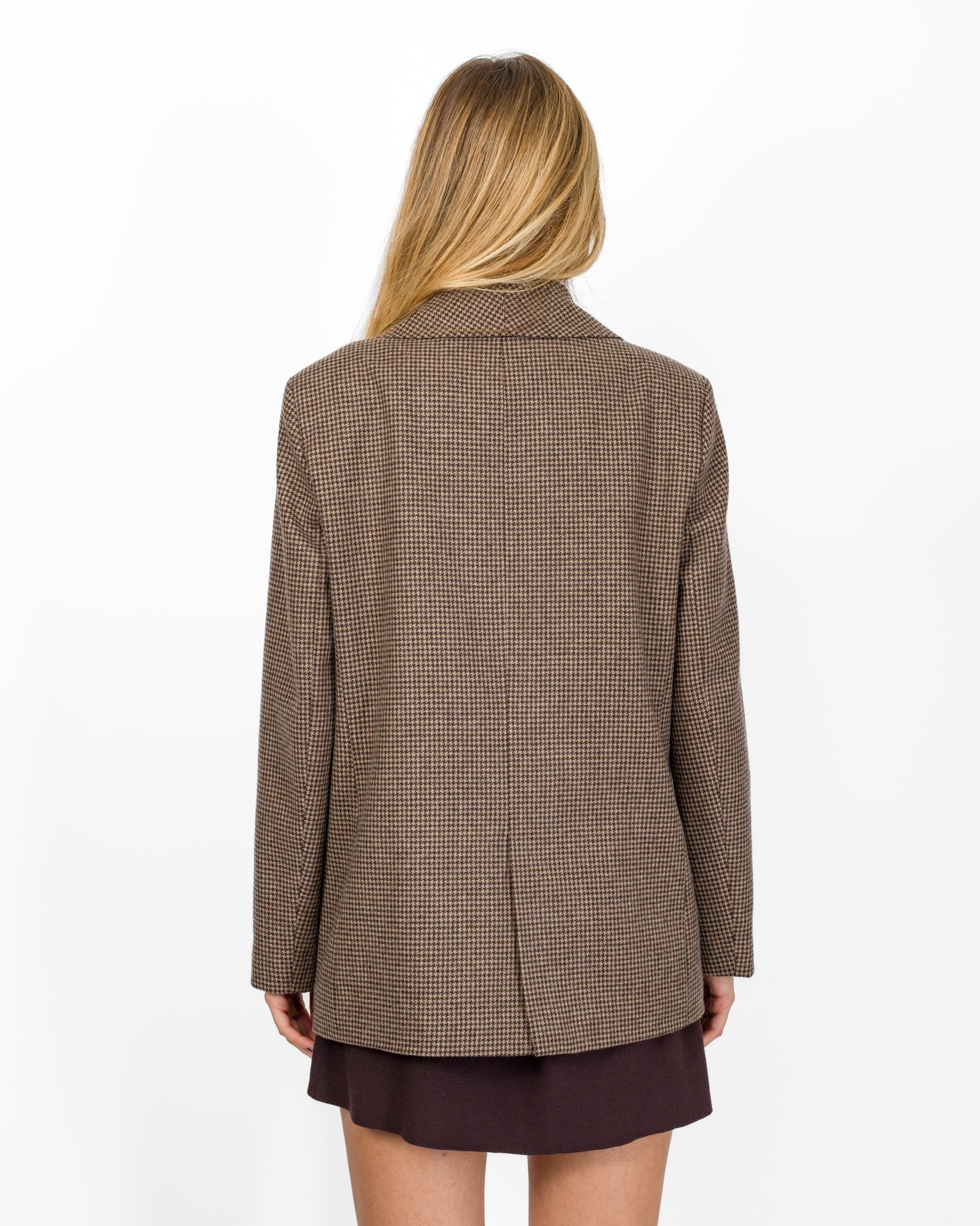 Il blazer della collezione autunno/inverno di Dixie presenta una trama micro pied de poule nei toni caldi del marrone, fit regolare e linea leggermente morbida. Il rever ampiamente sciallato crea un effetto fluido e femminile, mentre la chiusura monopetto mantiene un’estetica pulita. Le tasche a filo si integrano nella struttura ed il dettaglio delle spille gioiello aggiunge un accento luminoso e ricercato.