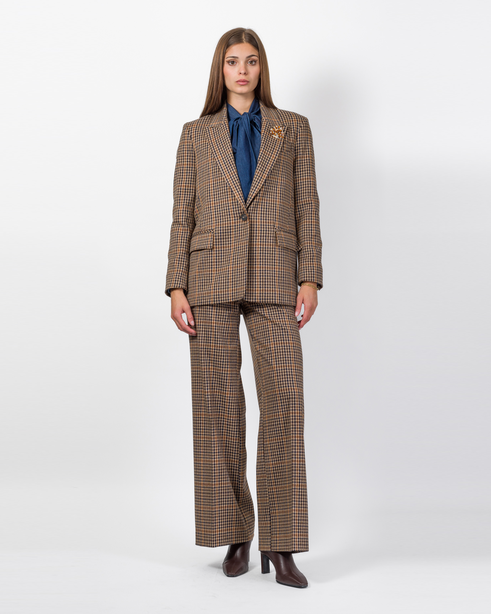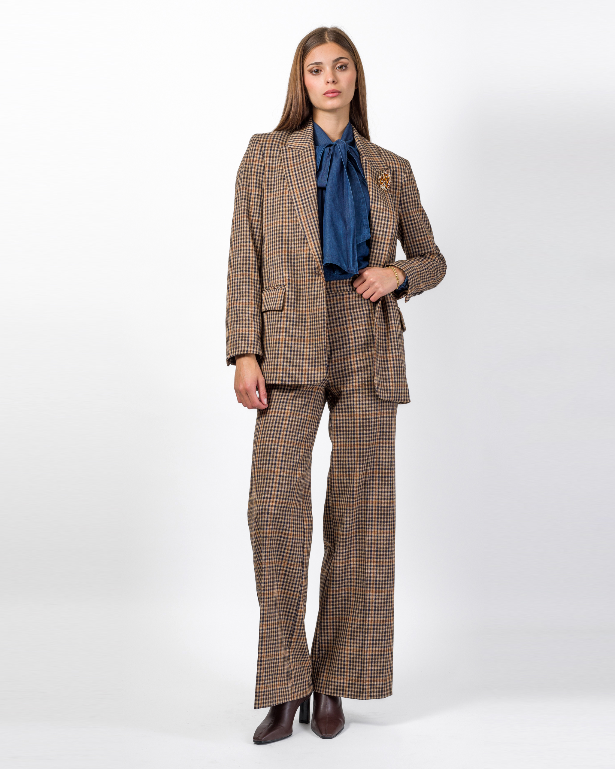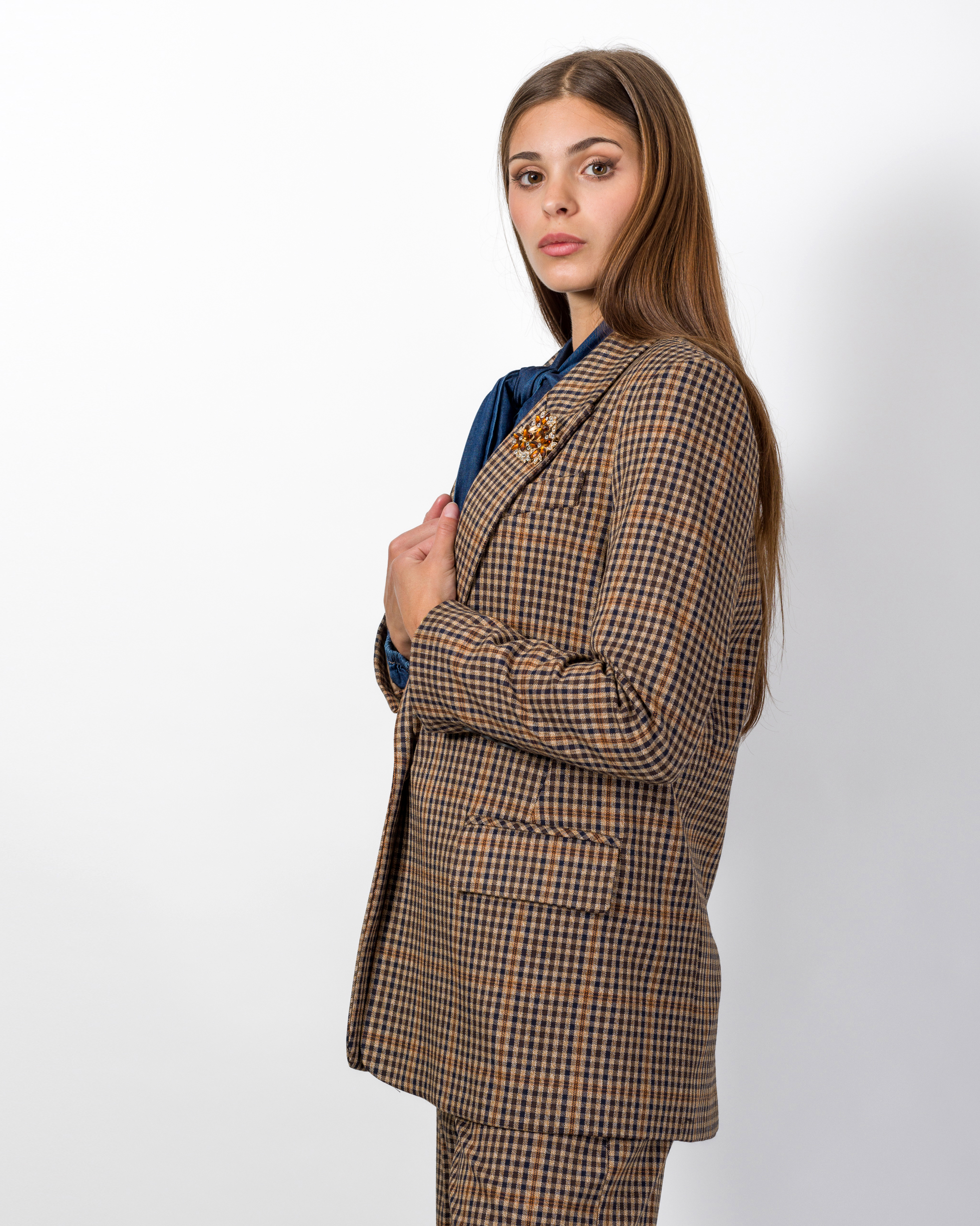 Parte di un tailleur con pantalone coordinato, è perfetto come blazer sartoriale per l’ufficio o come giacca a quadri casual-chic per outfit versatili e moderni.