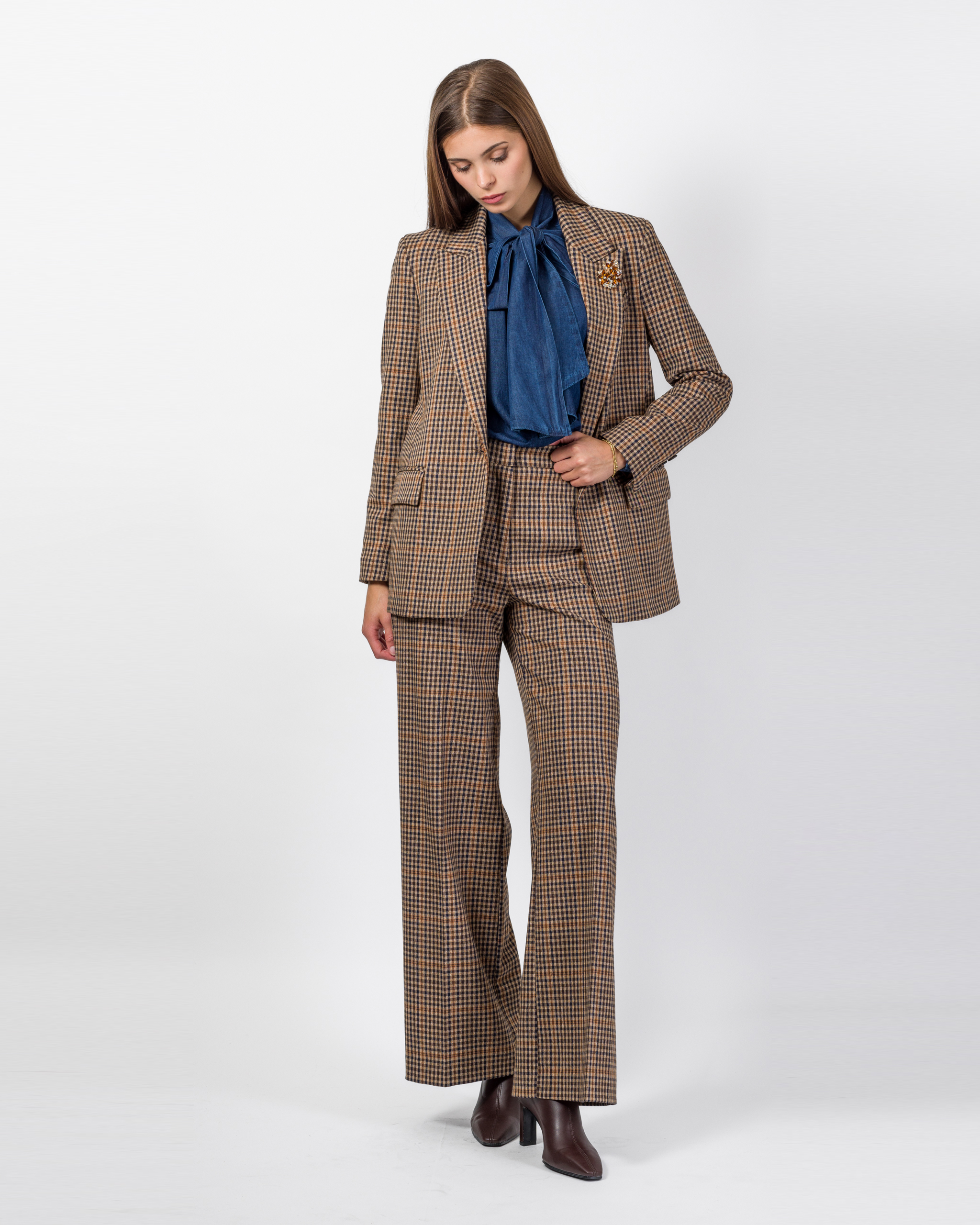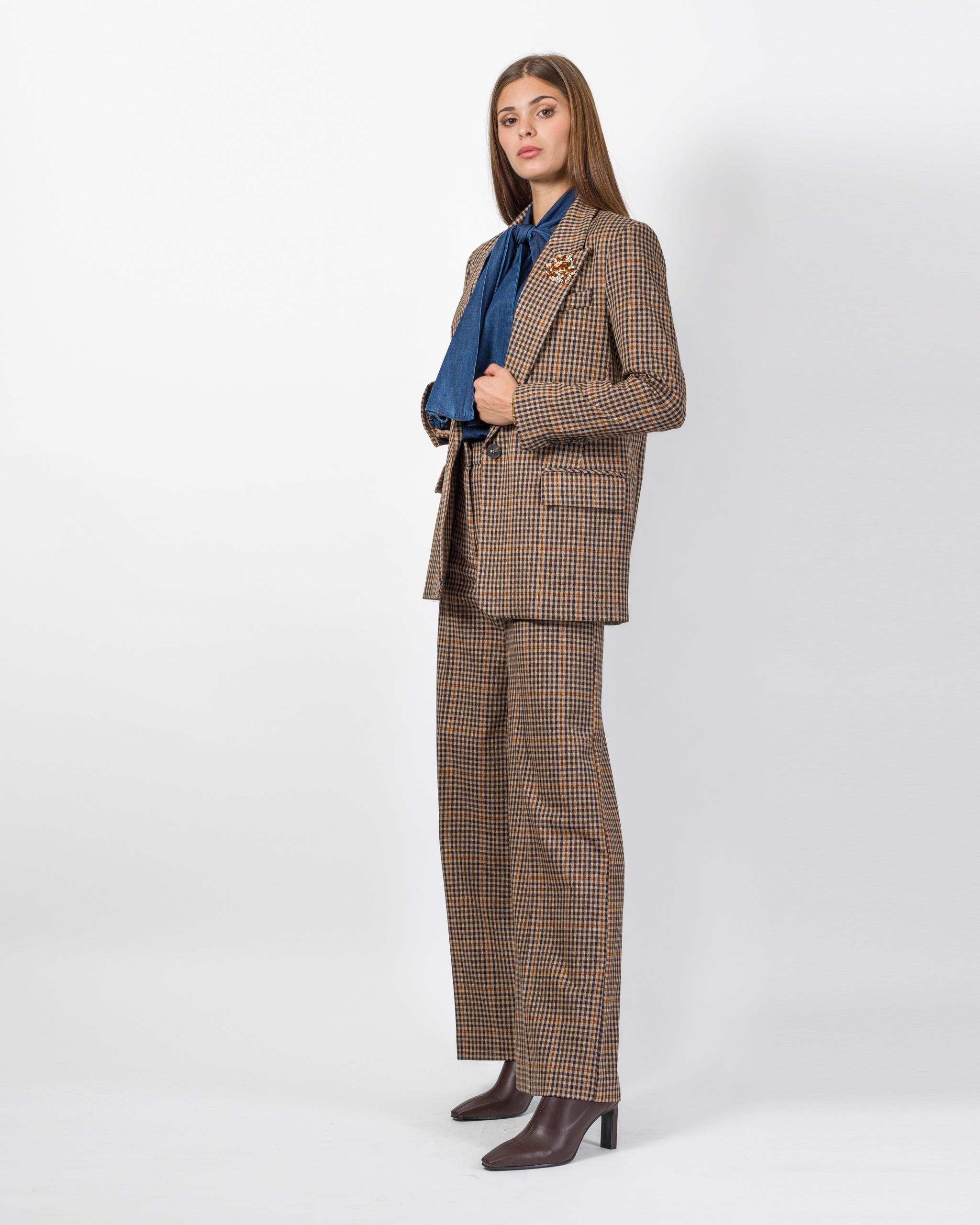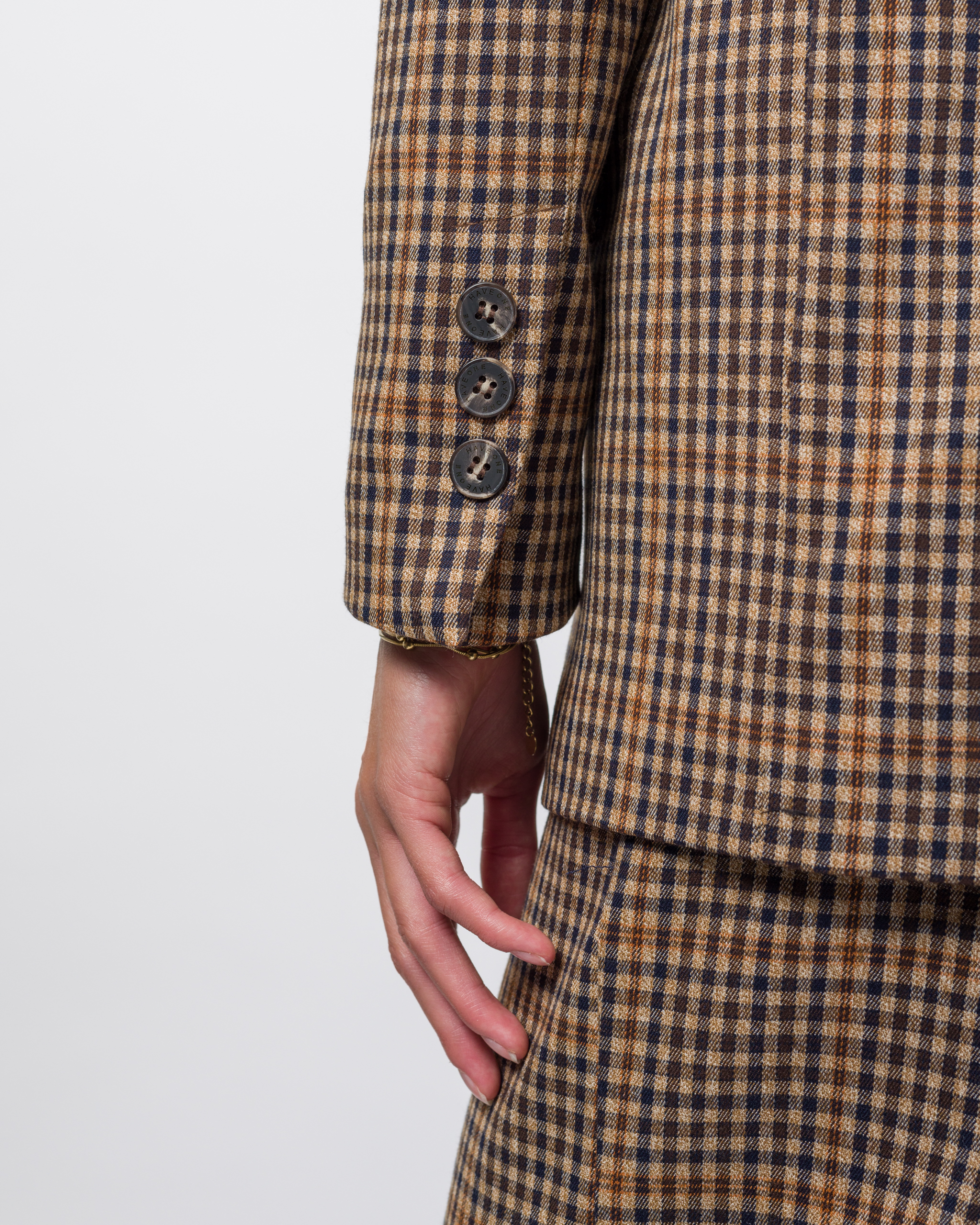 Parte di un tailleur con pantalone coordinato, è perfetto come blazer sartoriale per l’ufficio o come giacca a quadri casual-chic per outfit versatili e moderni.