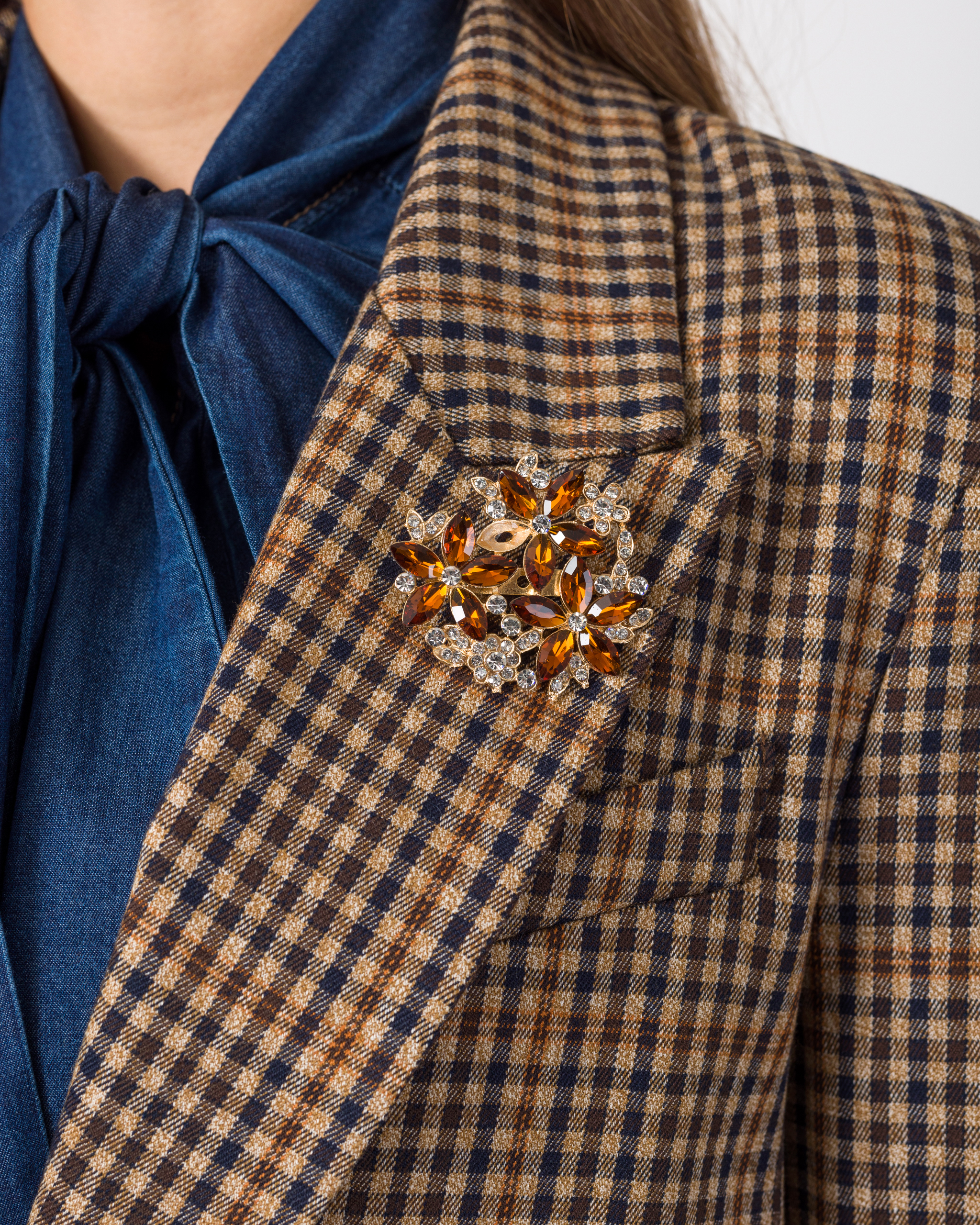 Il blazer monopetto della collezione autunno/inverno di Haveone è caratterizzato dalla stampa vichy e presenta fit oversize, rever classico, dettaglio di spilla gioiello, tasche a patta anteriori e spacco centrale posteriore.