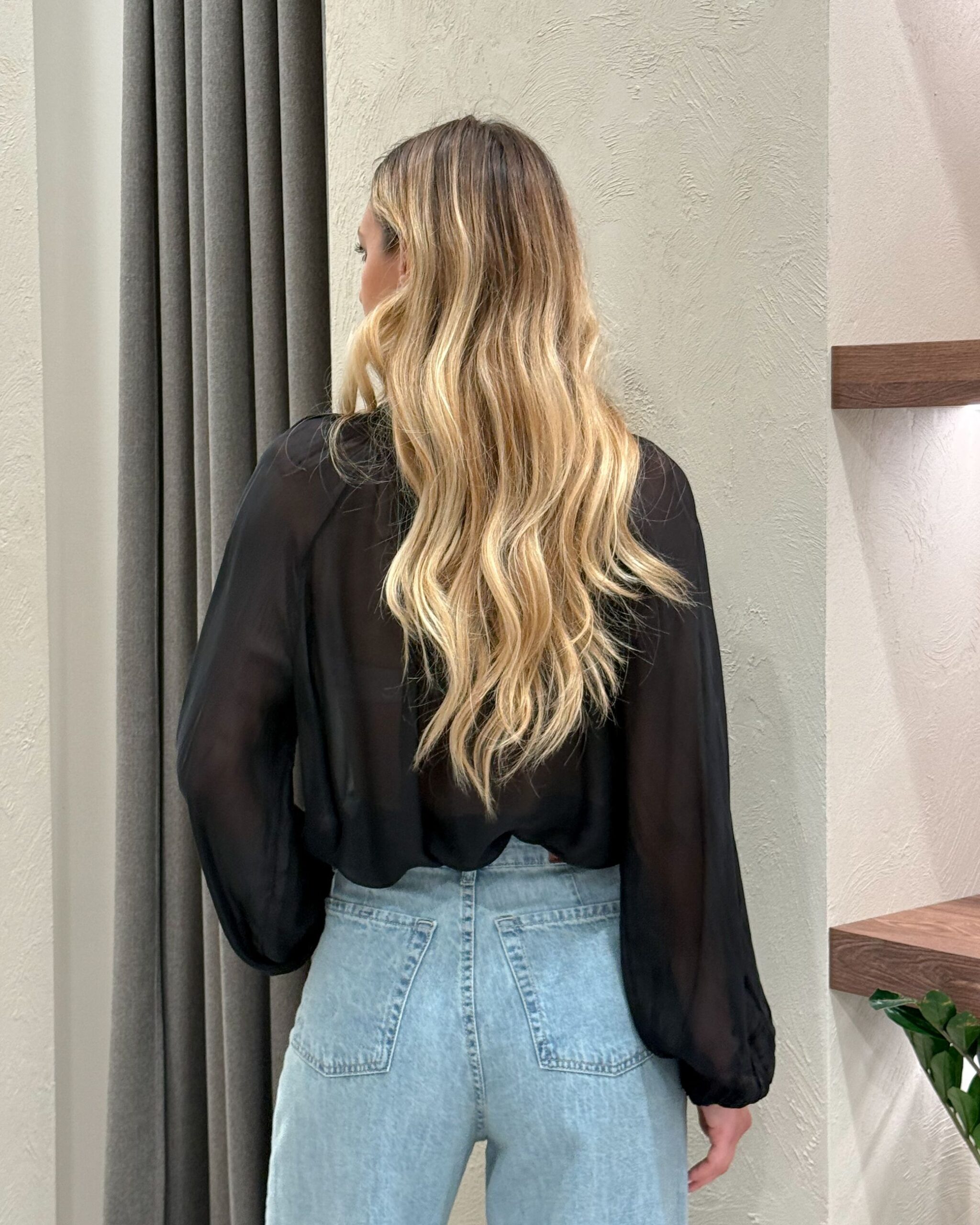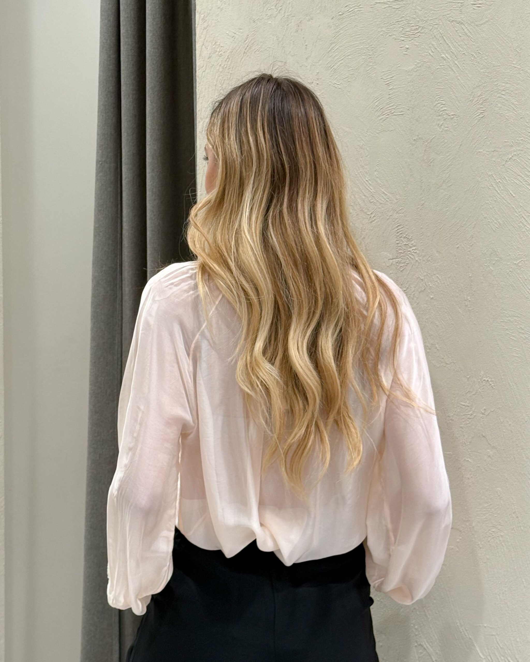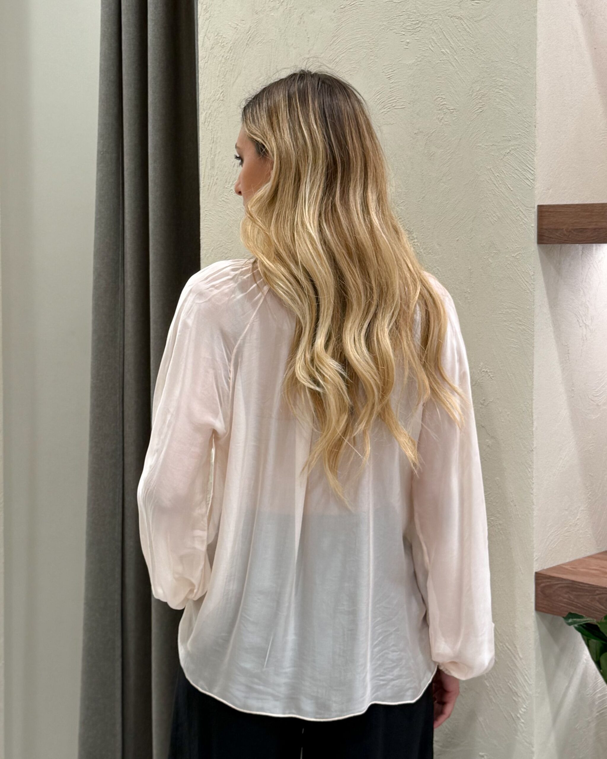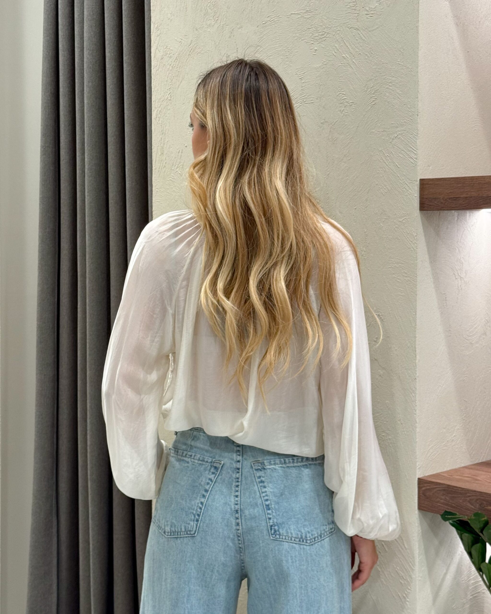Il tessuto leggero e setoso accarezza la silhouette con naturalezza, rendendo questa blusa ideale sia per outfit eleganti che per abbinamenti più casual chic. Perfetta da indossare sotto blazer strutturati o da sola.