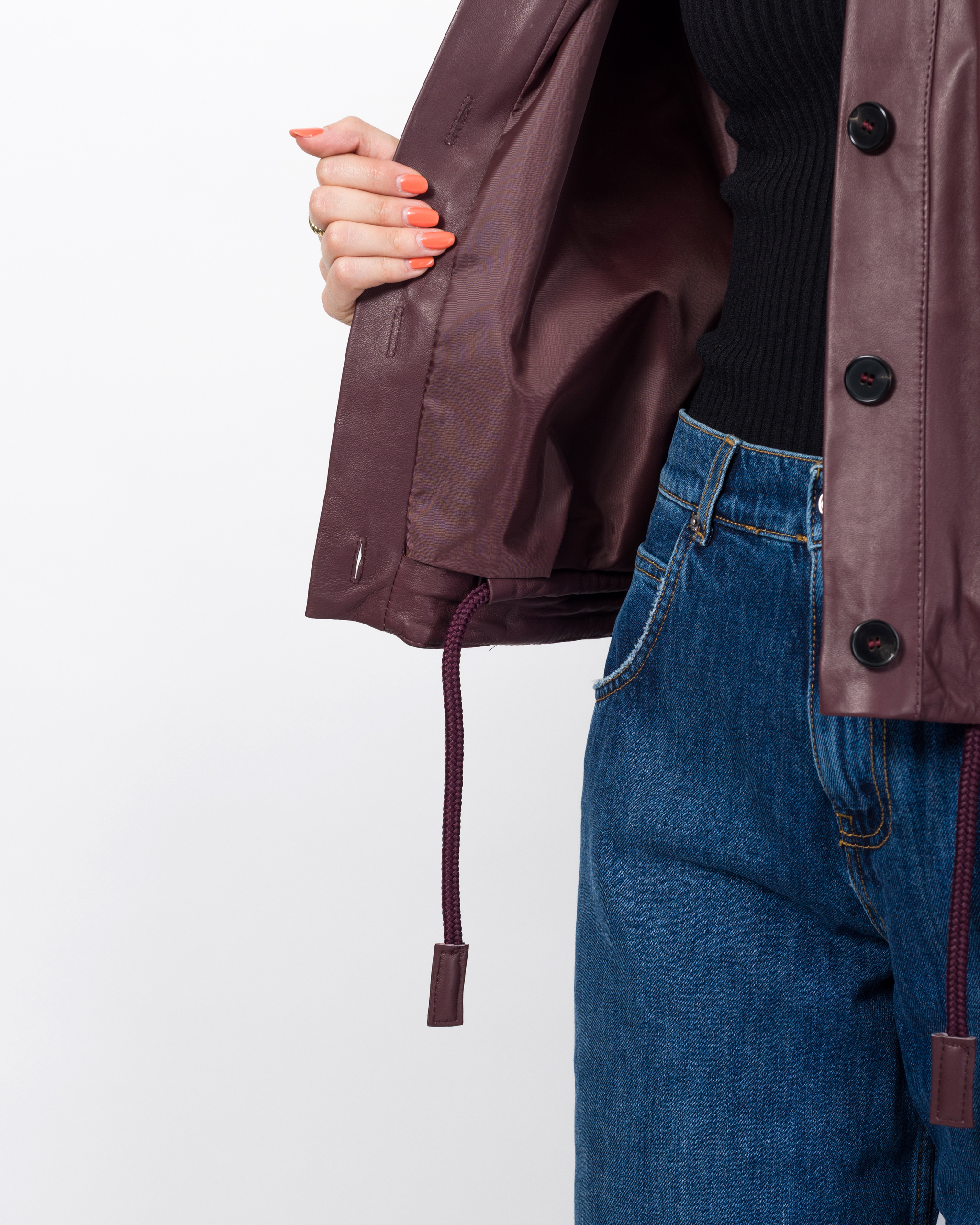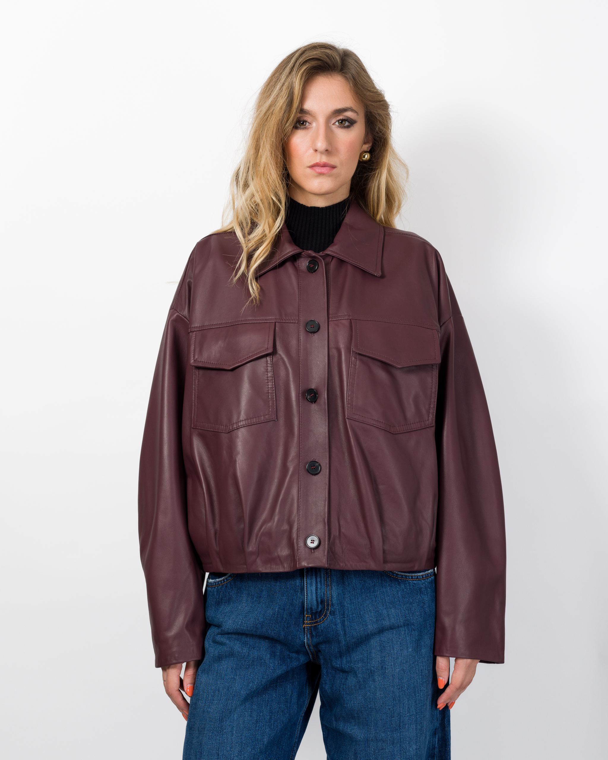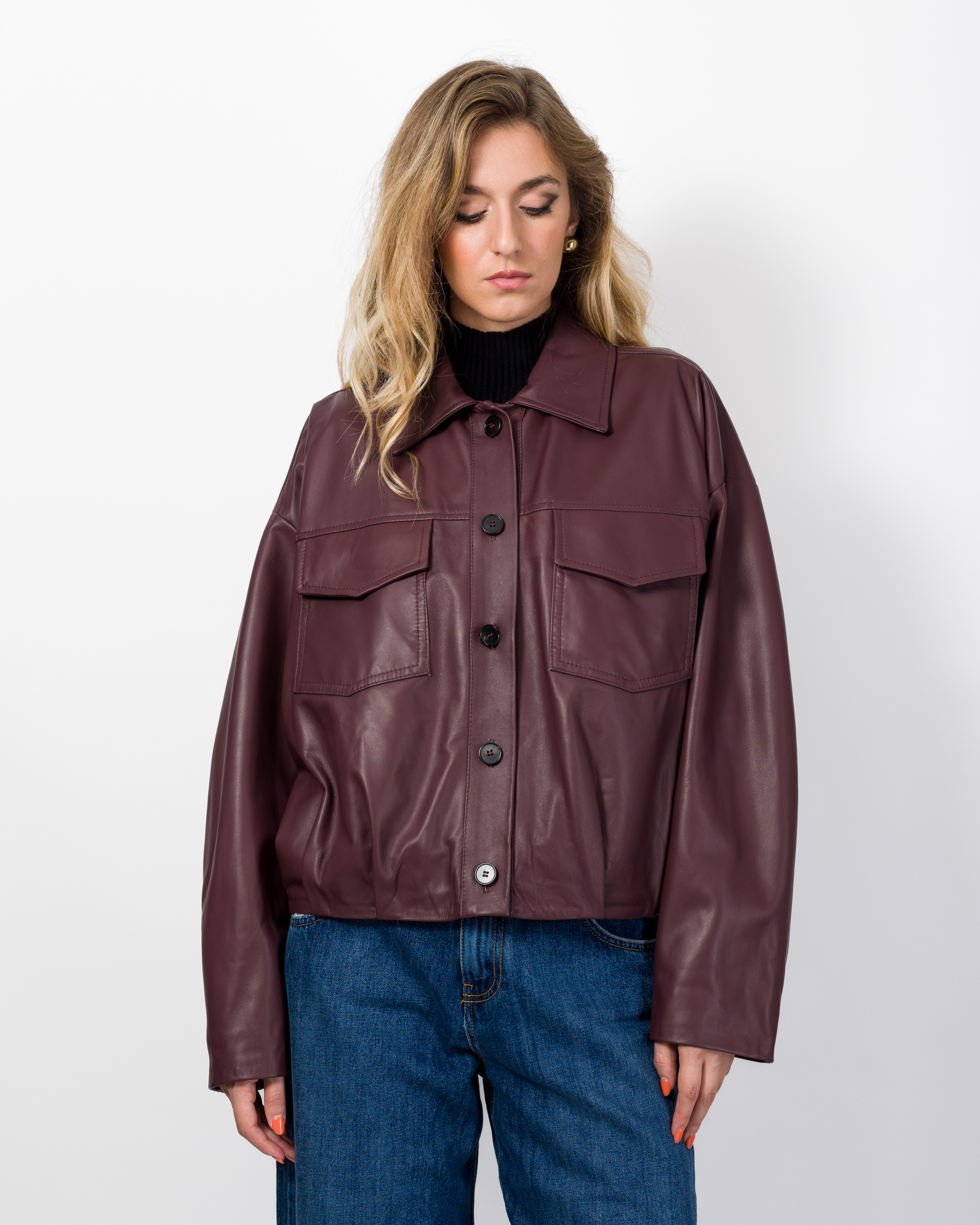 Il bomber in vera pelle della collezione autunno/inverno di Vicolo è caratterizzato dal design oversize e presenta colletto, chiusura frontale con bottoni, tasche a patta ed arriccio sul fondo con laccio passante.