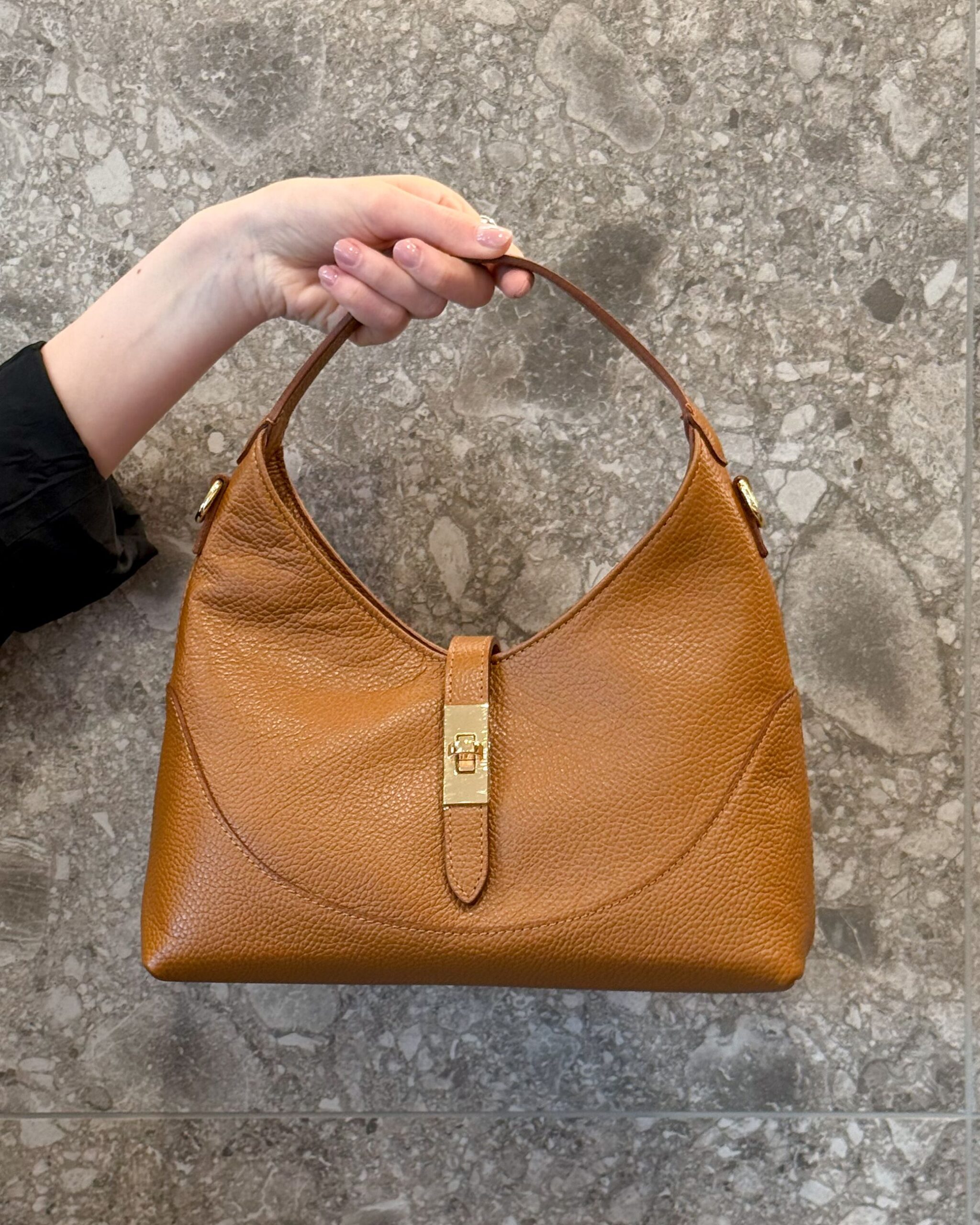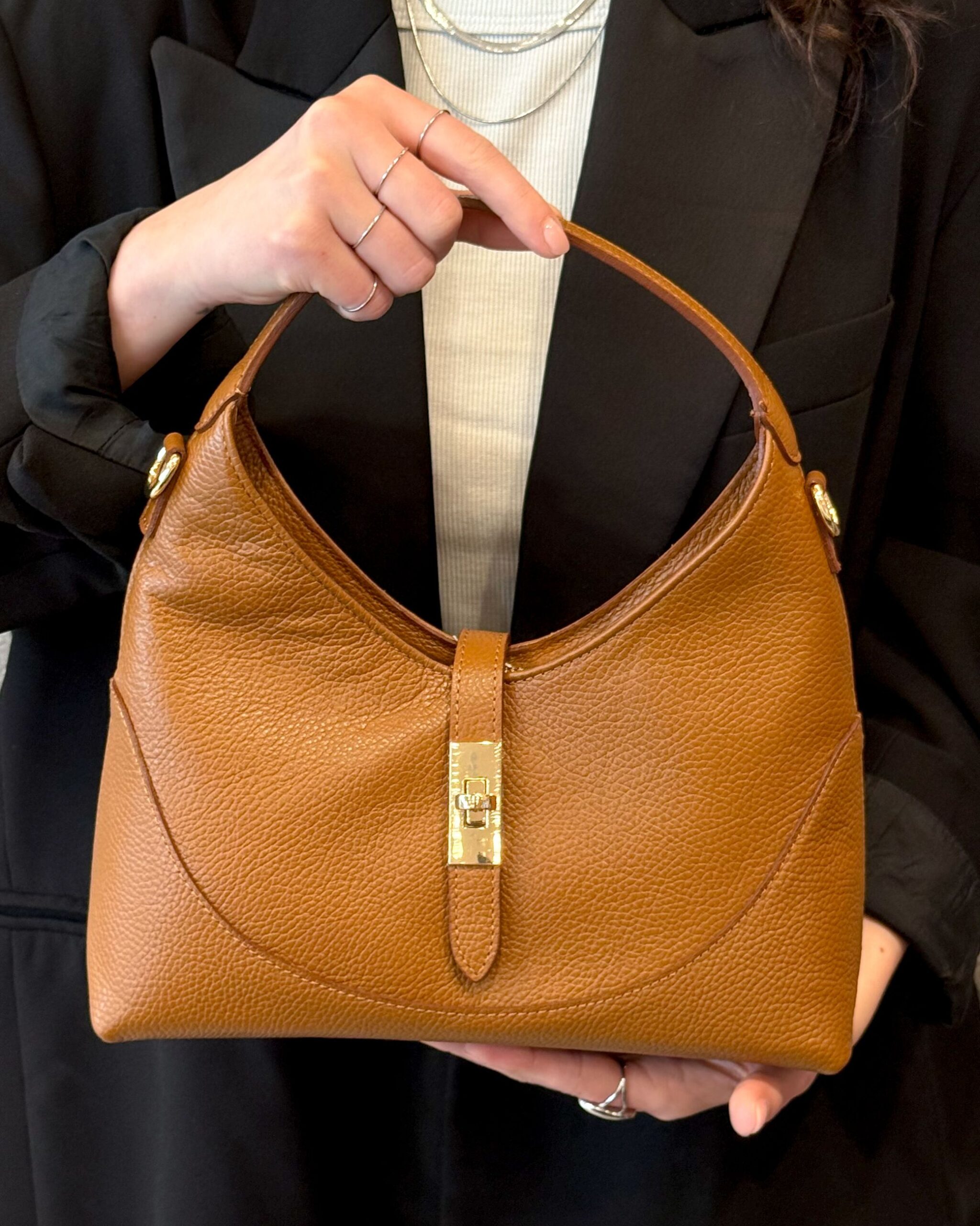 La borsa della collezione primavera/estate di Mirror è caratterizzata da una silhouette hobo strutturata a mezzaluna, con linee eleganti e femminili dal fascino senza tempo. Presenta manico singolo a spalla e distintiva chiusura frontale con hardware dorato che valorizza il design con un dettaglio luminoso e ricercato. Tracolla in dotazione.