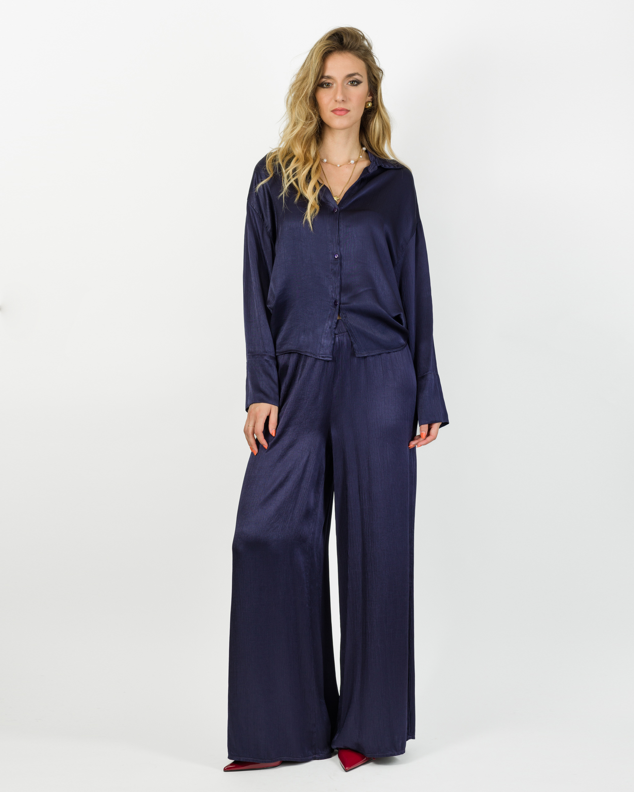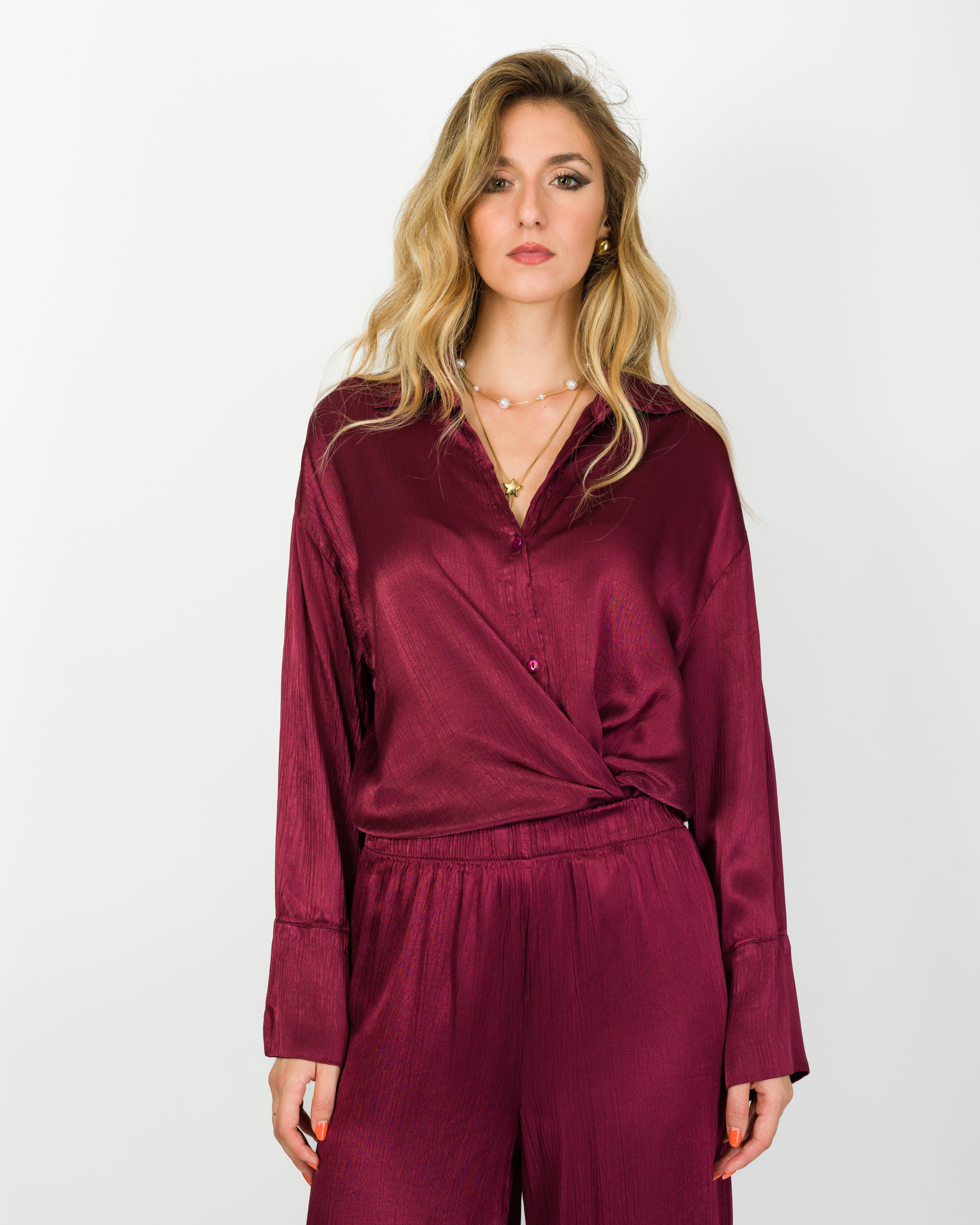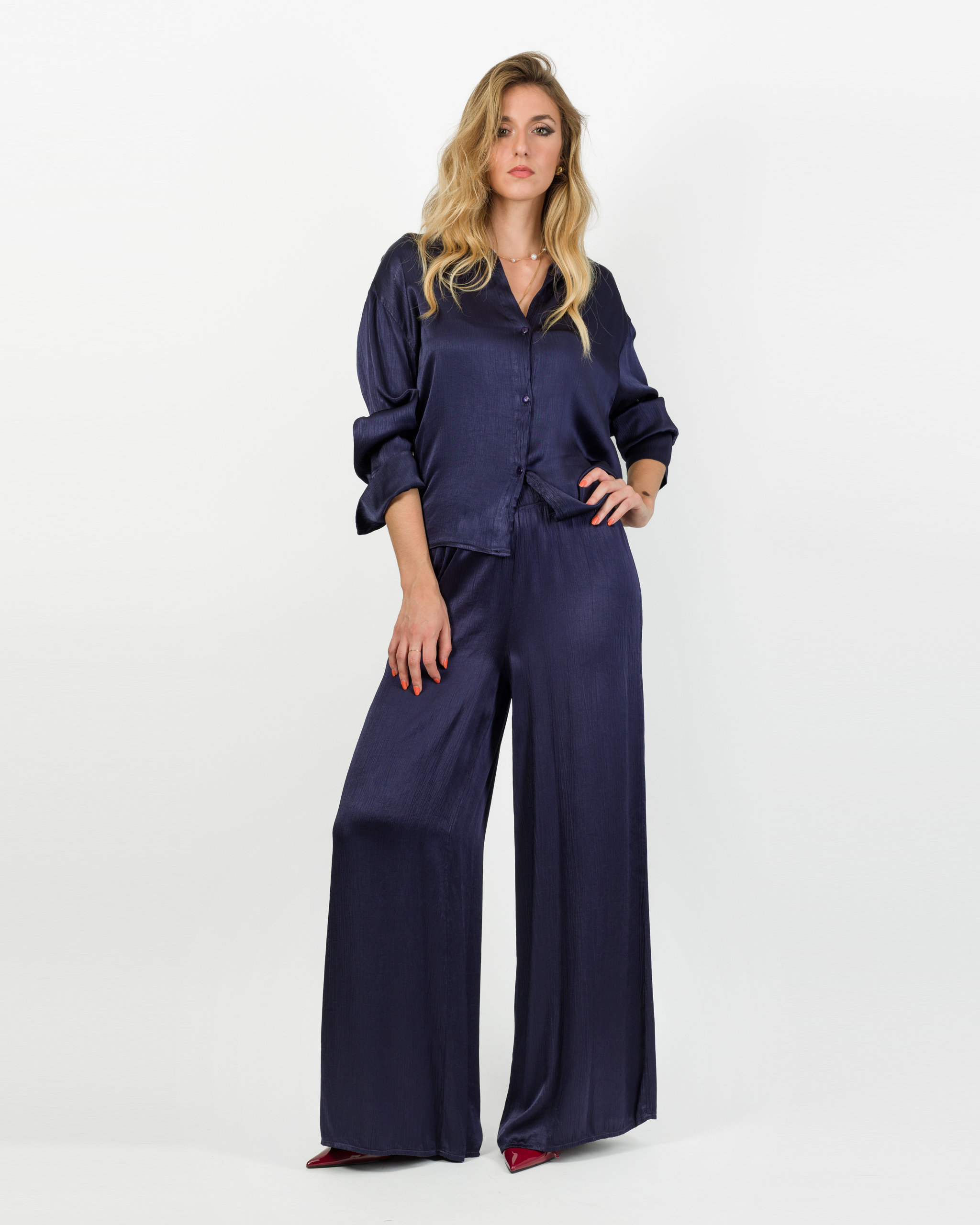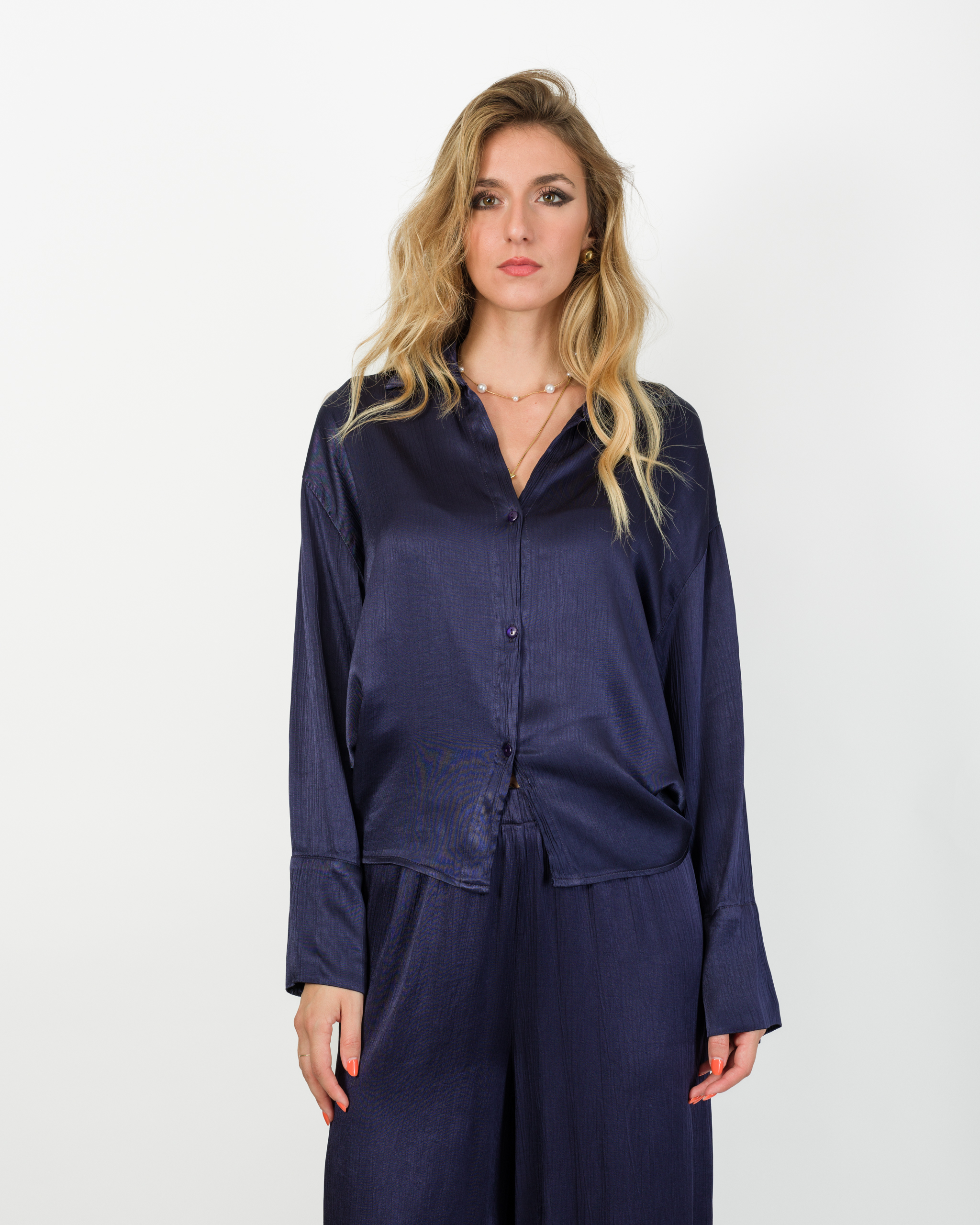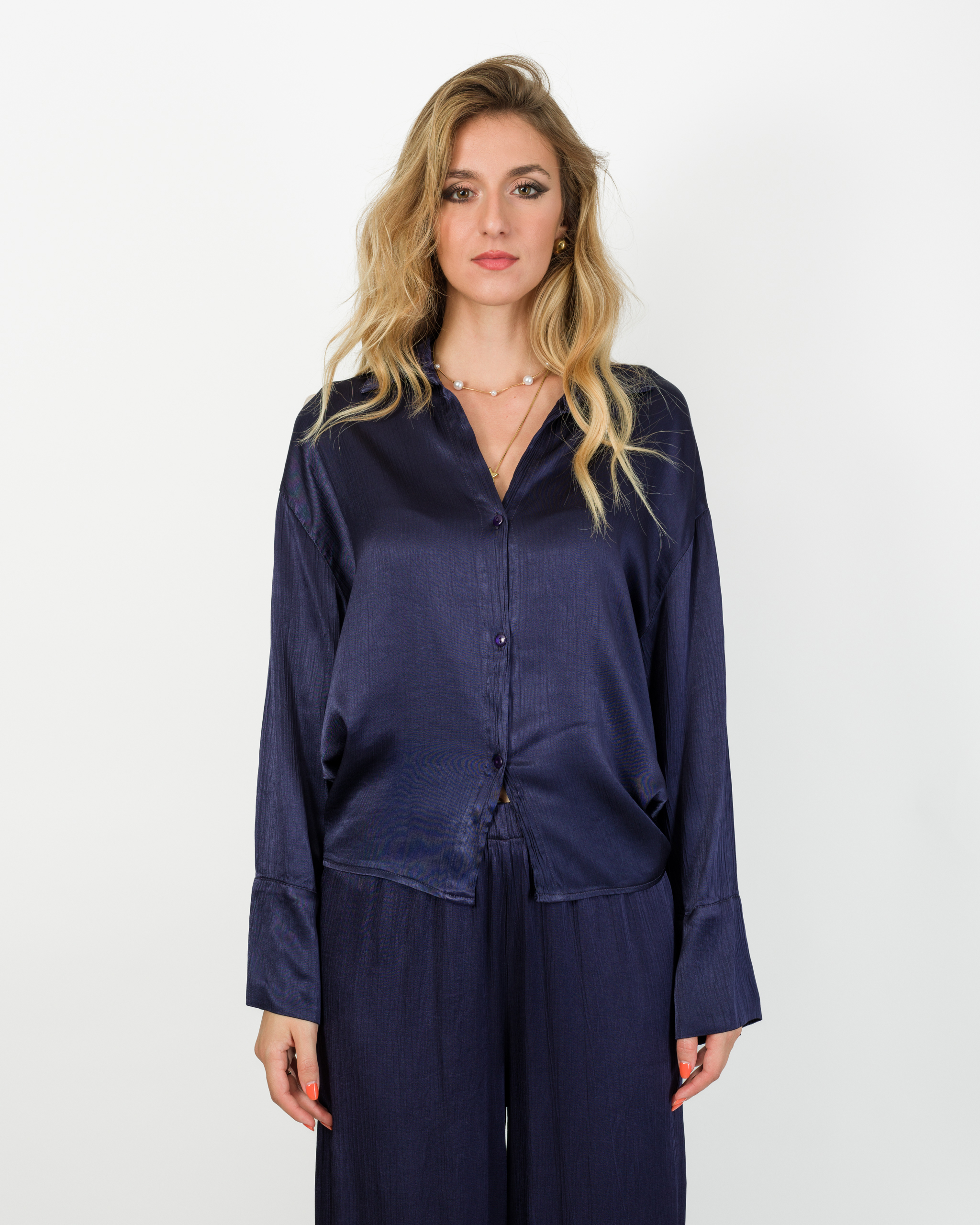 Camicia che, in coordinato con al suo pantalone, veste la femminilità con leggerezza e carattere in ogni occasione.