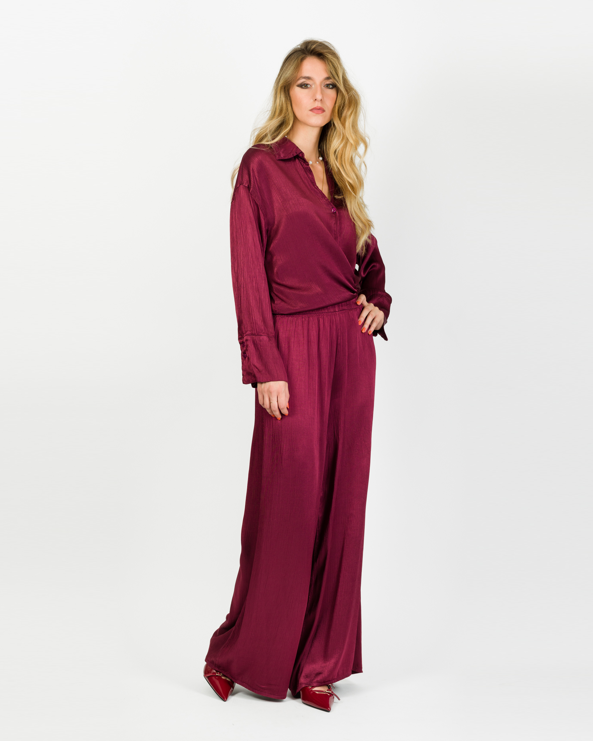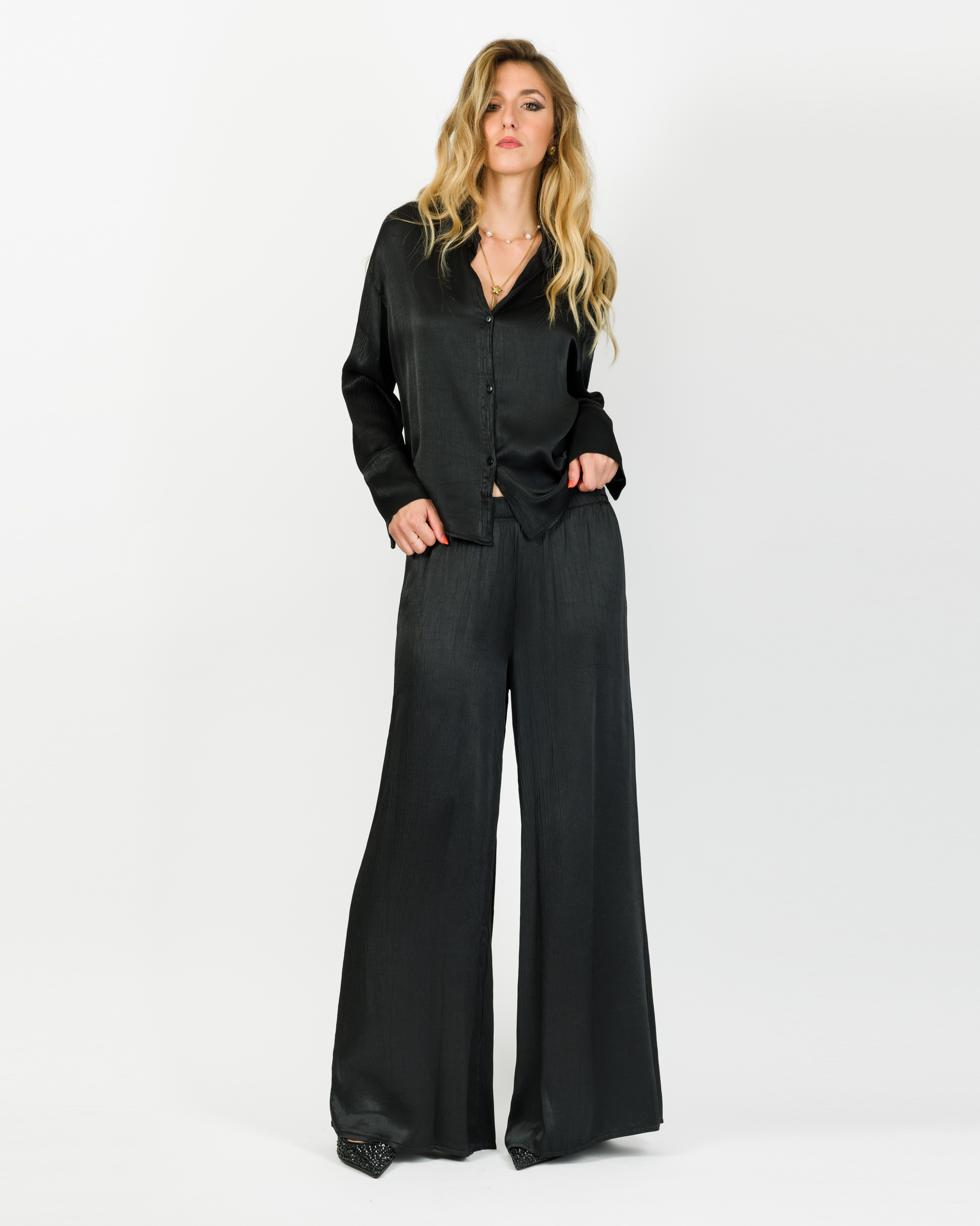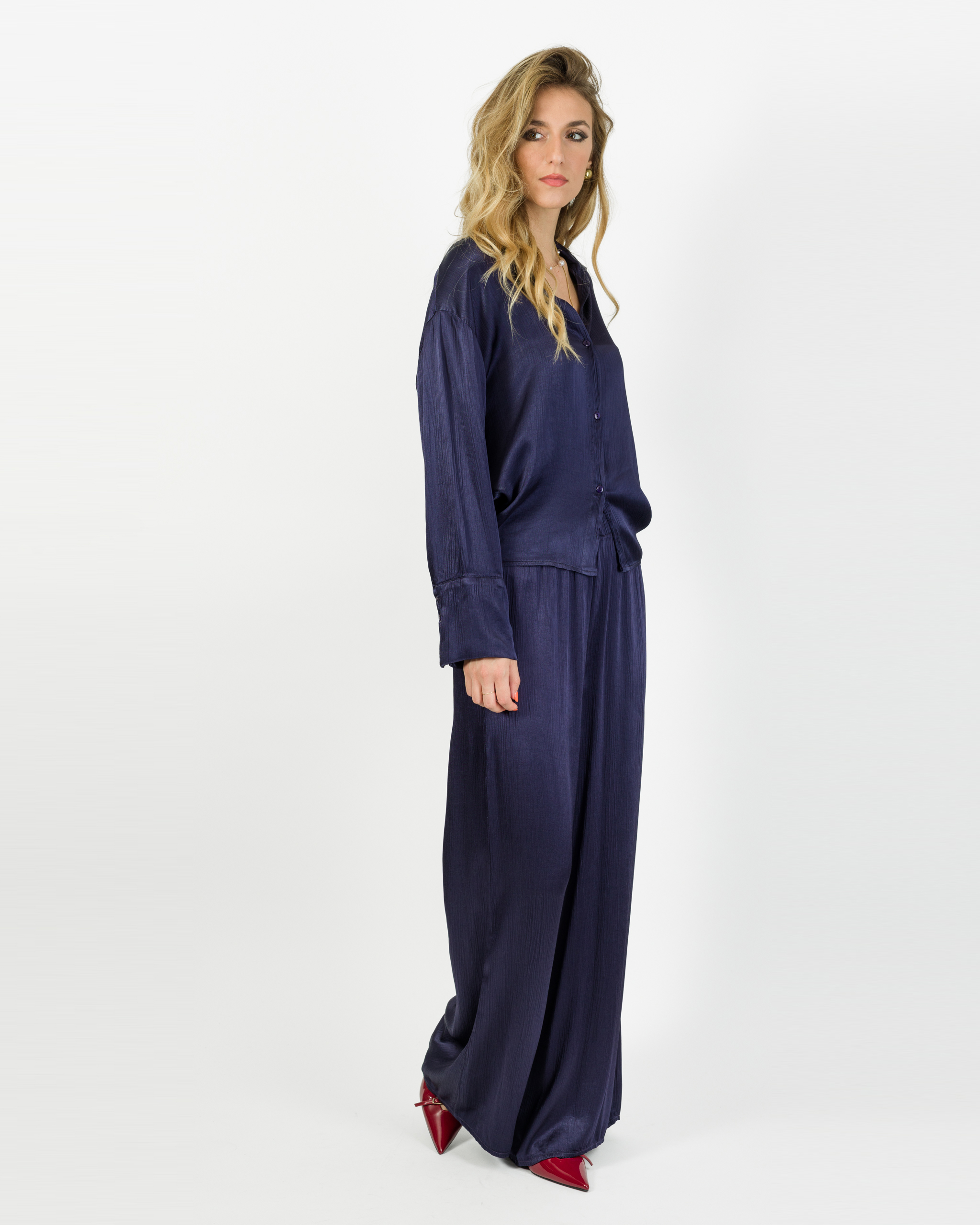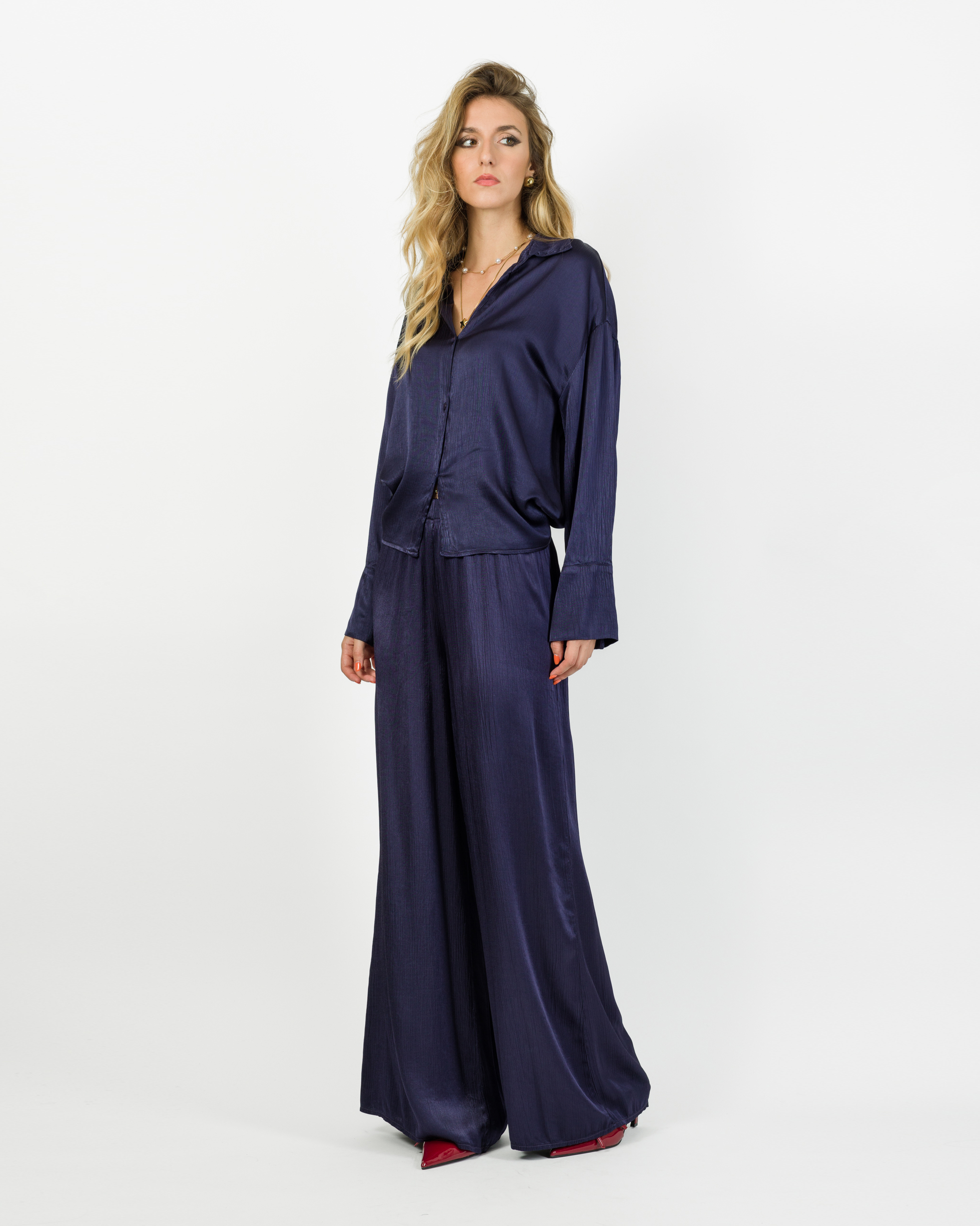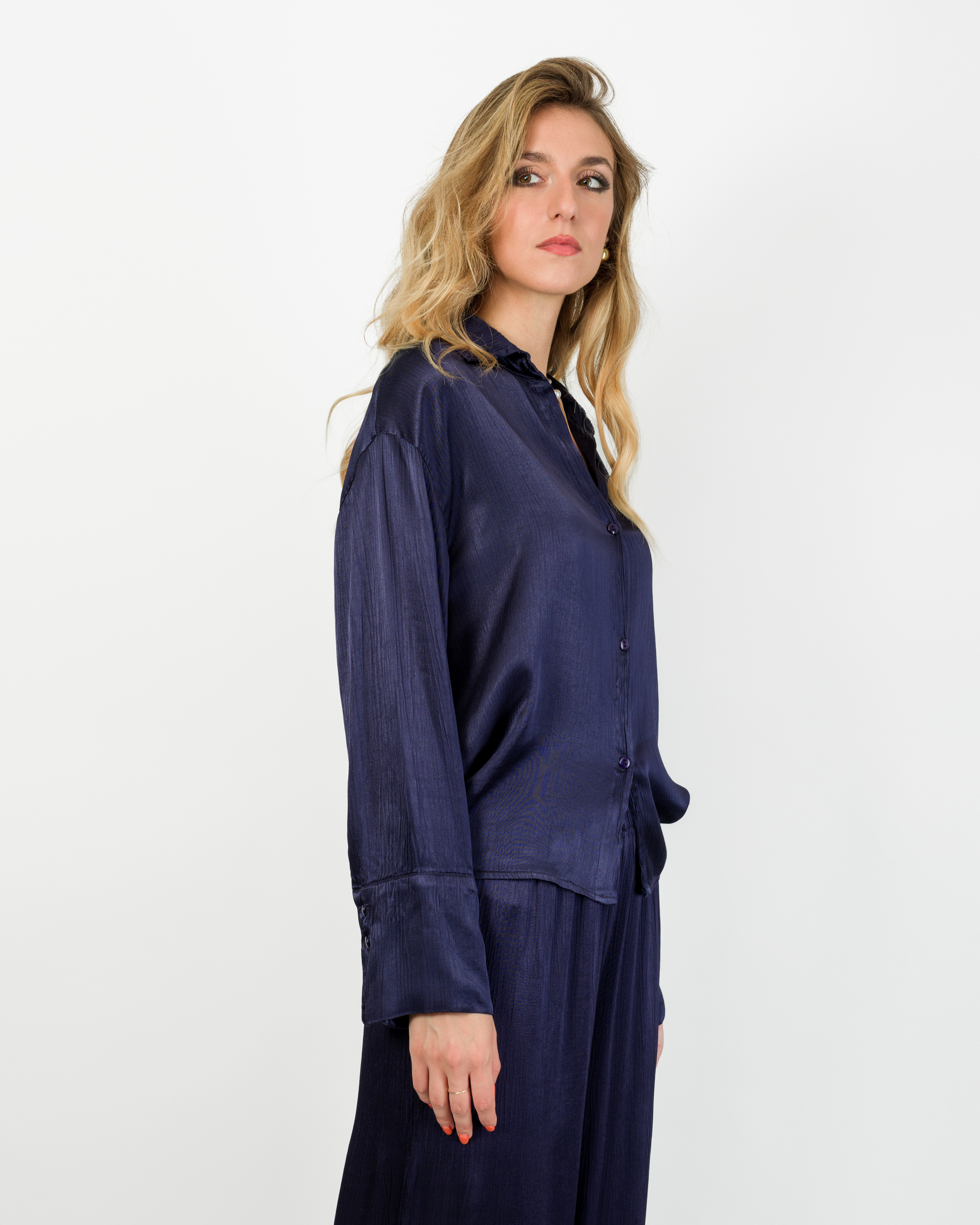Camicia che, in coordinato con al suo pantalone, veste la femminilità con leggerezza e carattere in ogni occasione.