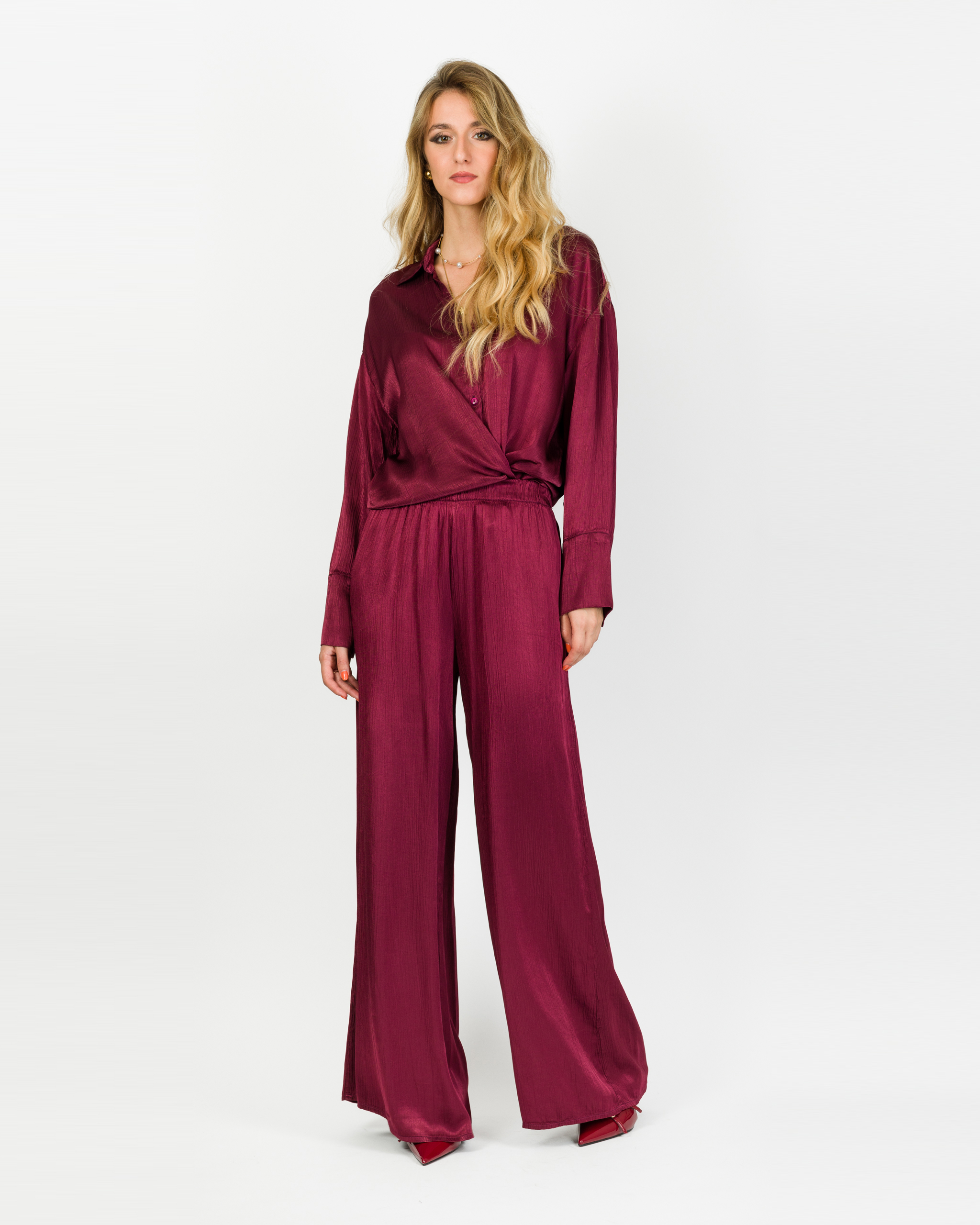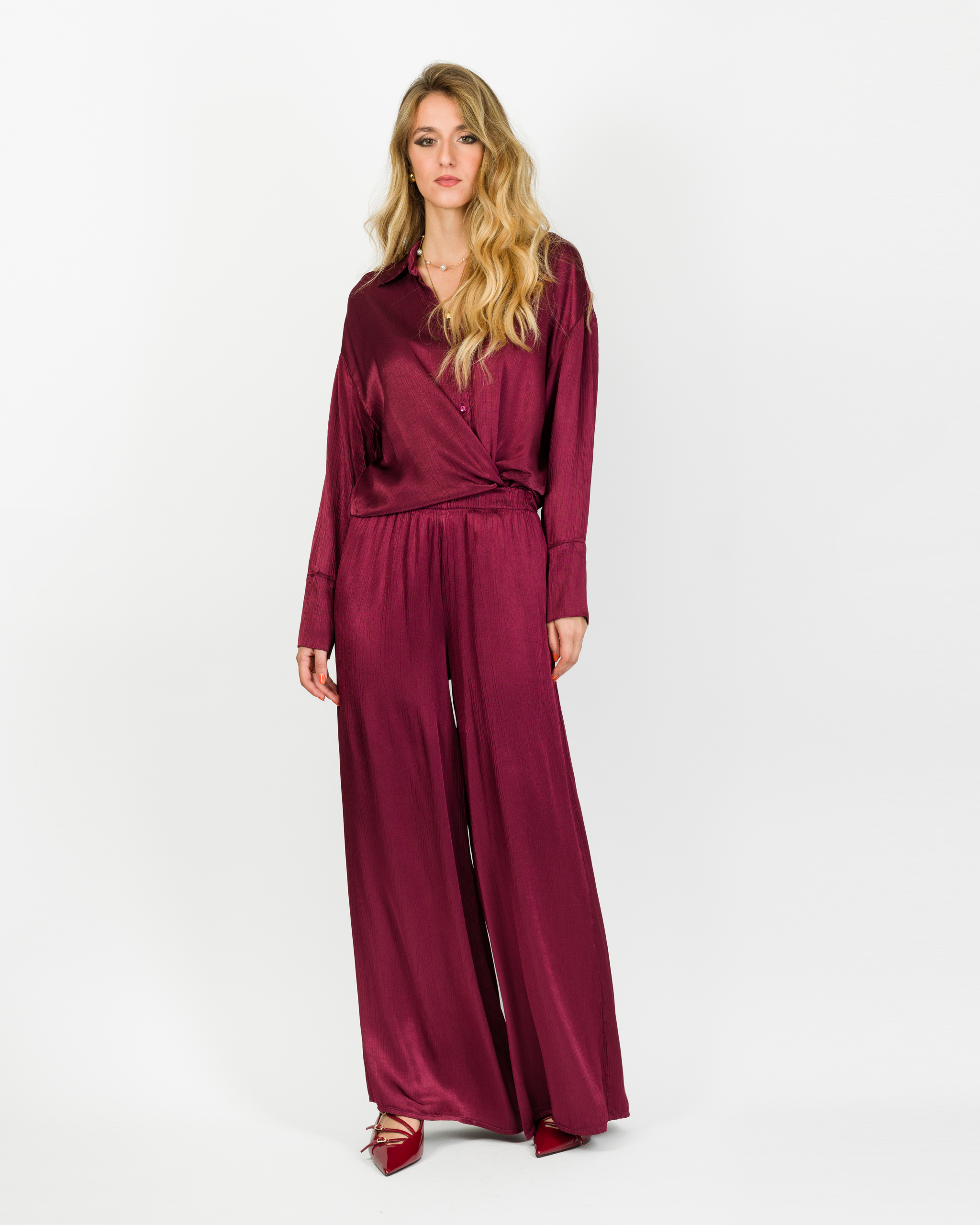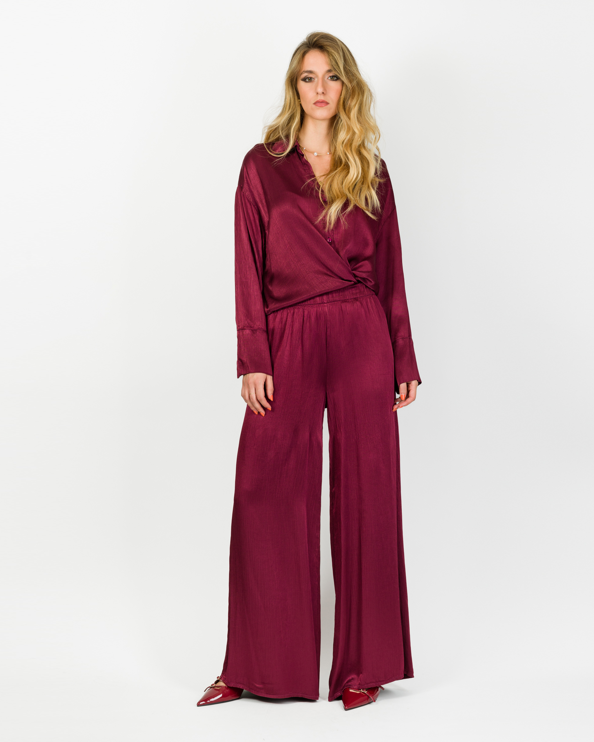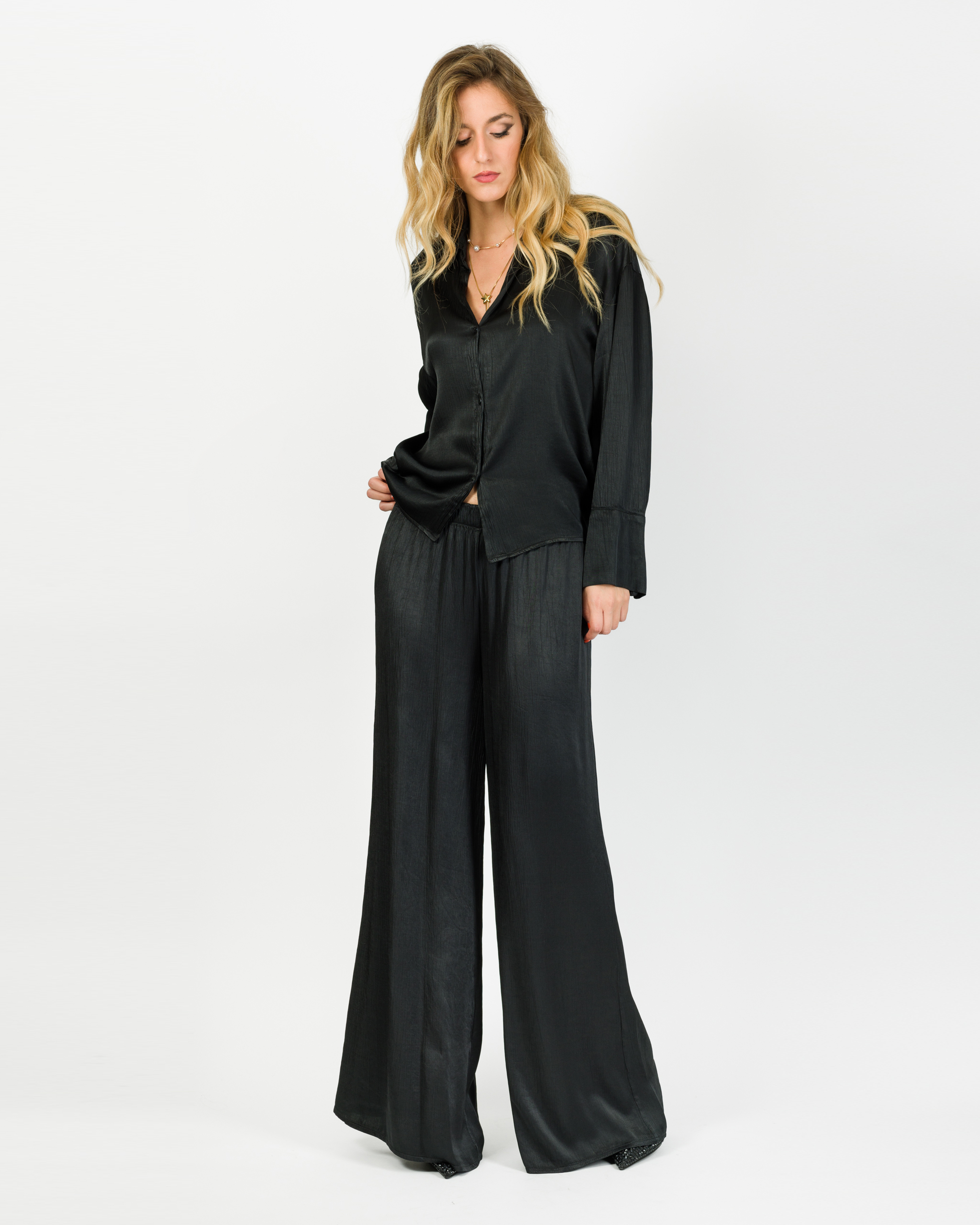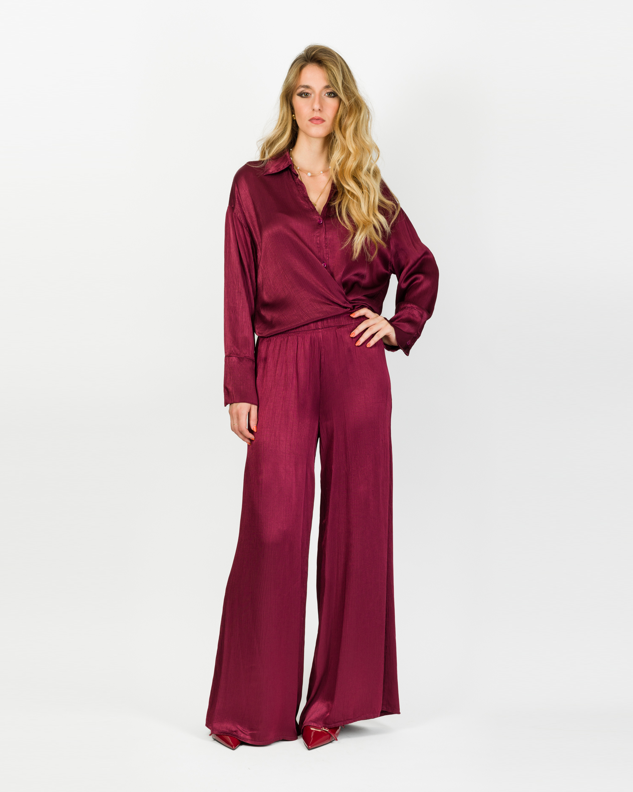 Camicia che, in coordinato con al suo pantalone, veste la femminilità con leggerezza e carattere in ogni occasione.
