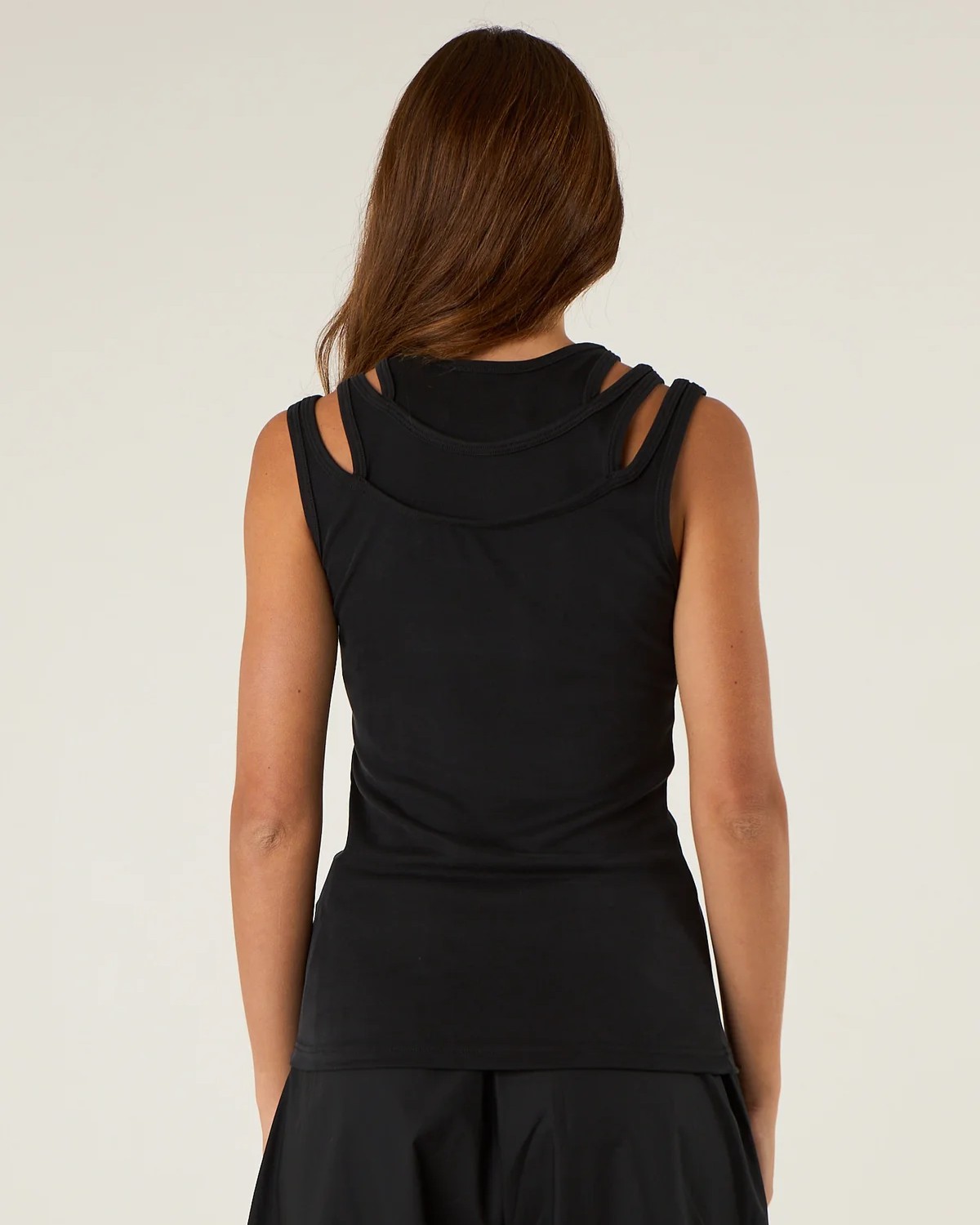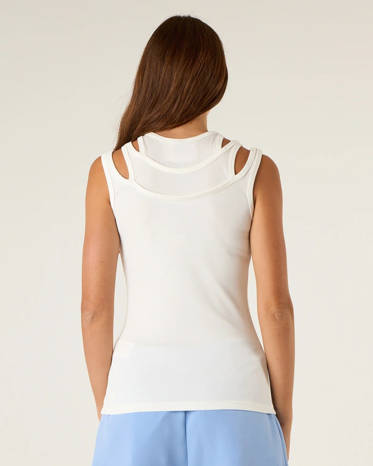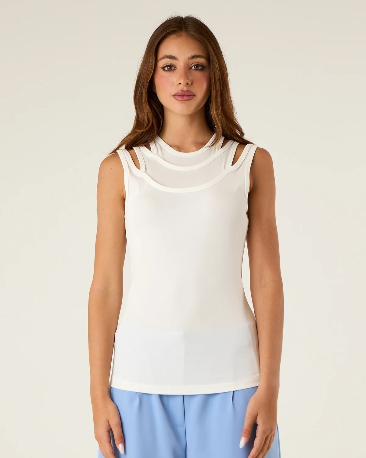 La canotta della collezione primavera/estate di Kostumn°1 si distingue per il design innovativo con triplo scollo stratificato, che dona profondità e carattere alla parte superiore del capo. La linea pulita e aderente accompagna il corpo con naturalezza, mentre il tessuto leggero garantisce comfort e vestibilità impeccabile.