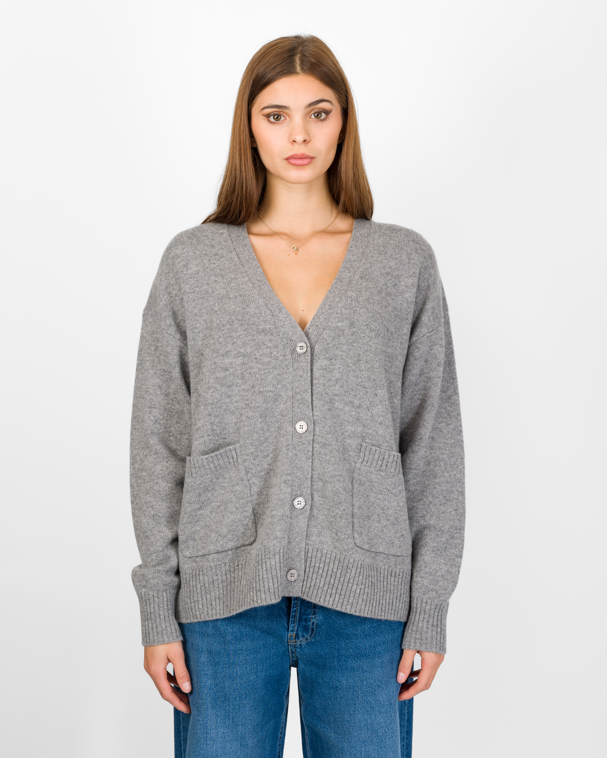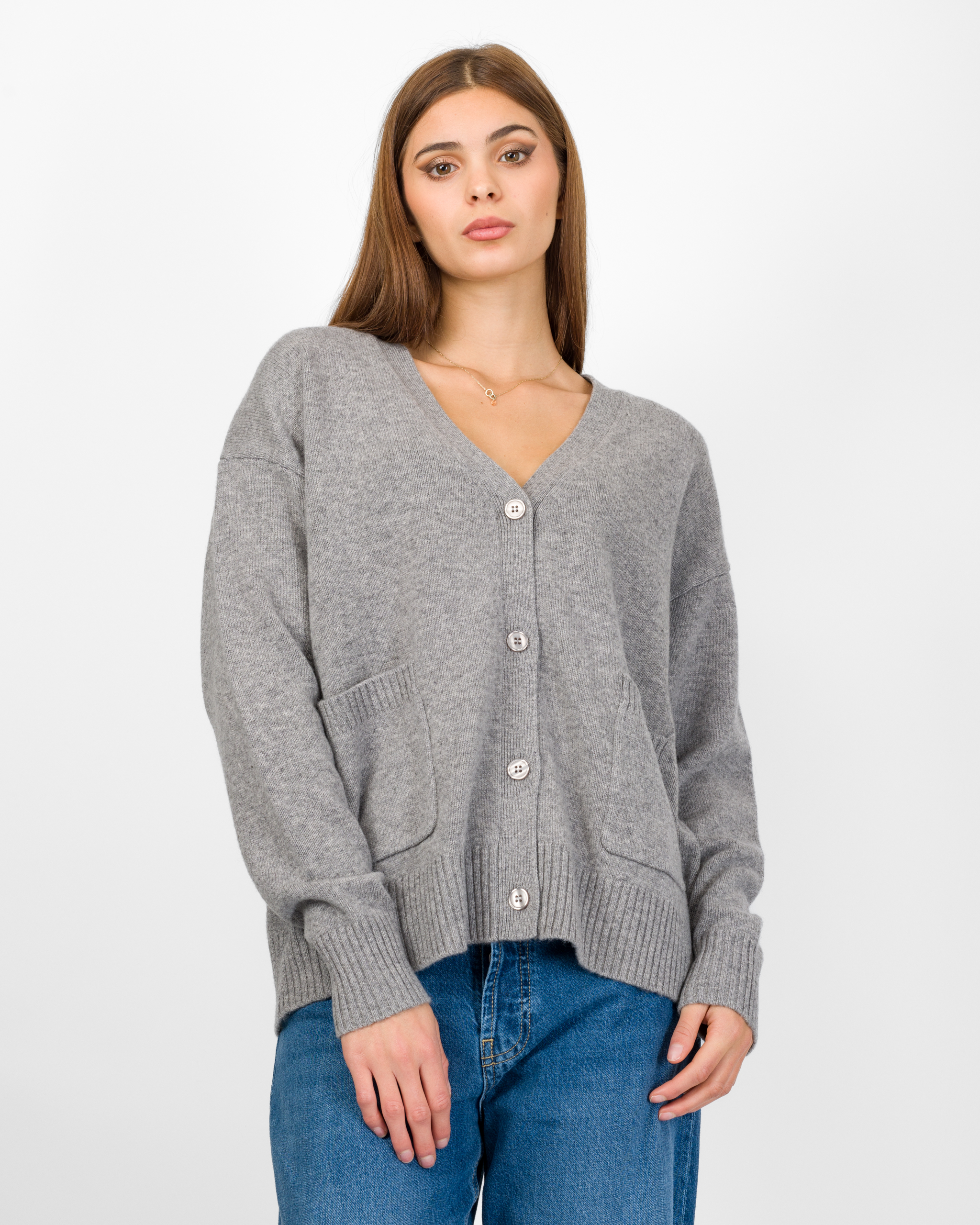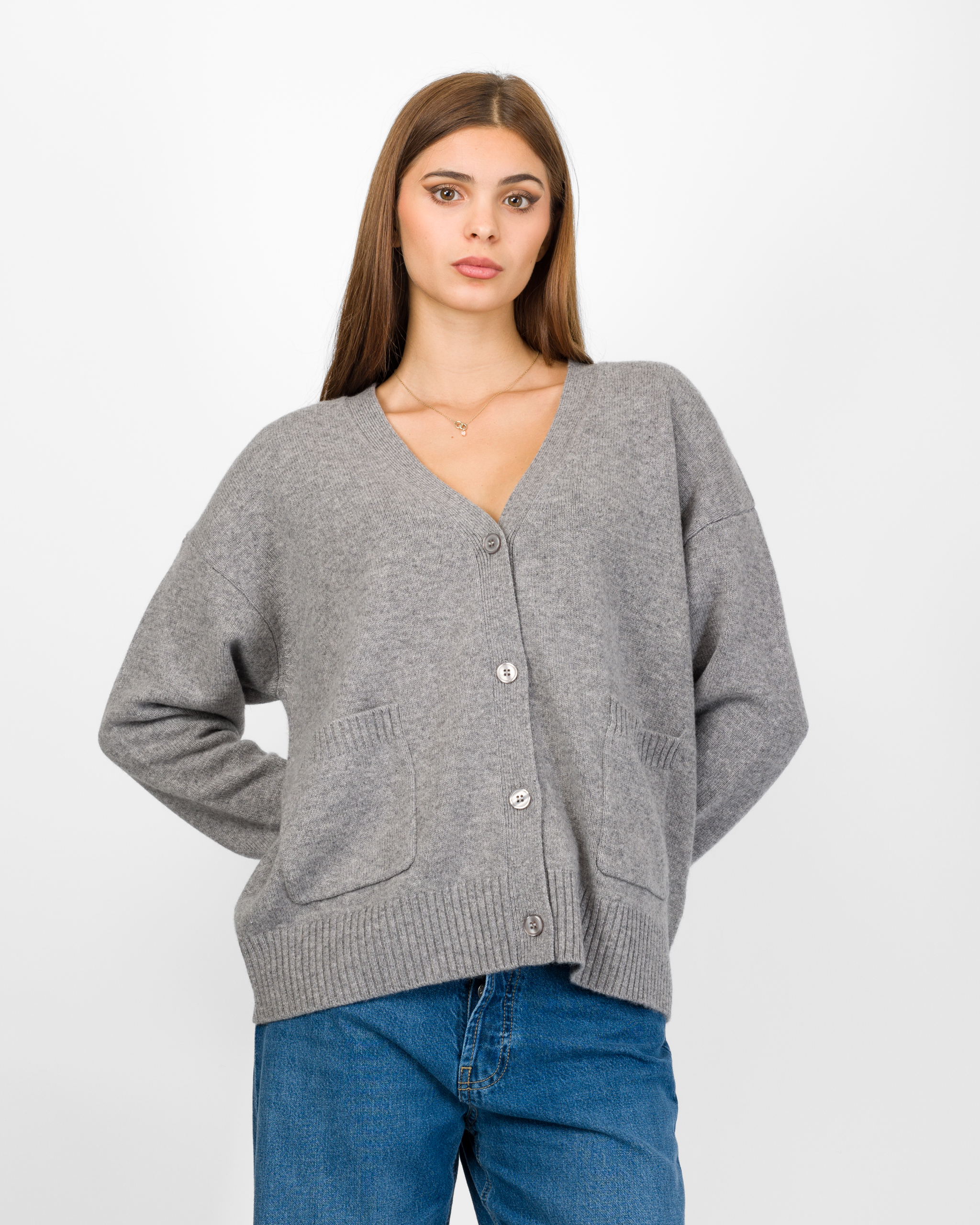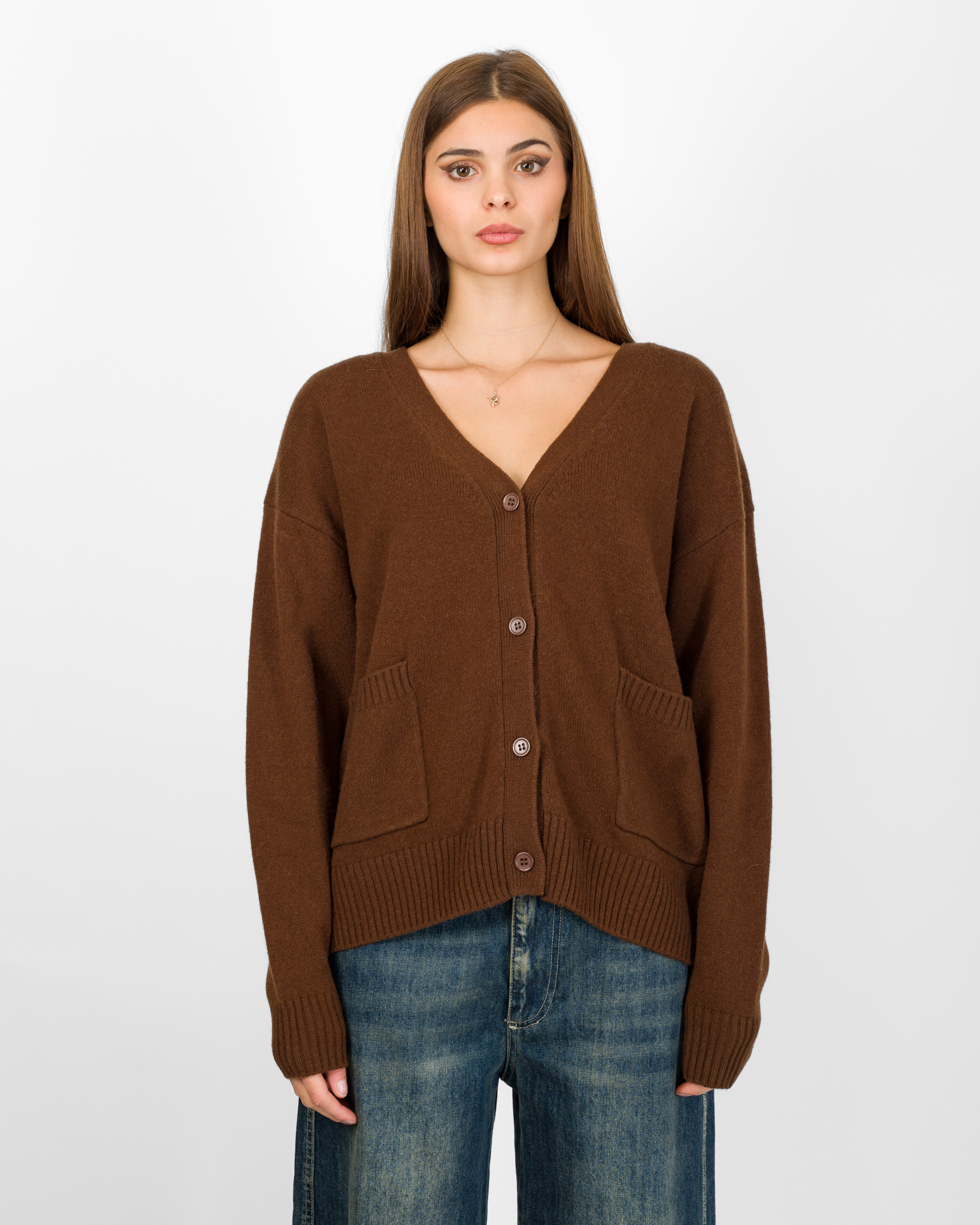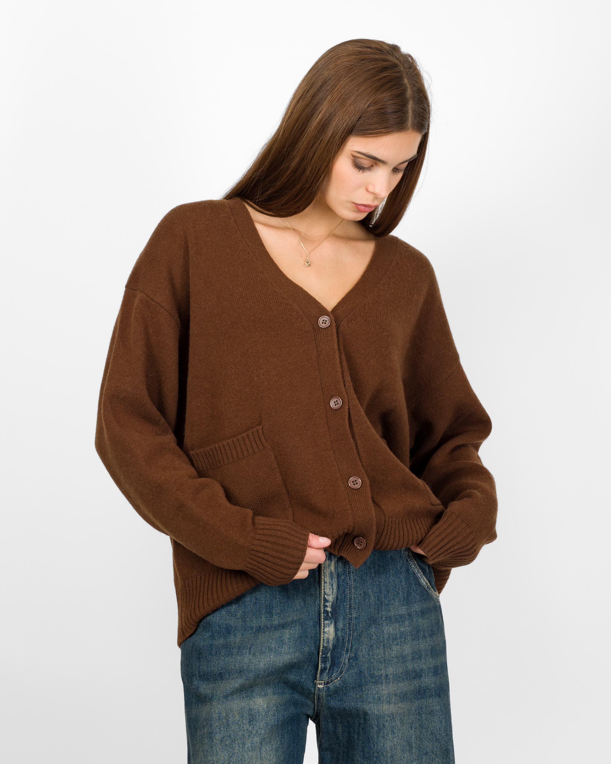 Il cardigan in 100% lana della collezione autunno/inverno di Souvenir presenta fit ampio con spalla scesa, scollo a V e chiusura frontale con bottoni tono su tono. Le tasche applicate e le finiture a costine su orlo e polsini definiscono con cura il design, mentre la texture valorizza la sensazione di calore e comfort.