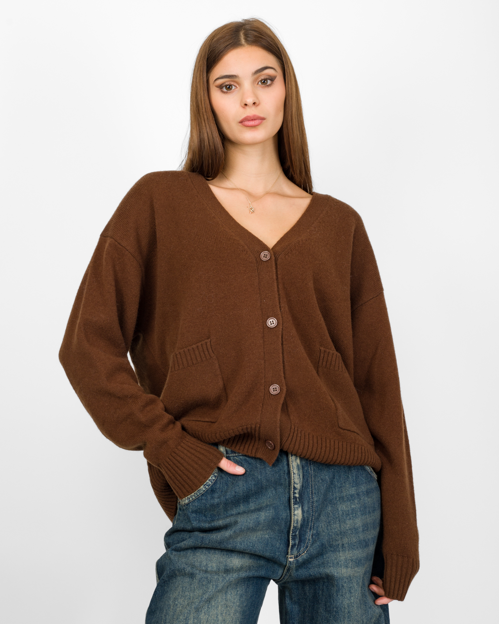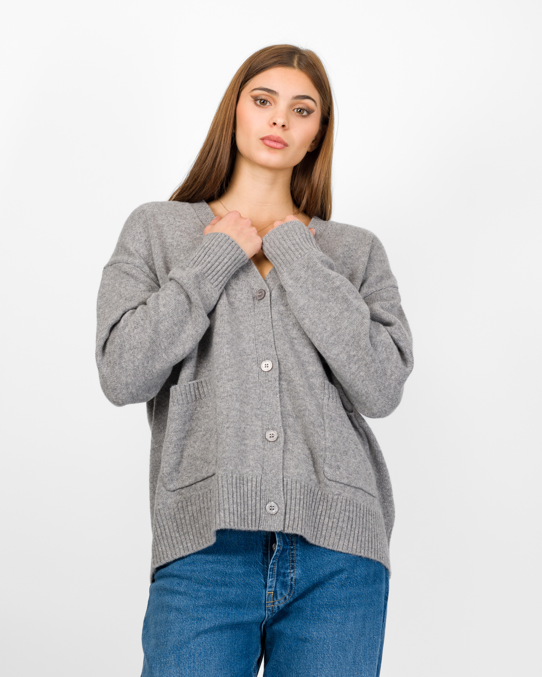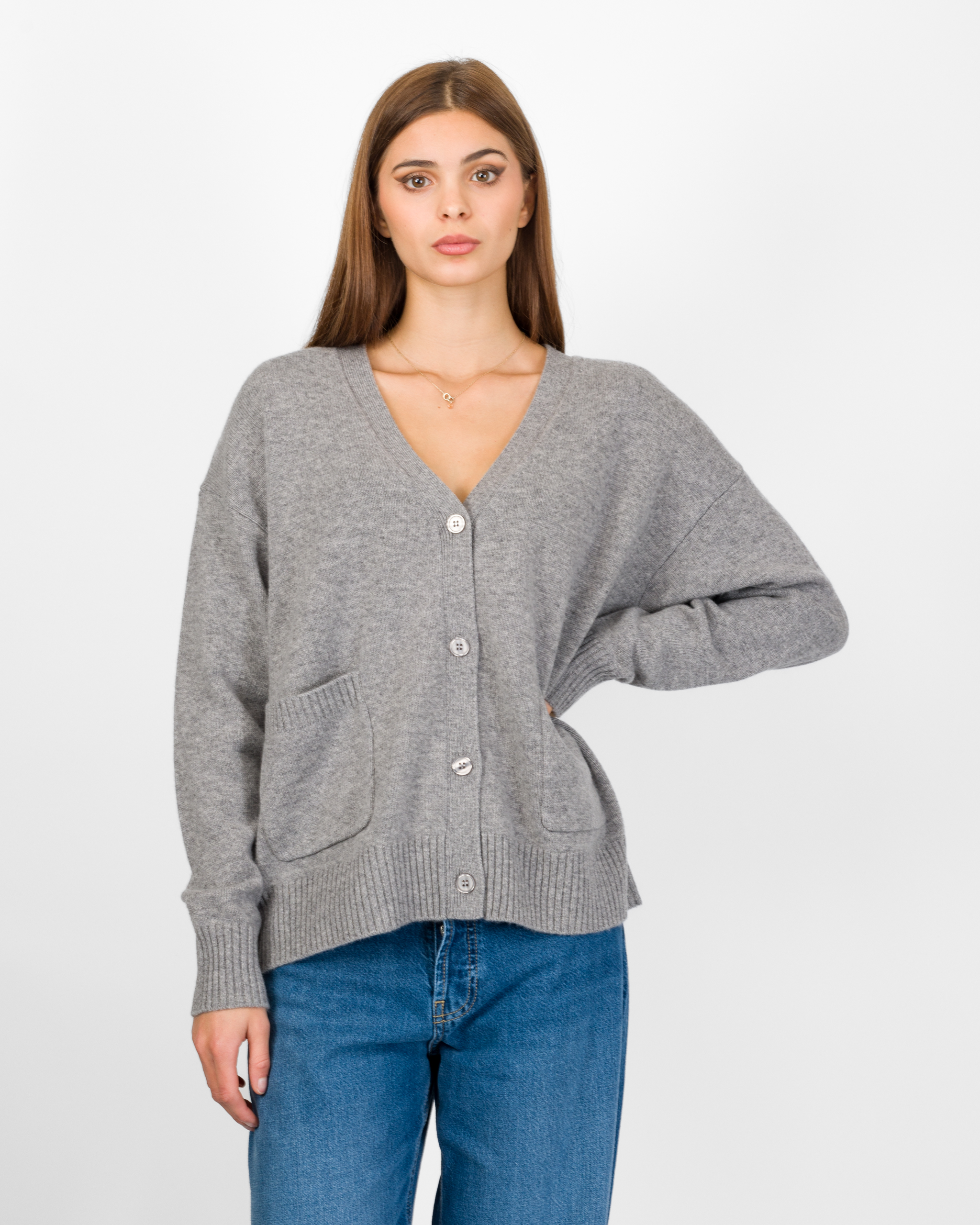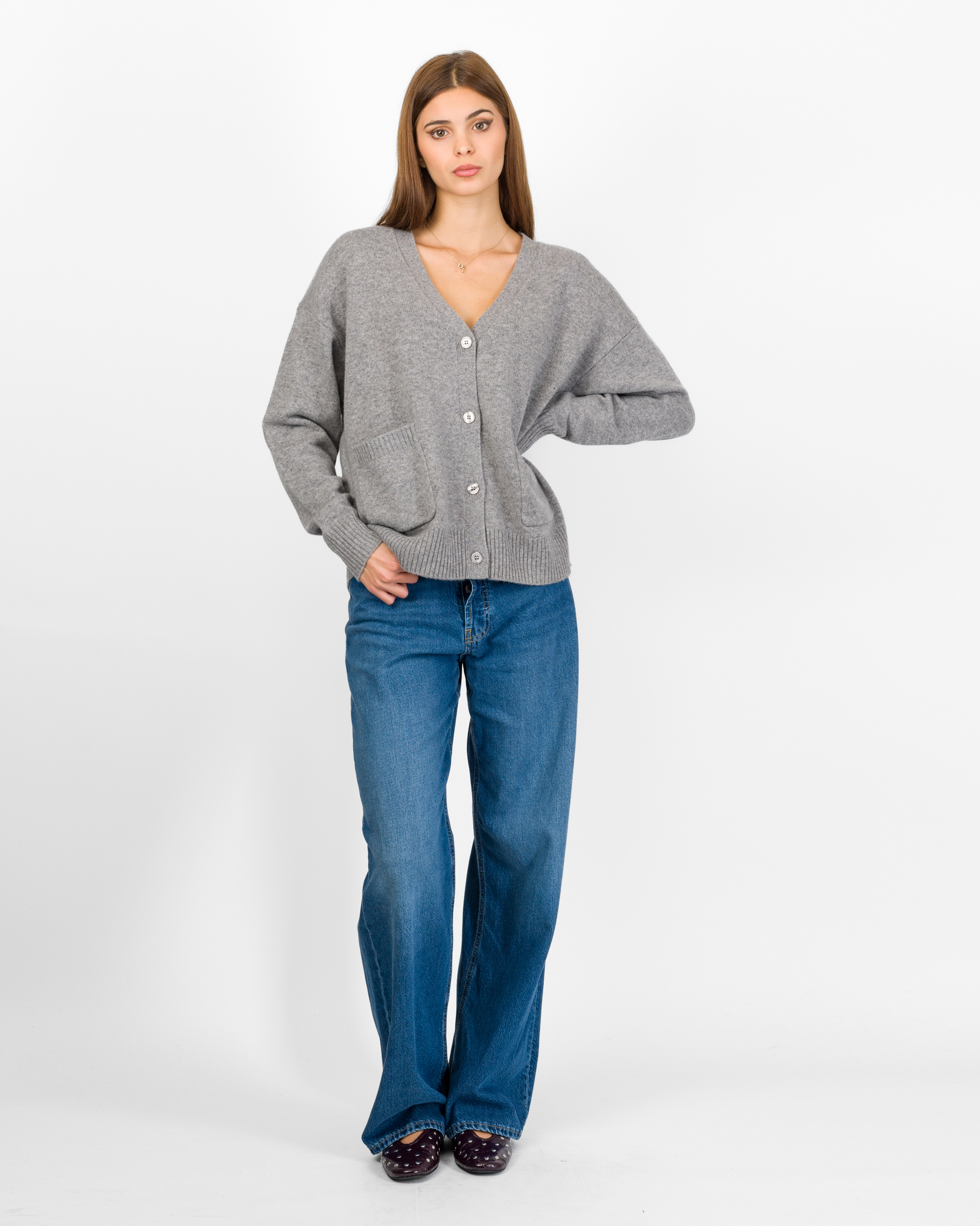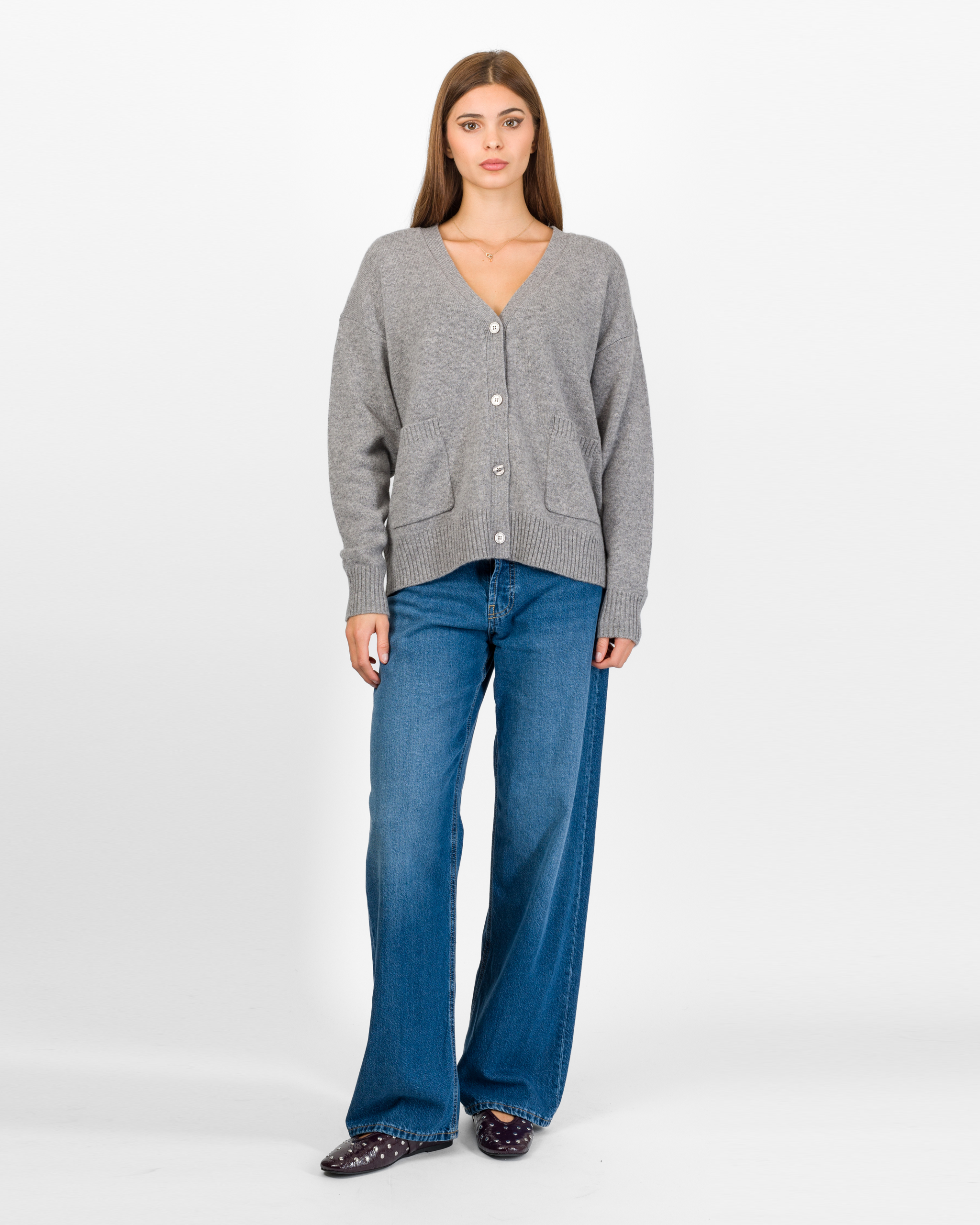 Il cardigan in 100% lana della collezione autunno/inverno di Souvenir presenta fit ampio con spalla scesa, scollo a V e chiusura frontale con bottoni tono su tono. Le tasche applicate e le finiture a costine su orlo e polsini definiscono con cura il design, mentre la texture valorizza la sensazione di calore e comfort.