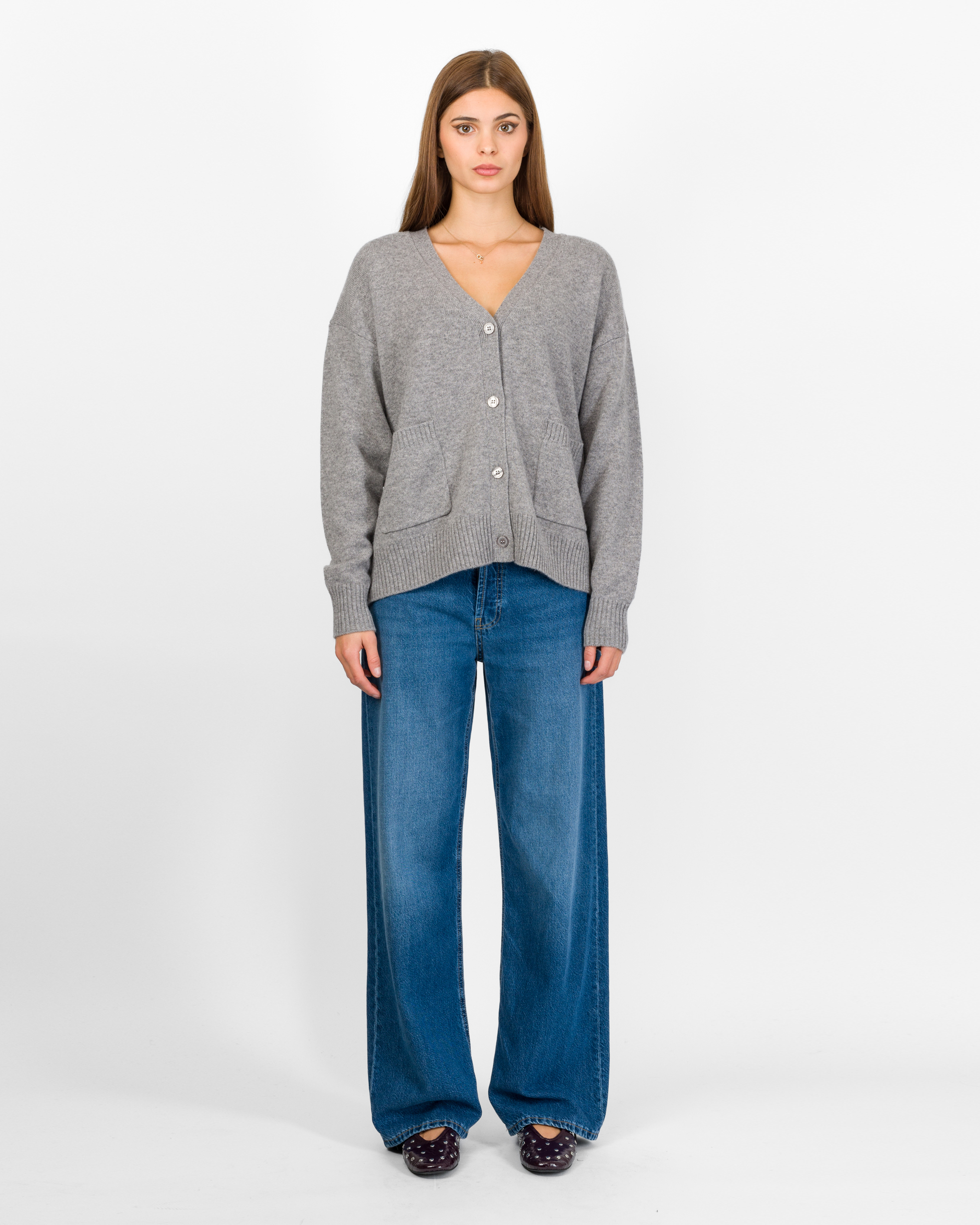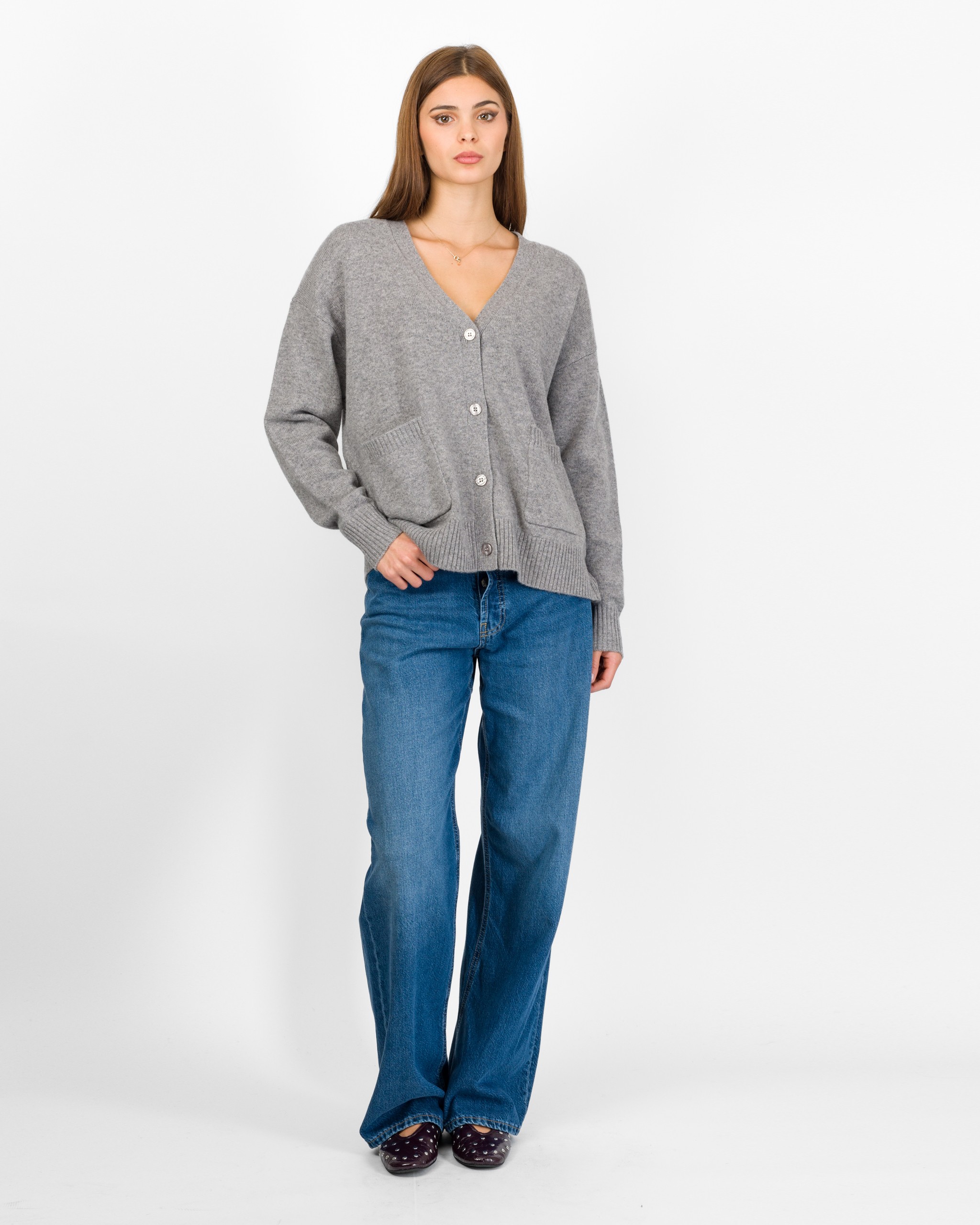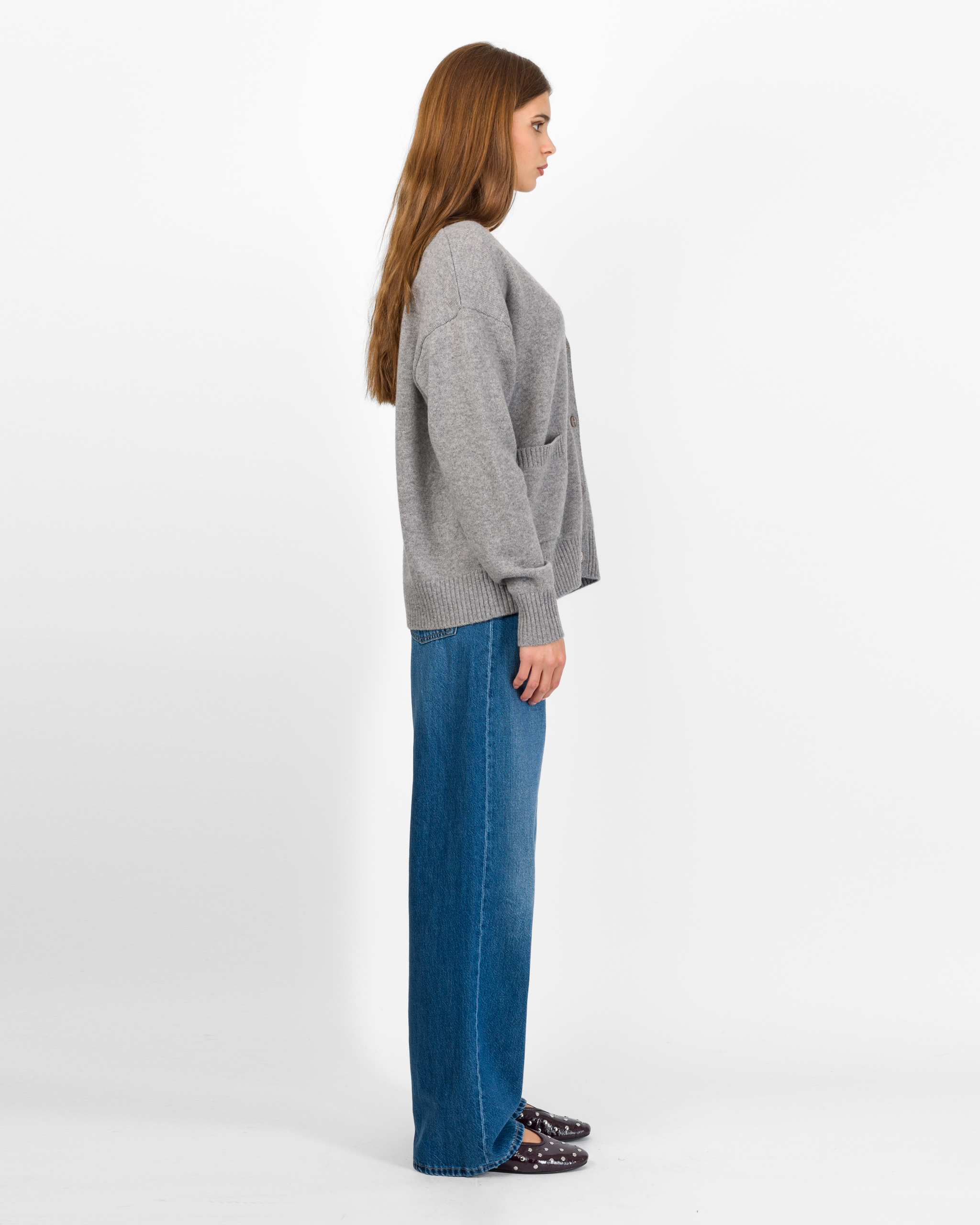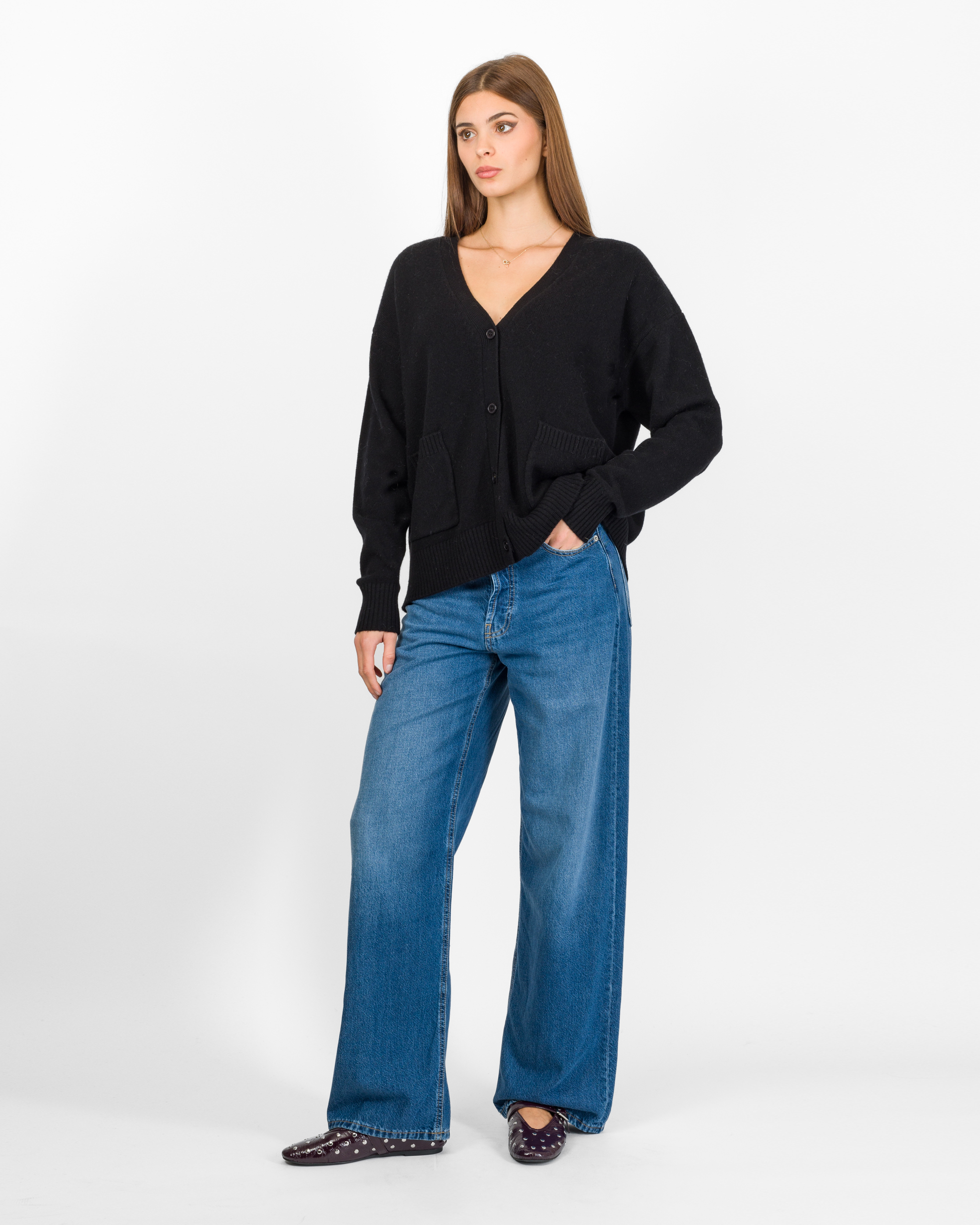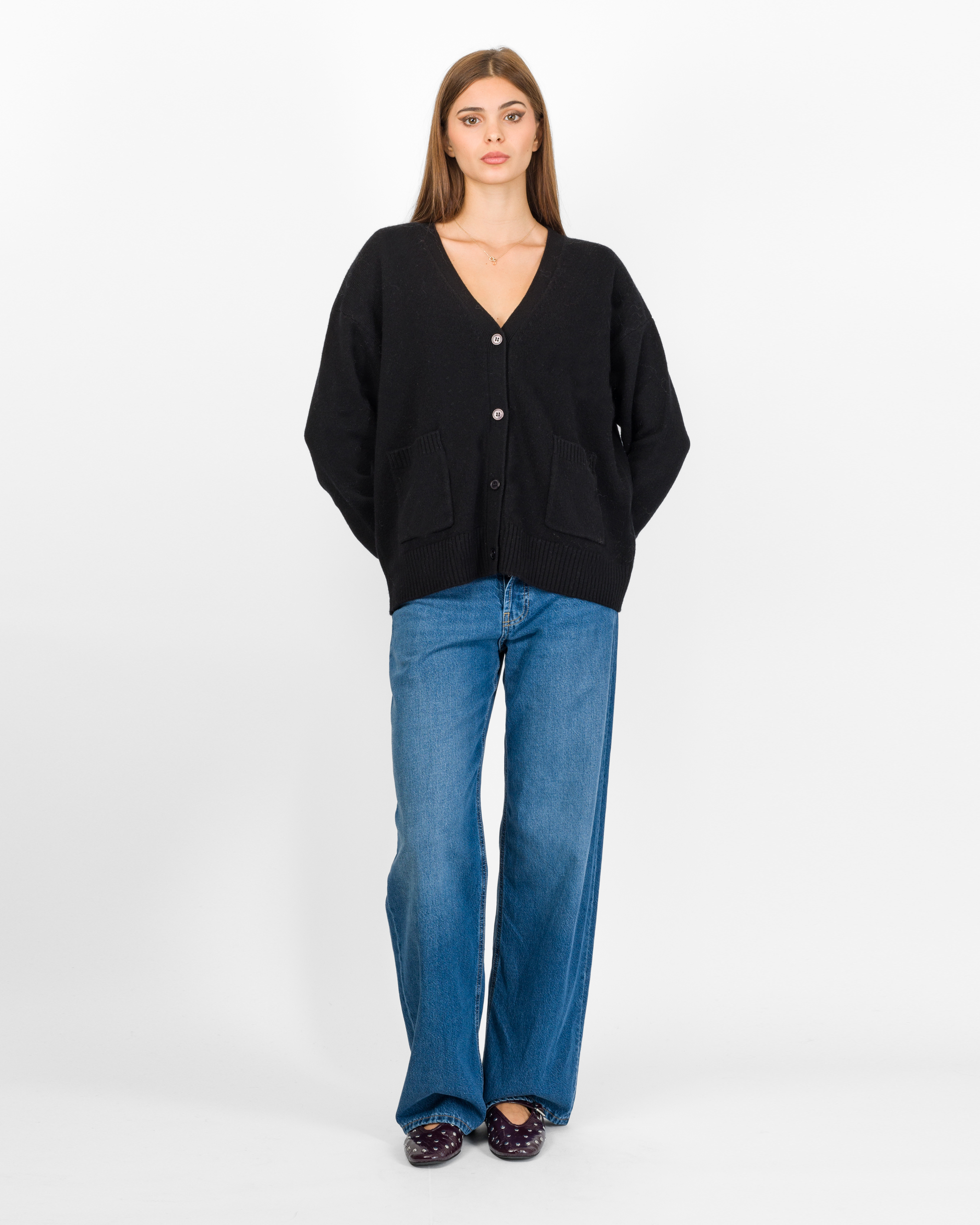 Il cardigan in 100% lana della collezione autunno/inverno di Souvenir presenta fit ampio con spalla scesa, scollo a V e chiusura frontale con bottoni tono su tono. Le tasche applicate e le finiture a costine su orlo e polsini definiscono con cura il design, mentre la texture valorizza la sensazione di calore e comfort.