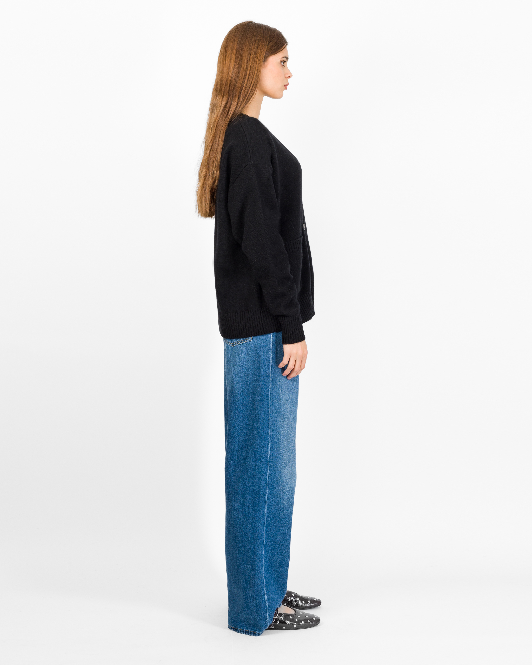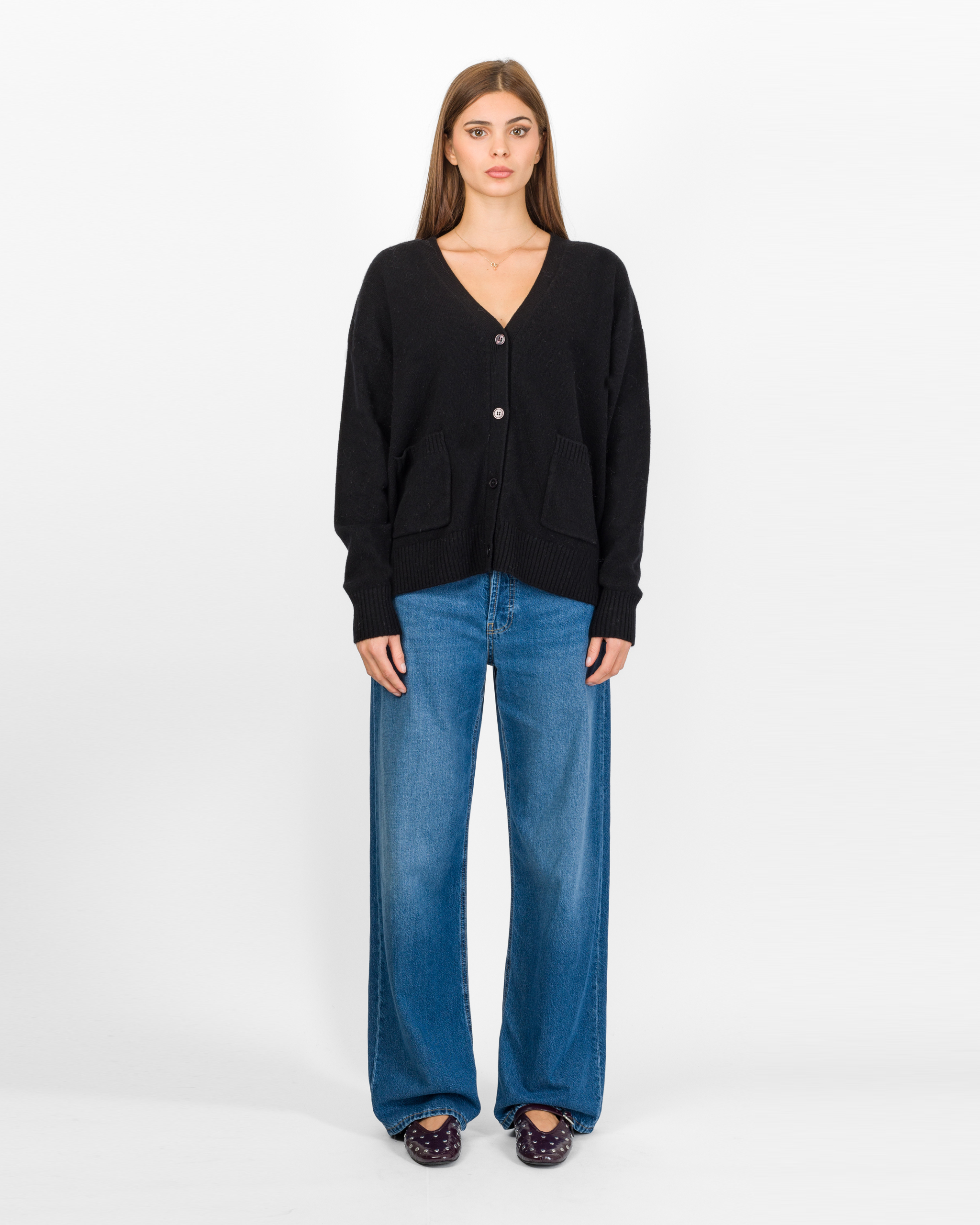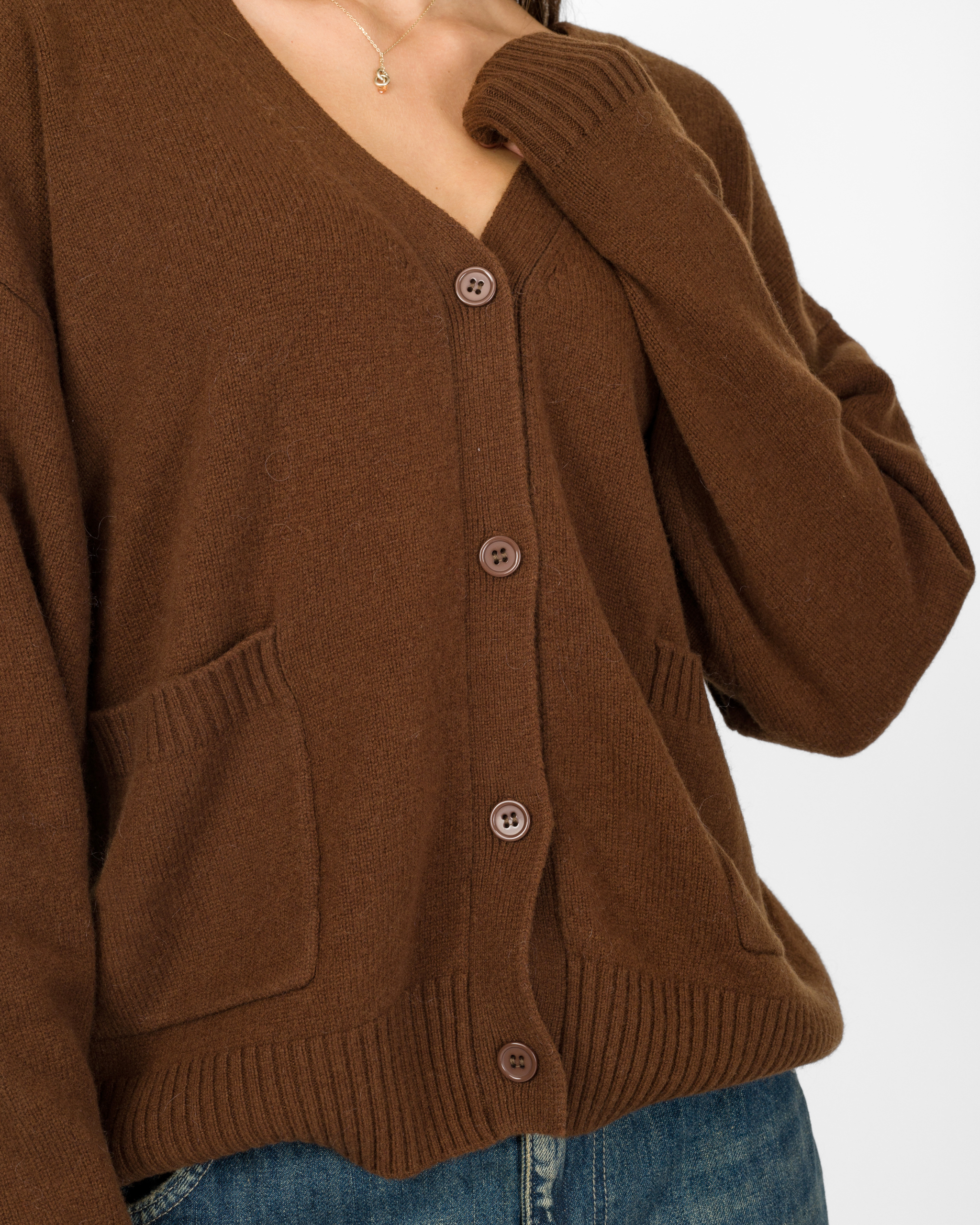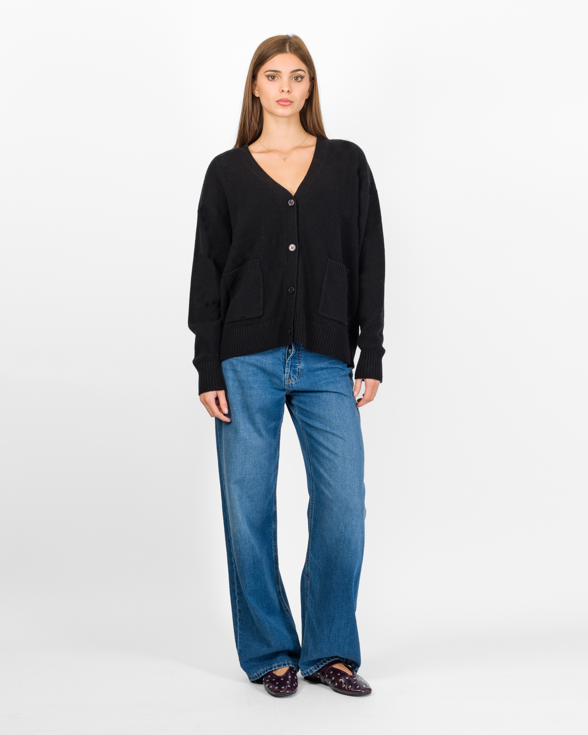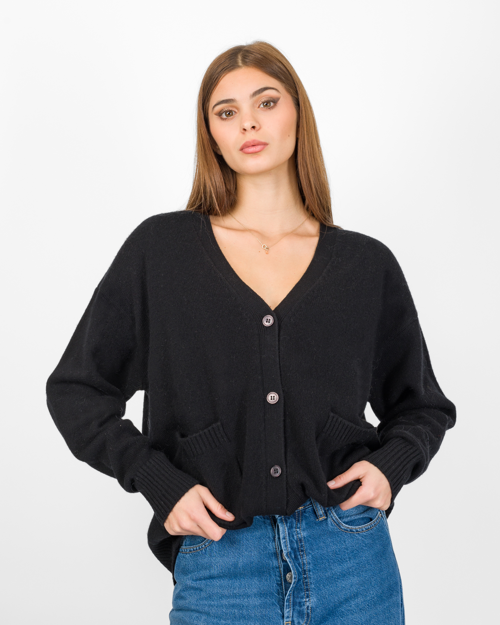 Il cardigan in 100% lana della collezione autunno/inverno di Souvenir presenta fit ampio con spalla scesa, scollo a V e chiusura frontale con bottoni tono su tono. Le tasche applicate e le finiture a costine su orlo e polsini definiscono con cura il design, mentre la texture valorizza la sensazione di calore e comfort.