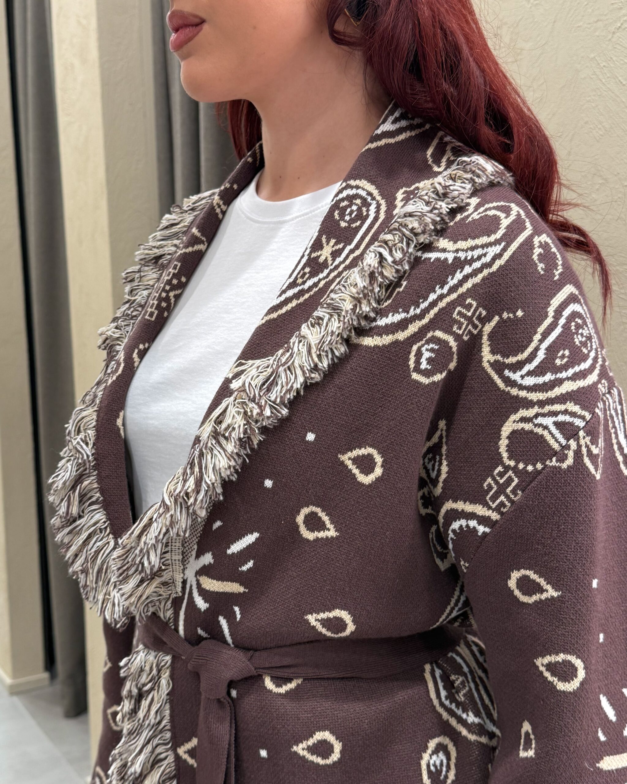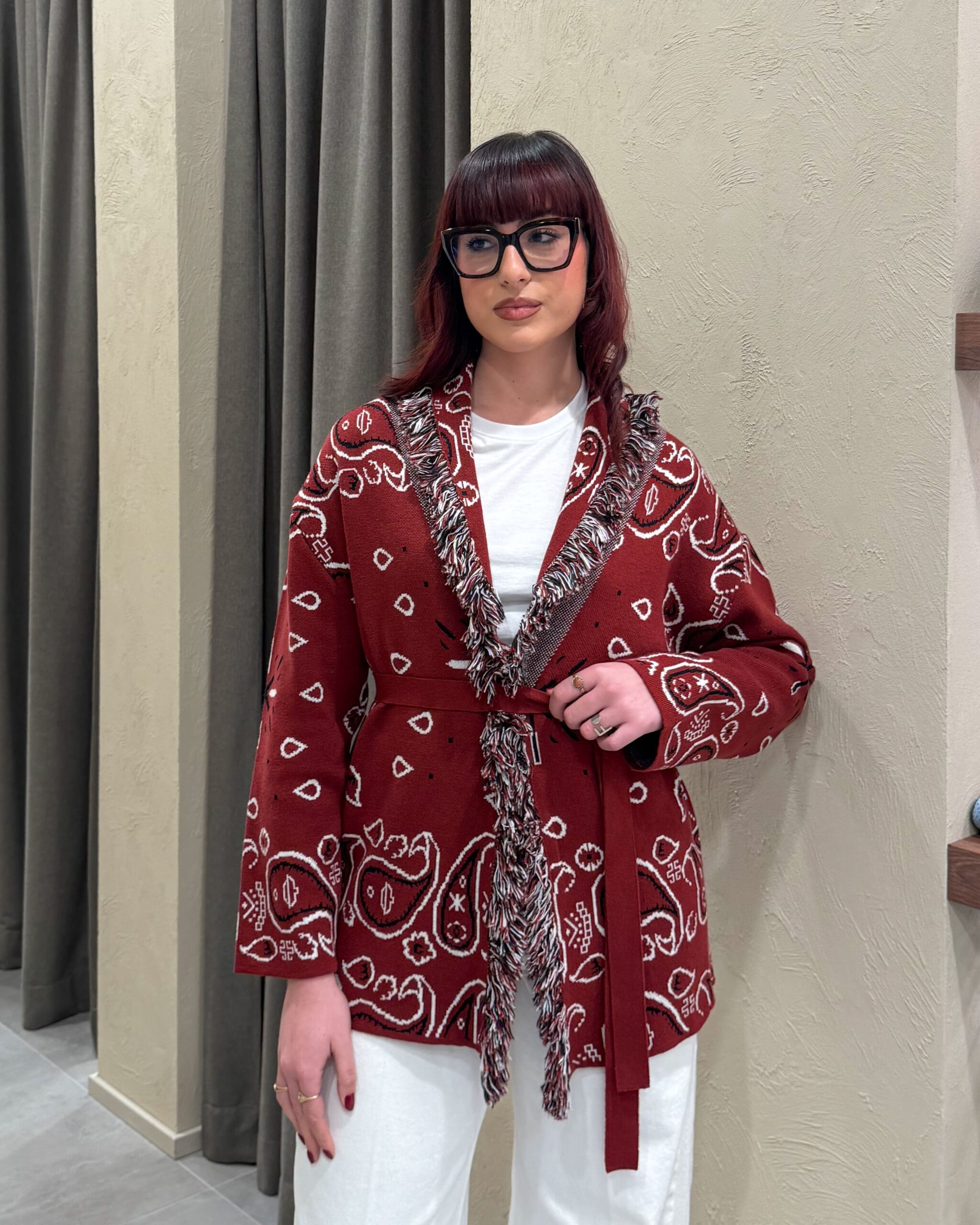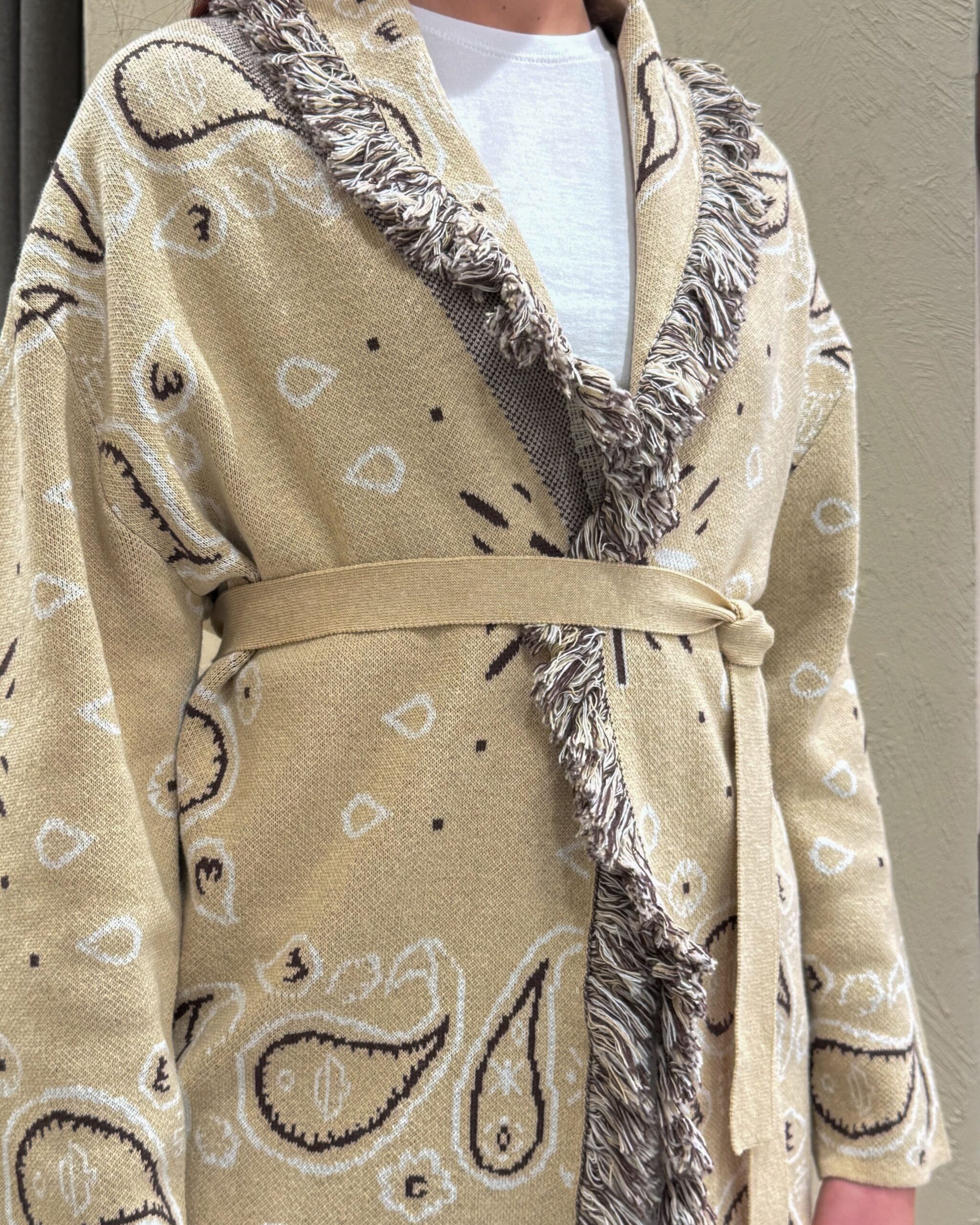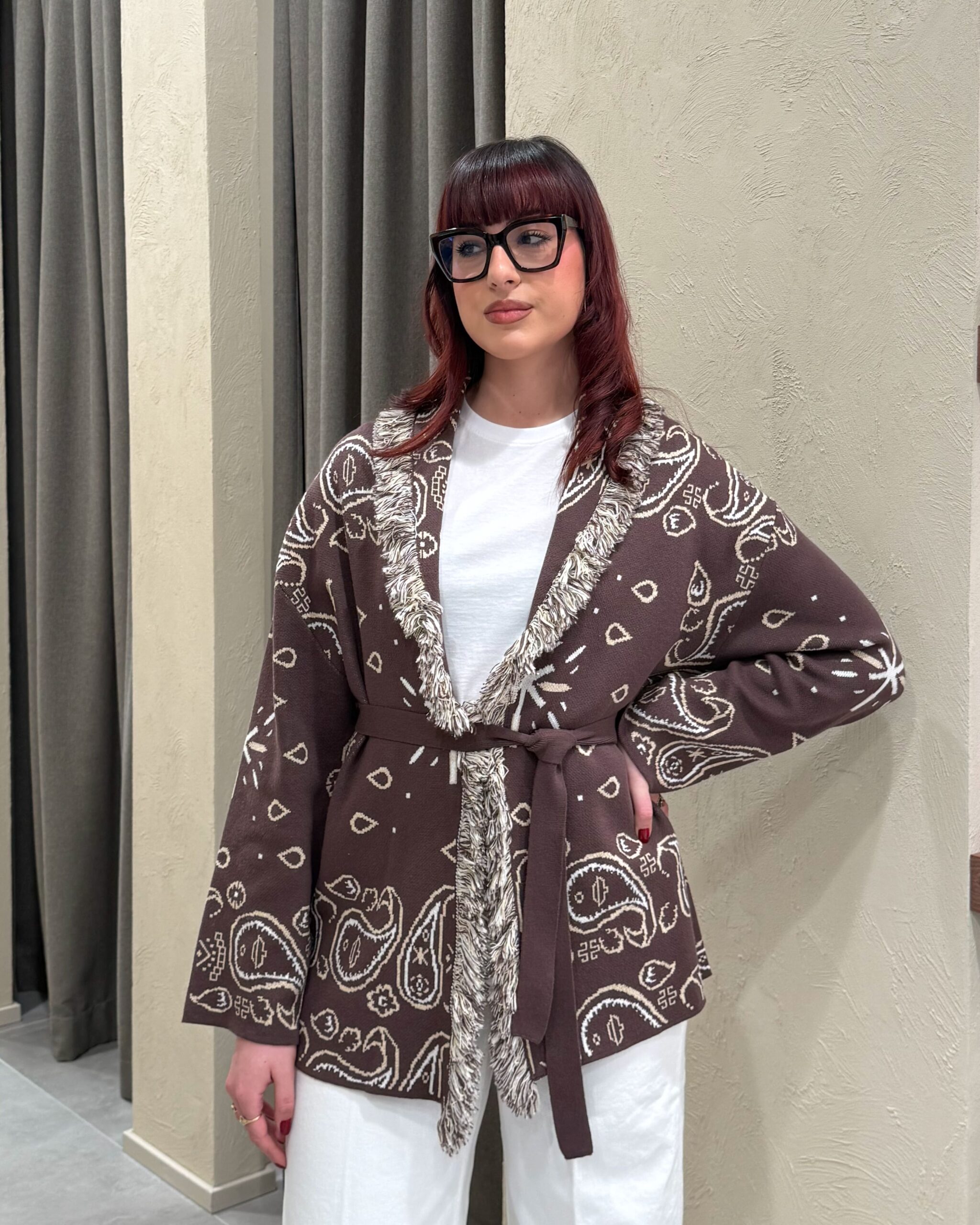Il cardigan della collezione primavera/estate di Kontatto è caratterizzato dalla fantasia bandana all-over e da un design avvolgente con scollo a V profondo. Presenta maniche lunghe, profili rifiniti con frange a contrasto lungo il rever e sul bordo frontale, ed è completato da una fusciacca tono su tono che valorizza il punto vita. La lavorazione in maglia dona struttura e comfort.