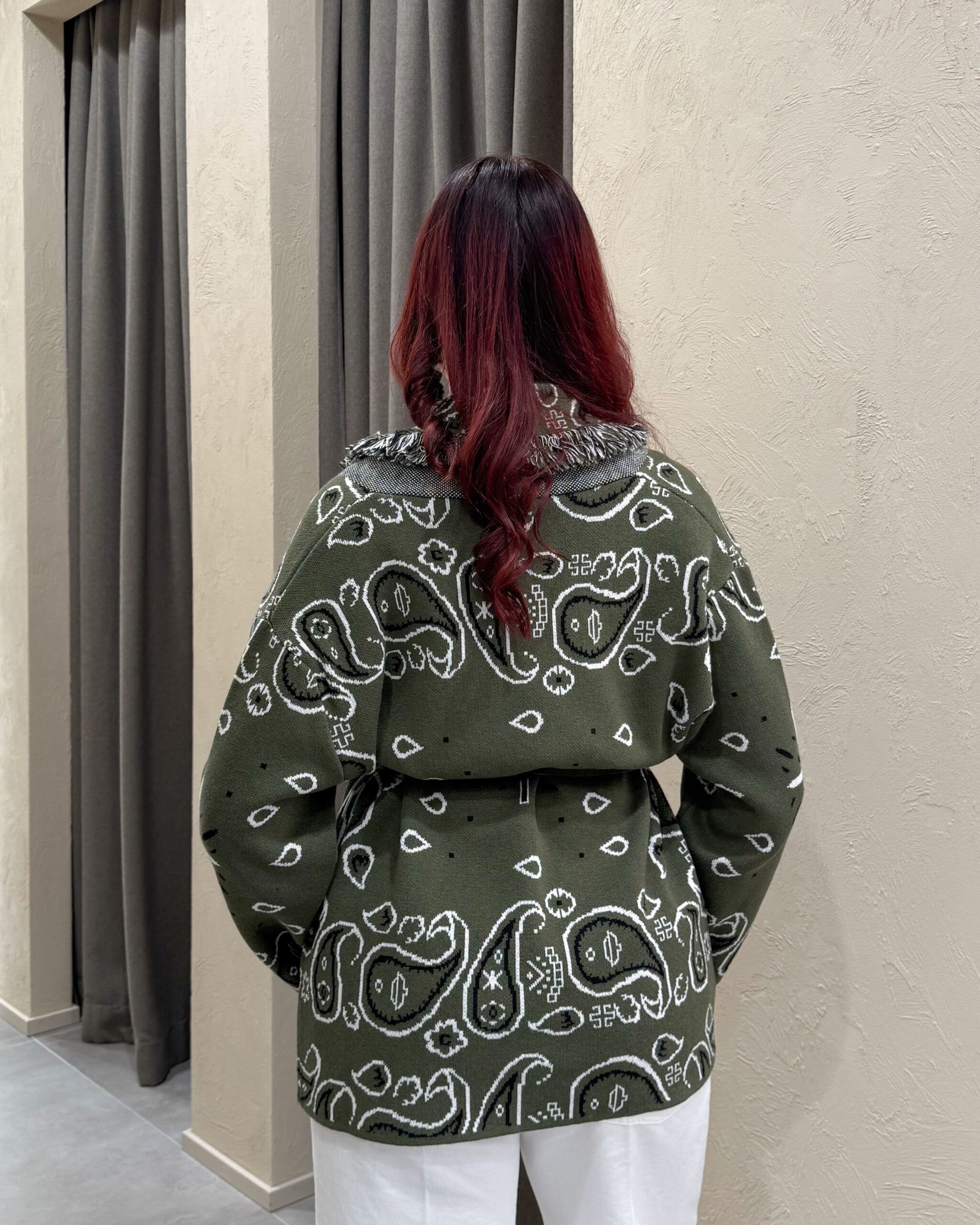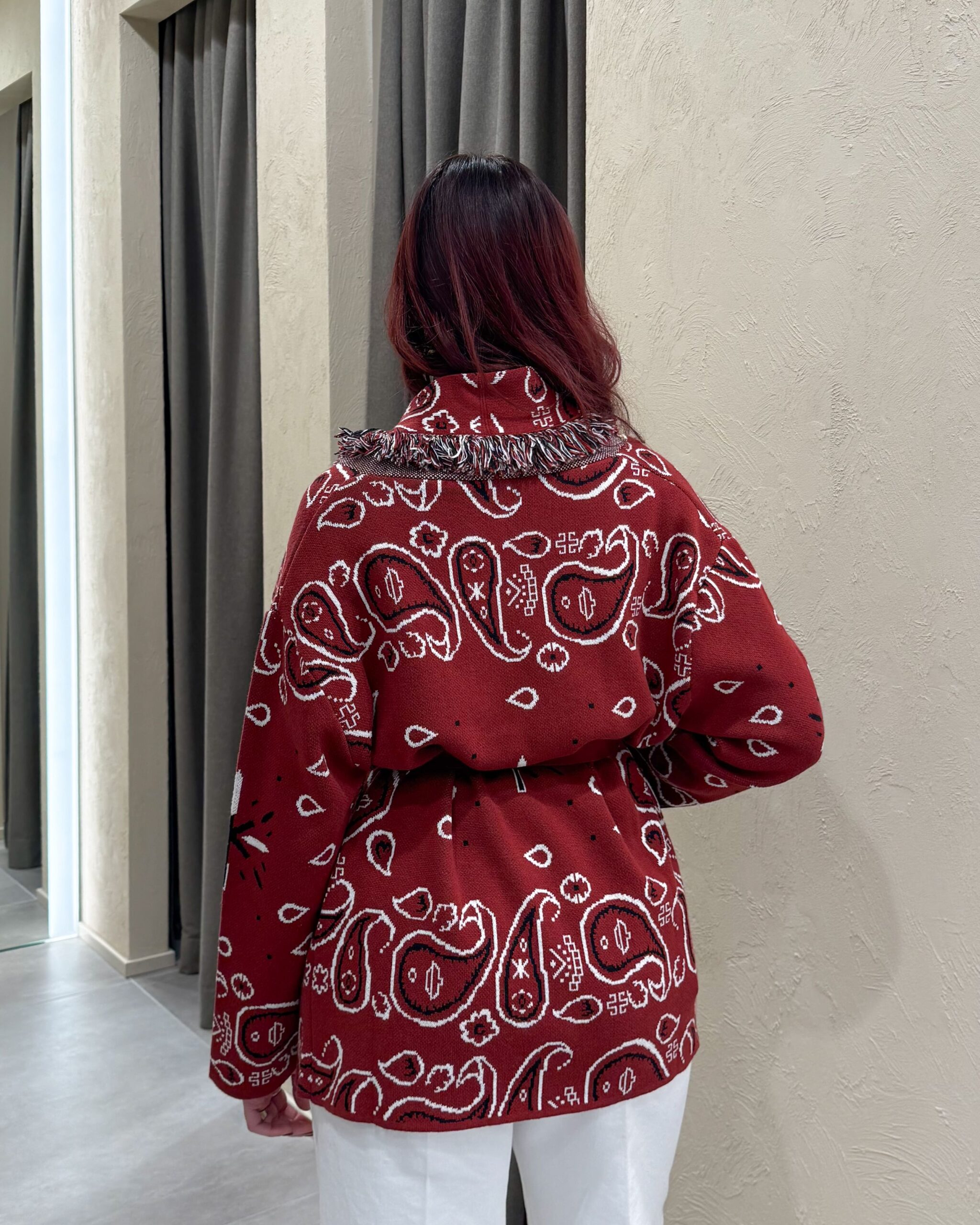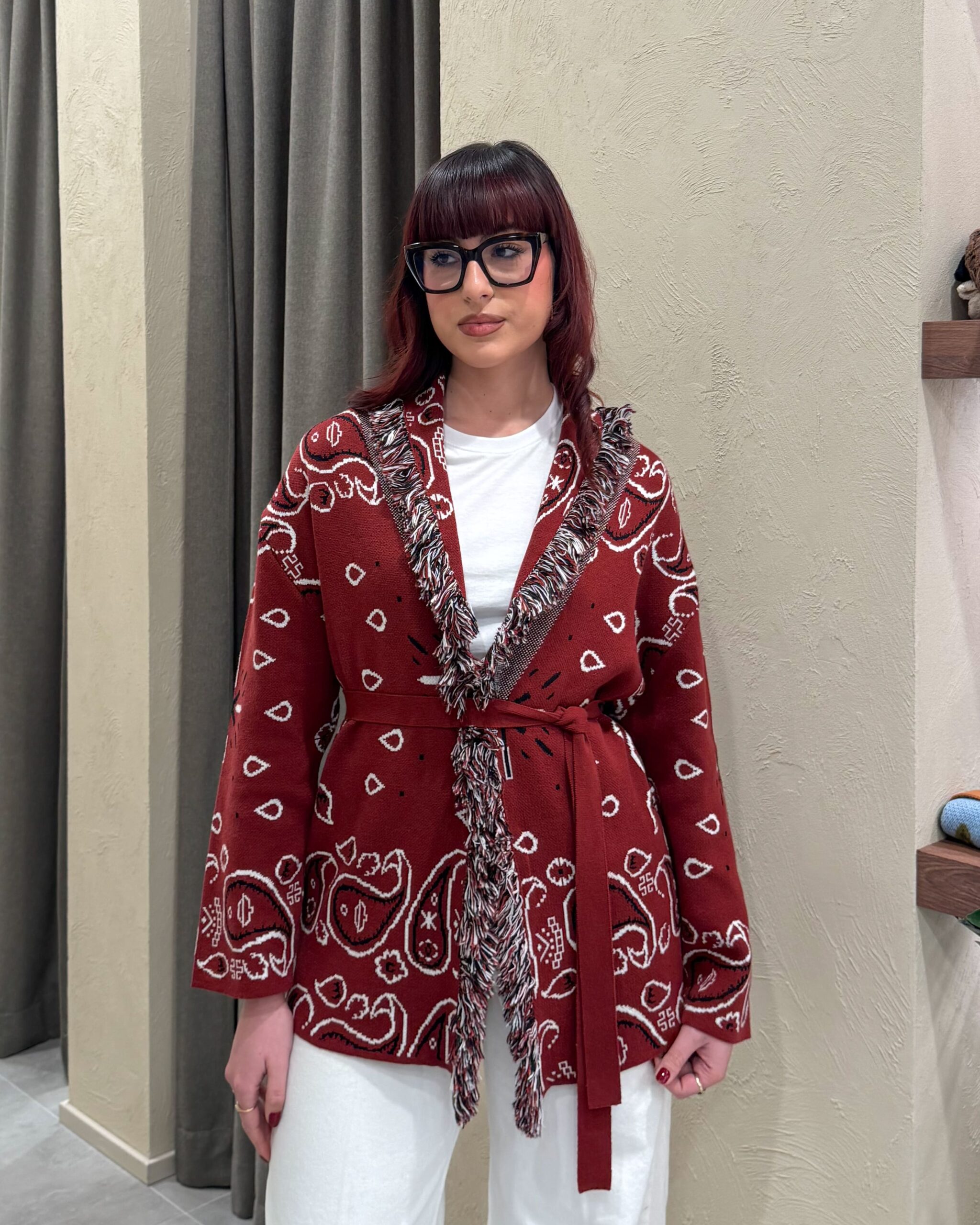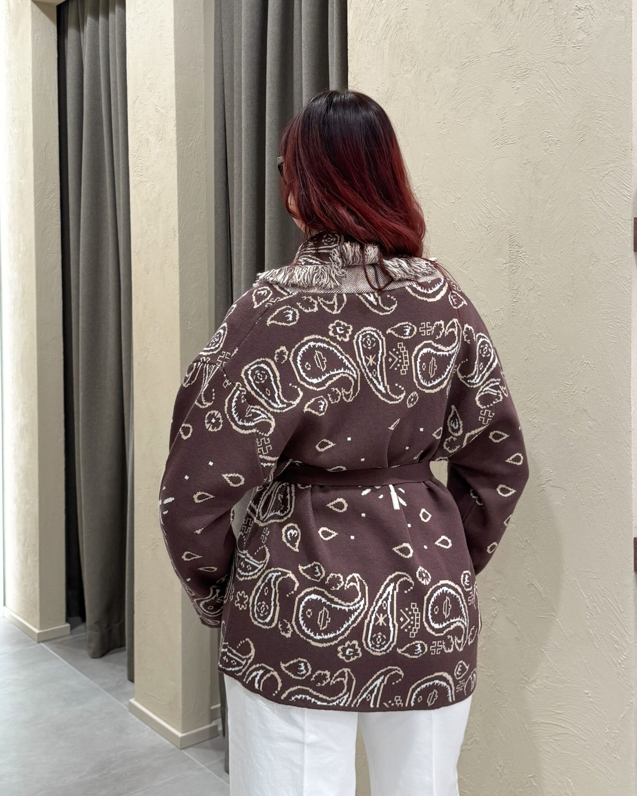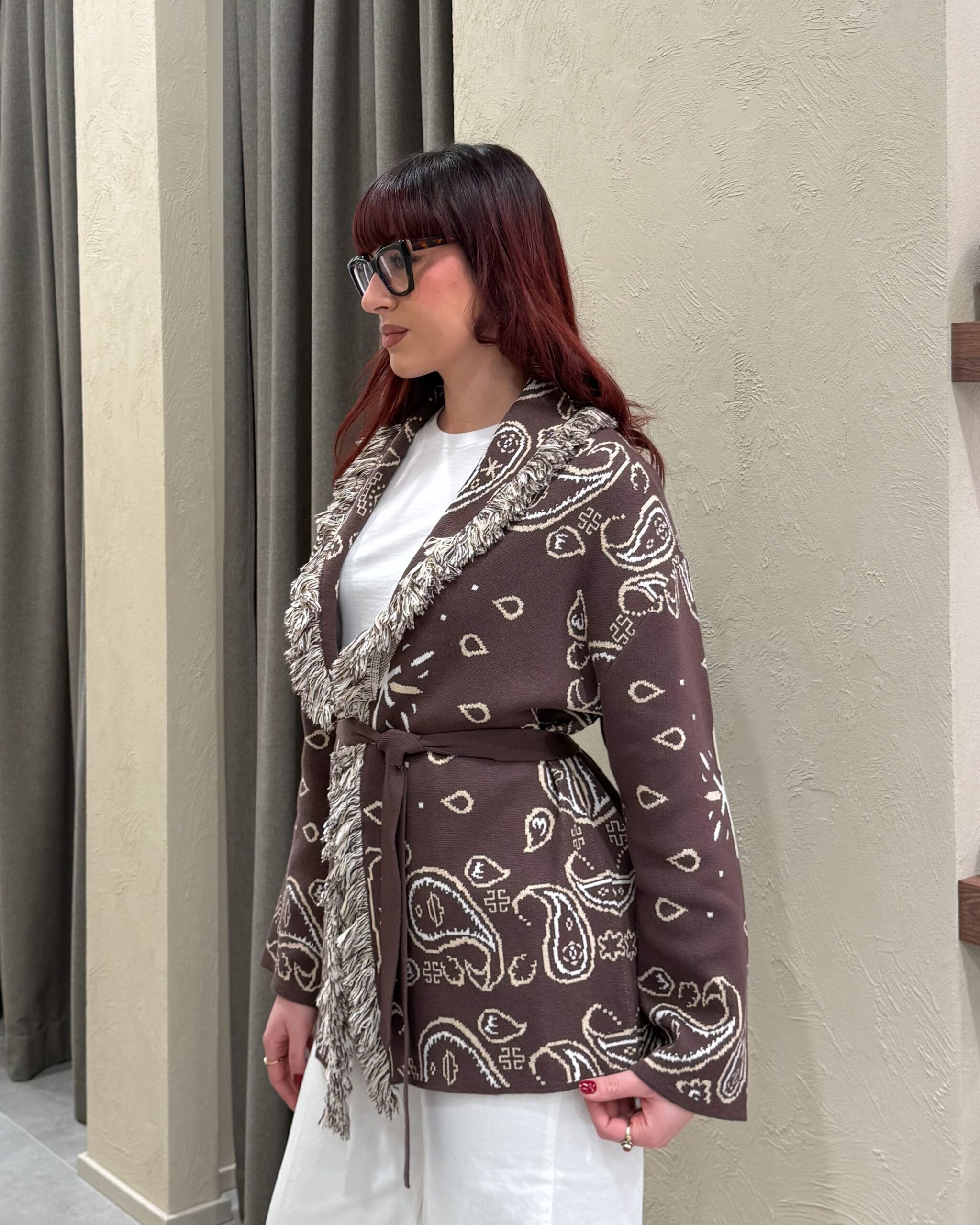 Il cardigan della collezione primavera/estate di Kontatto è caratterizzato dalla fantasia bandana all-over e da un design avvolgente con scollo a V profondo. Presenta maniche lunghe, profili rifiniti con frange a contrasto lungo il rever e sul bordo frontale, ed è completato da una fusciacca tono su tono che valorizza il punto vita. La lavorazione in maglia dona struttura e comfort.