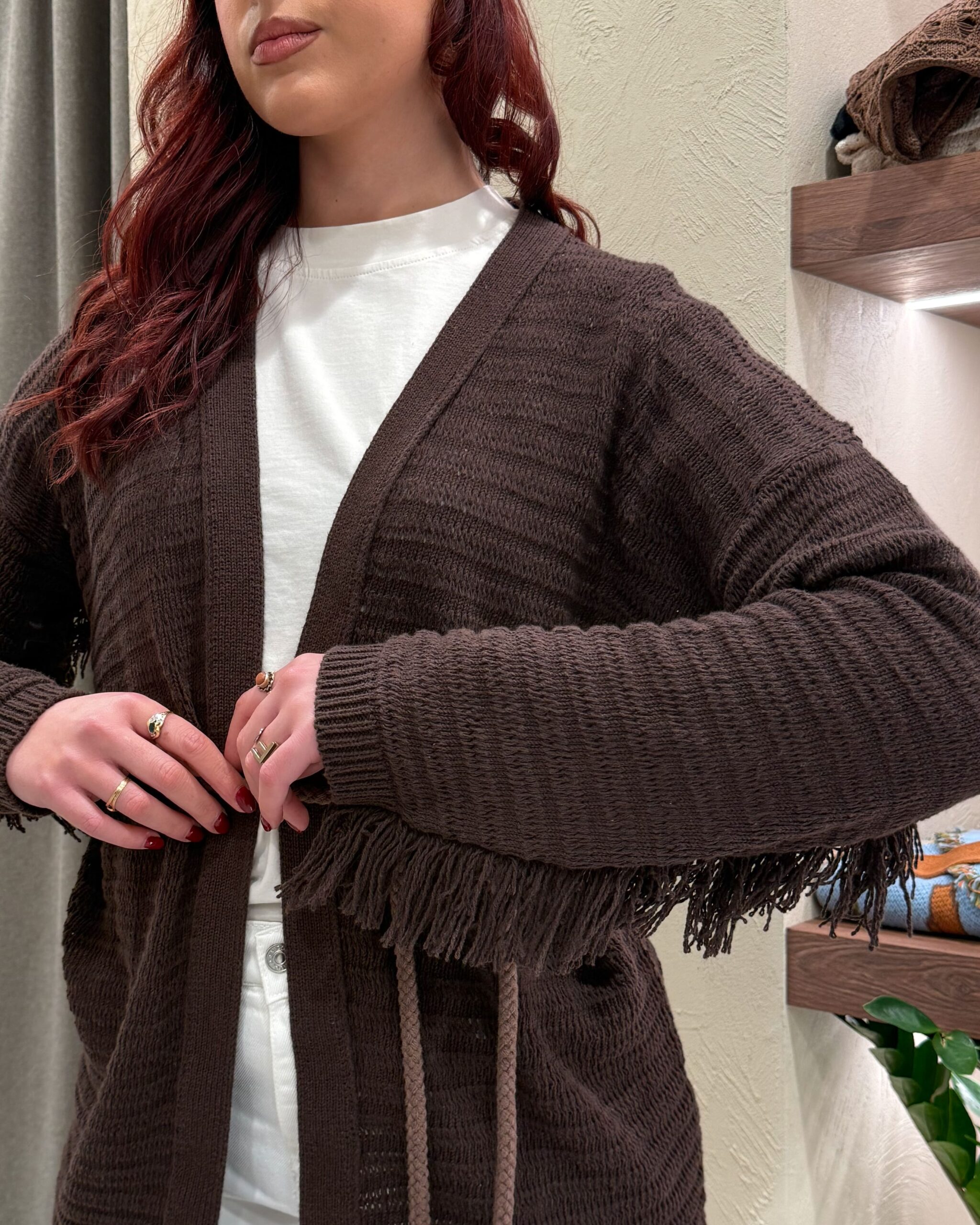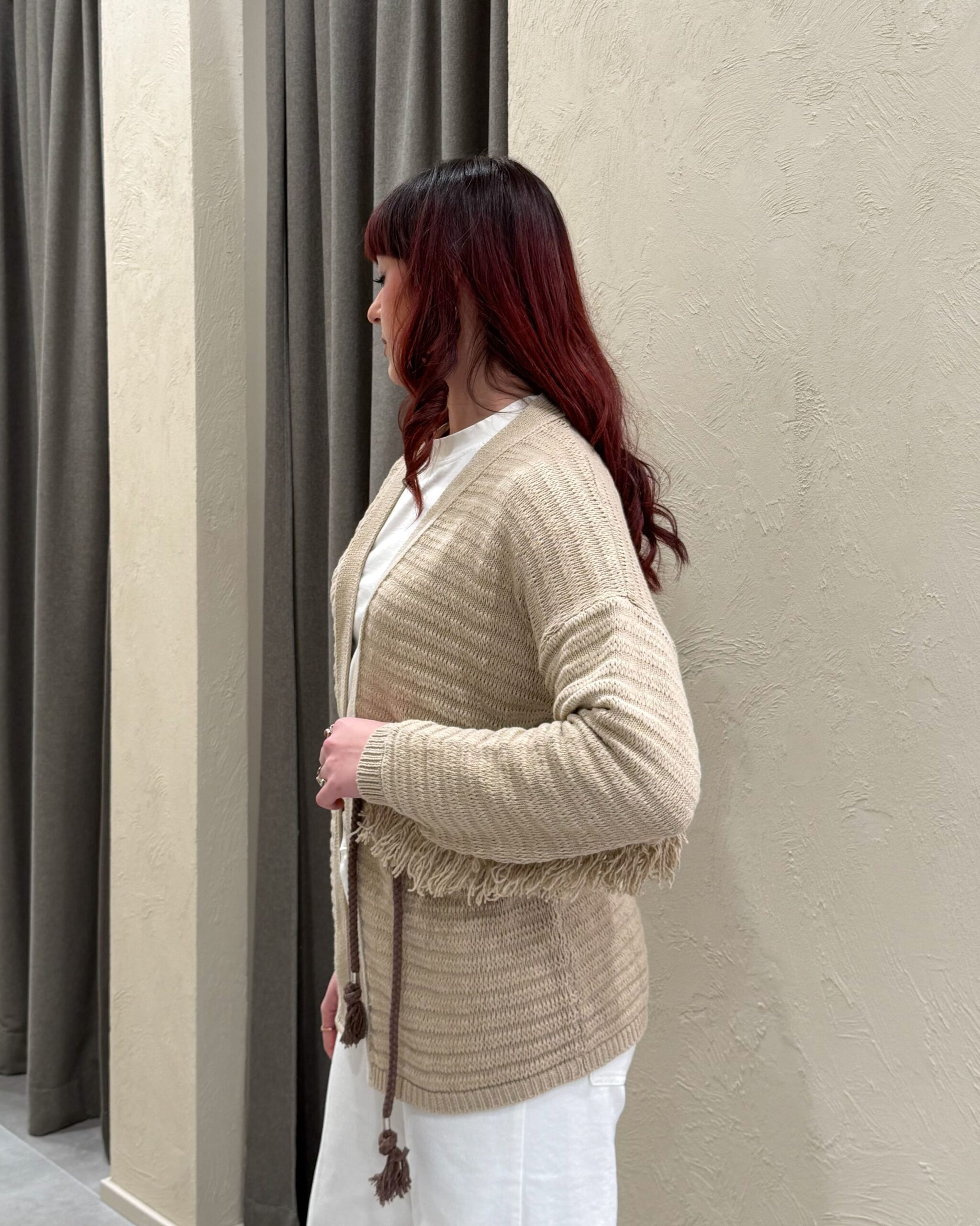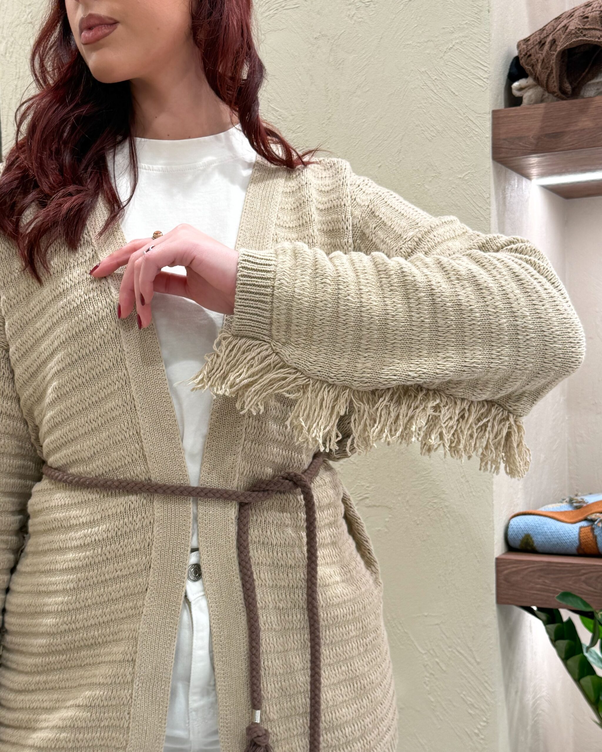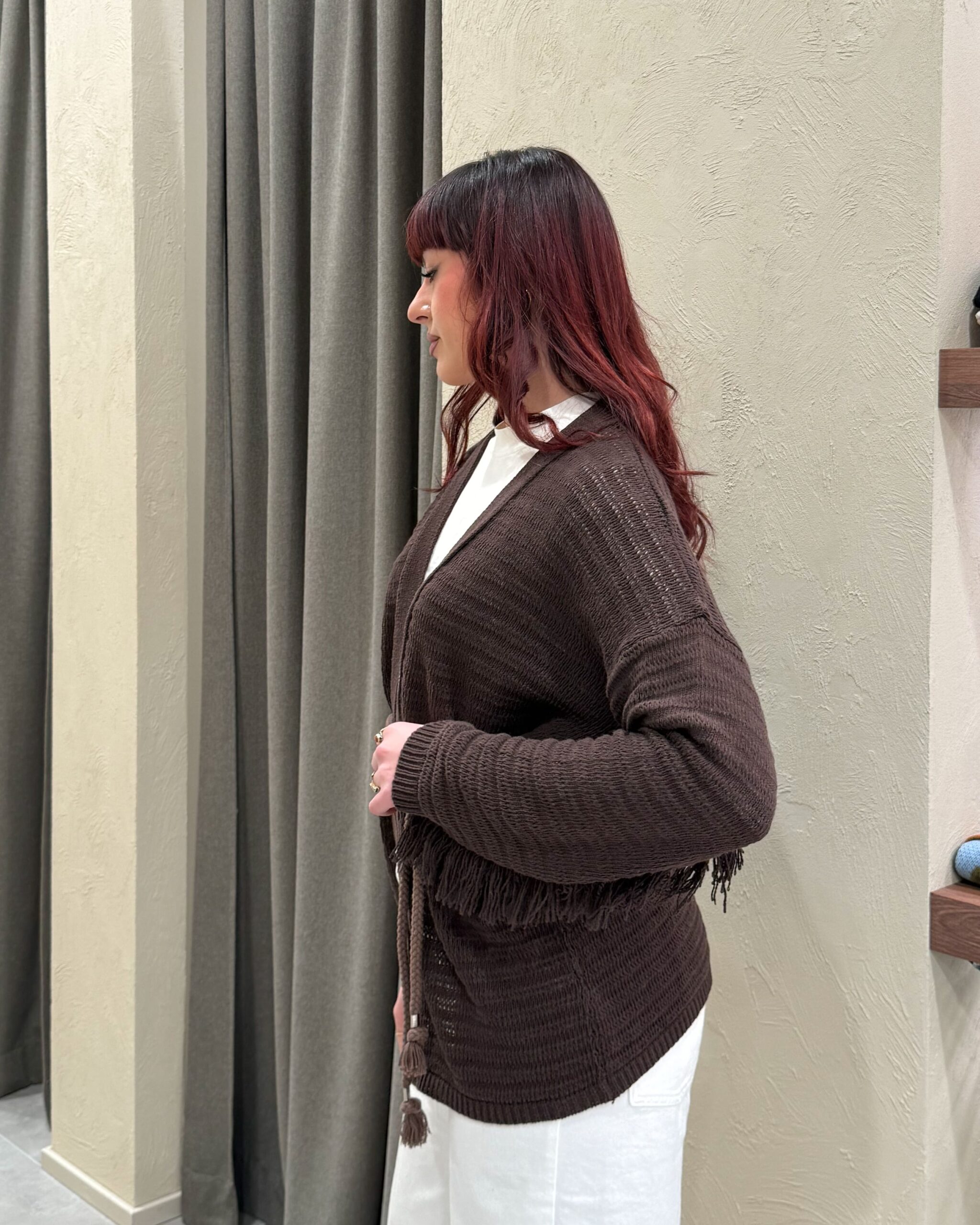 CARDIGAN TRAFORATO CON FRANGE E CORDA – KONTATTO