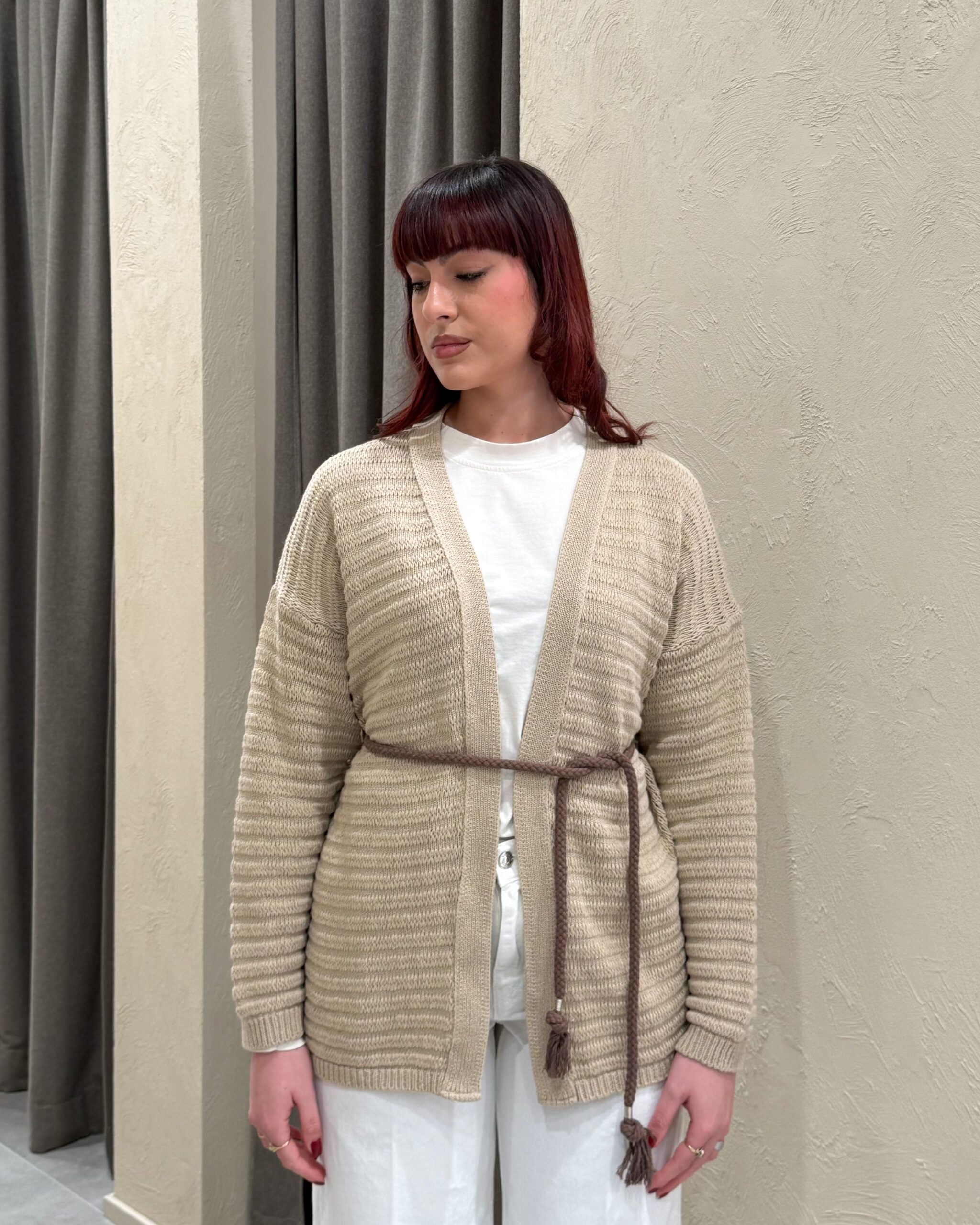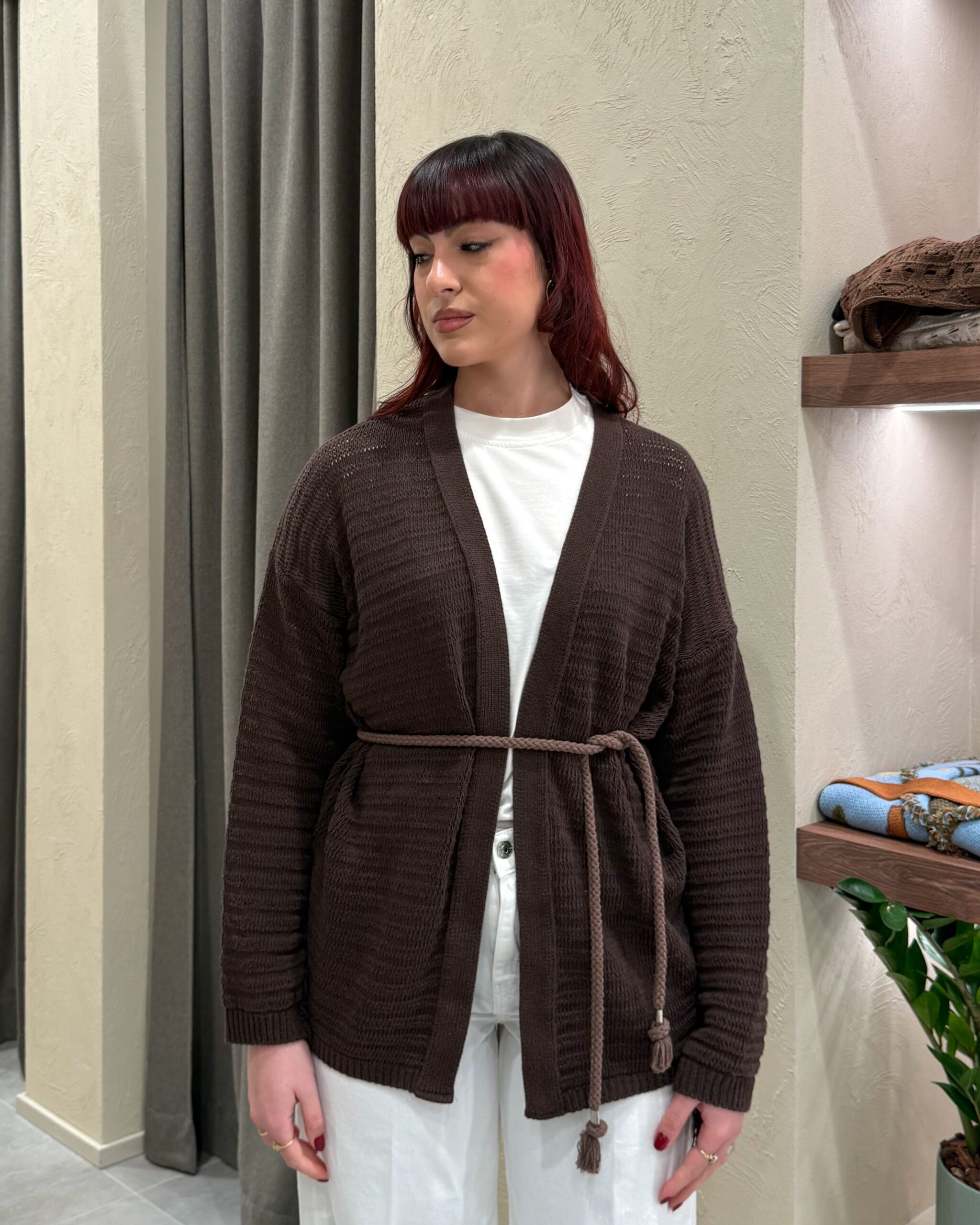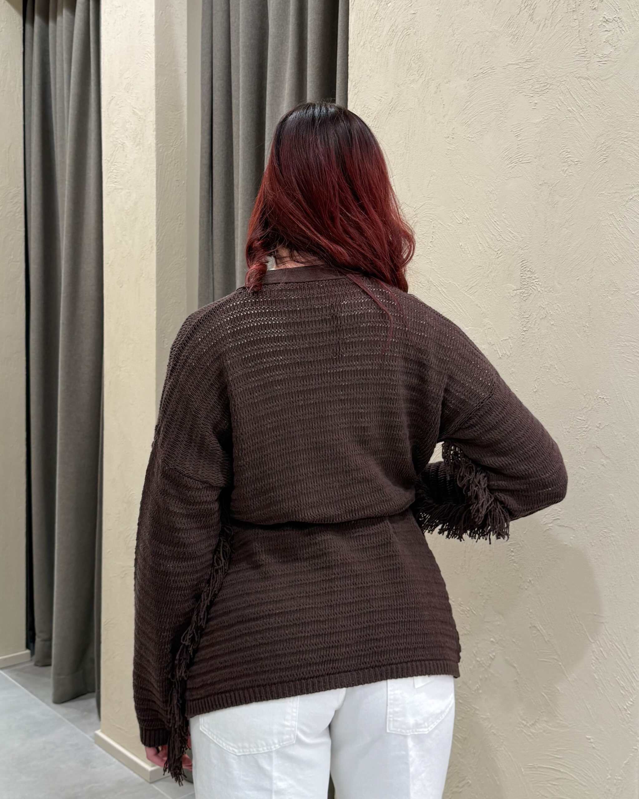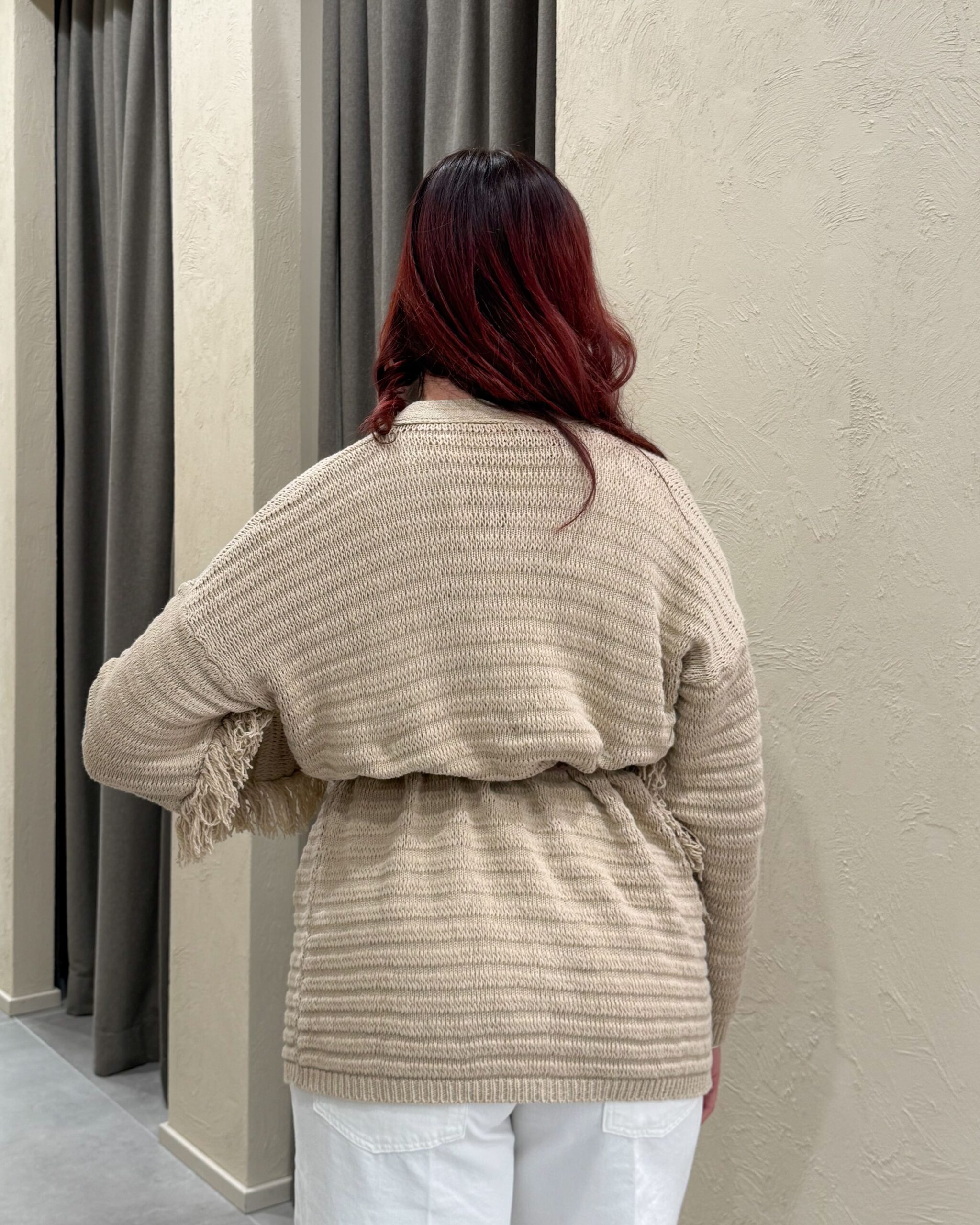 CARDIGAN TRAFORATO CON FRANGE E CORDA – KONTATTO