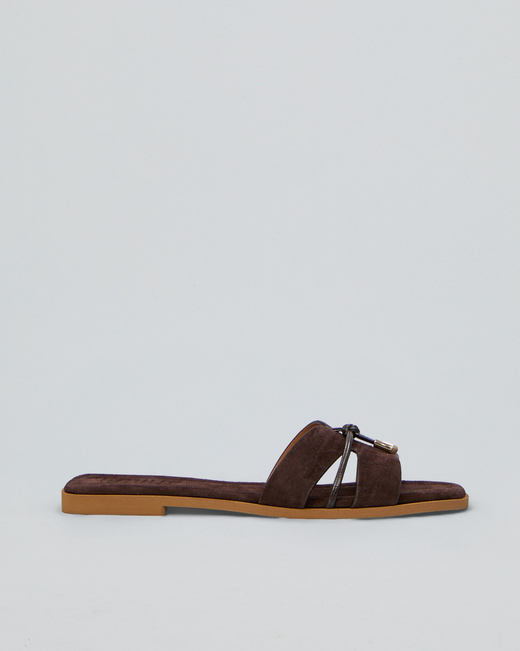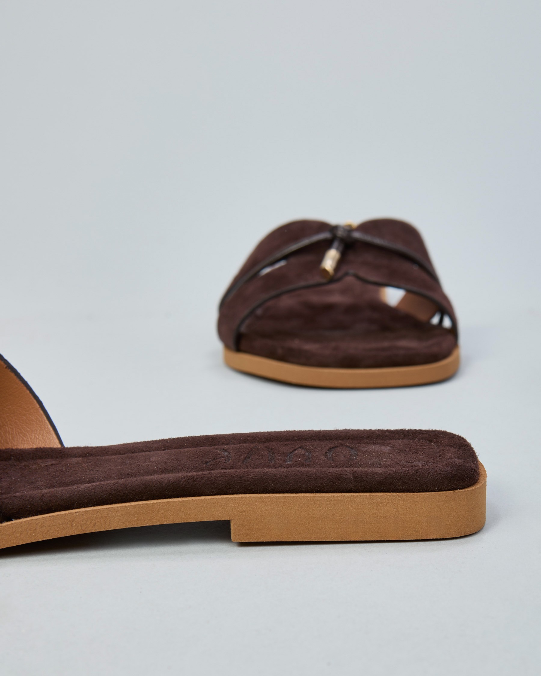 La ciabatta della collezione primavera/estate di Ovyé by Cristina Lucchi è caratterizzata dal design flat con punta squadrata e doppia fascia incrociata sul davanti. Realizzata in morbido suede testa di moro, presenta un sottile laccetto passante con finalini metallici che illumina la linea essenziale del modello. La soletta tono su tono completa l’estetica sofisticata e contemporanea.