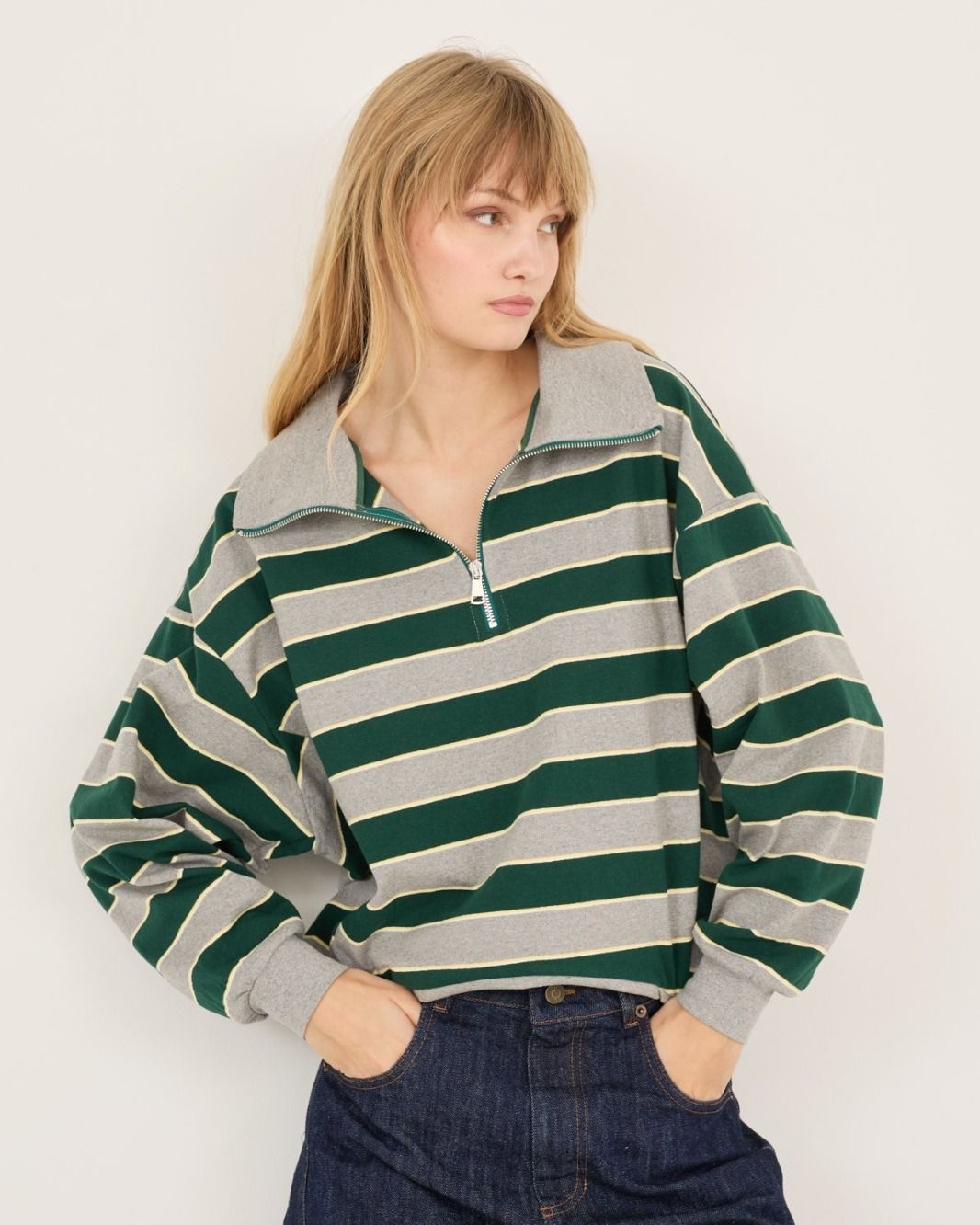 La felpa della collezione primavera/estate di Souvenir presenta motivo a righe orizzontali verde e grigio con sottili linee a contrasto. Ampio collo alto con apertura frontale a mezza zip metallica e vestibilità oversize. Polsini e fondo rifiniti in tono.