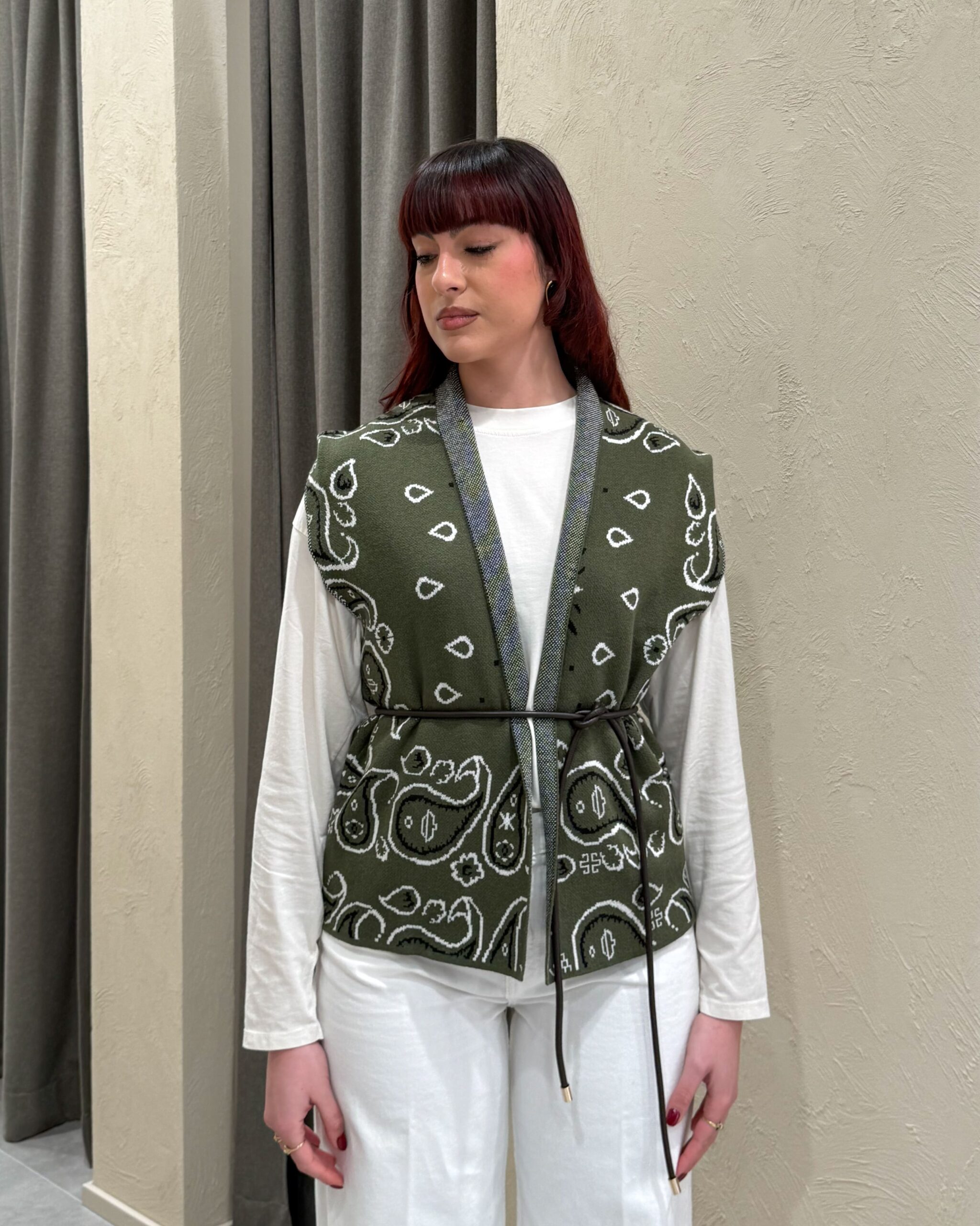 Il gilet della collezione primavera/estate di Kontatto si distingue per la sua lavorazione in maglia con fantasia jacquard. Presenta scollo sciallato, linea morbida e chiusura definita da una cinturina sottile che avvolge il punto vita.