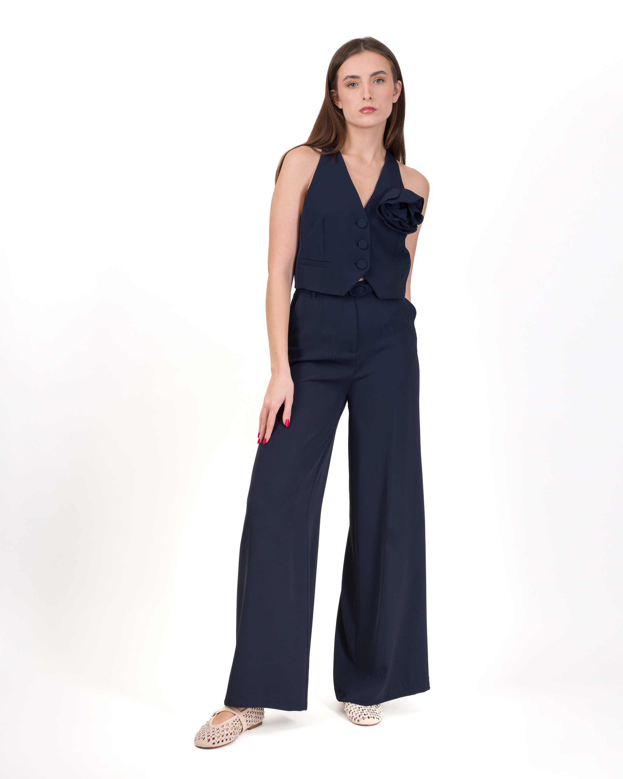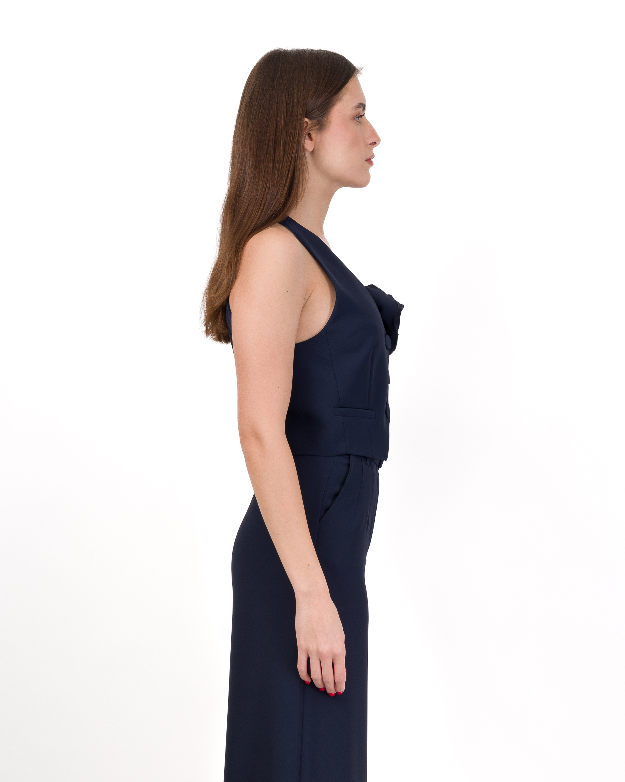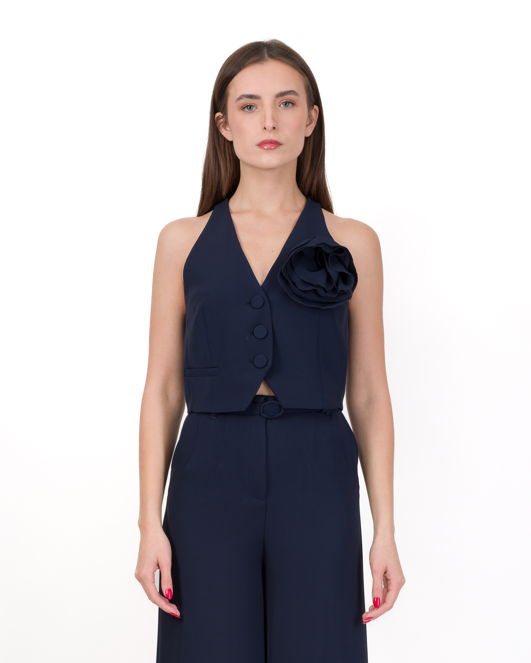 Il gilet in cady della collezione primavera/estate di Imperial presenta scollo a V e spalle scoperte. Chiusura monopetto a tre bottoni e tasche a filo anteriori. Maxi rosa applicata sul petto, realizzata nello stesso tessuto e removilbile, che dona volume e personalità al capo.