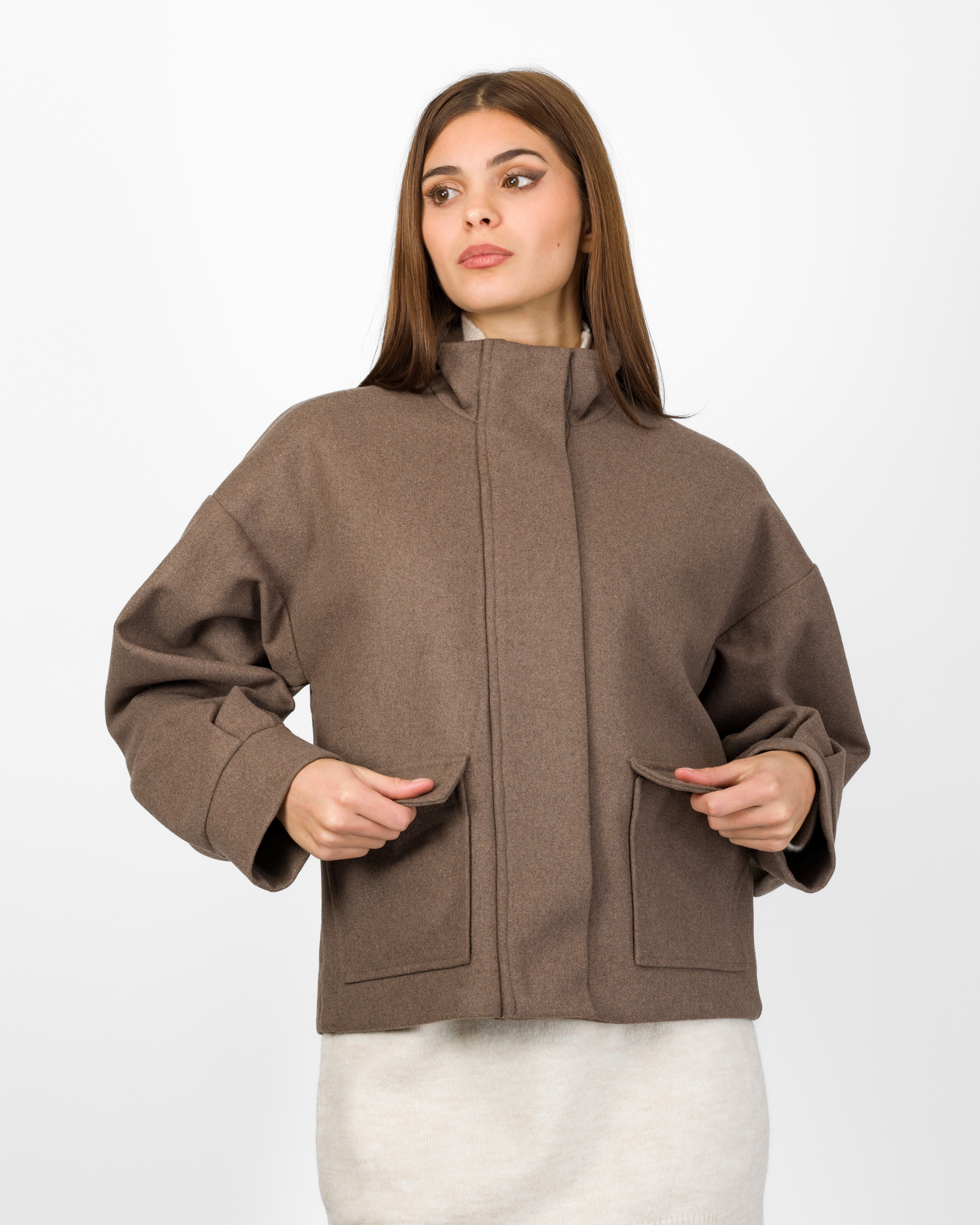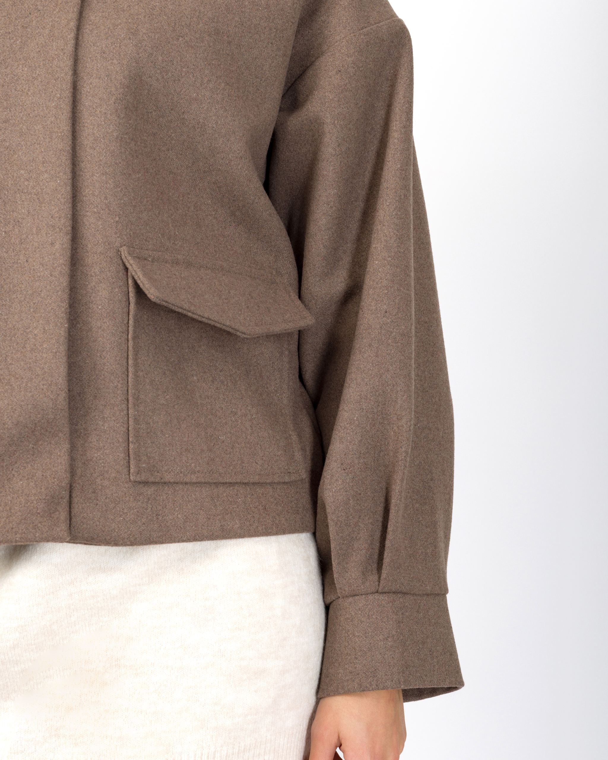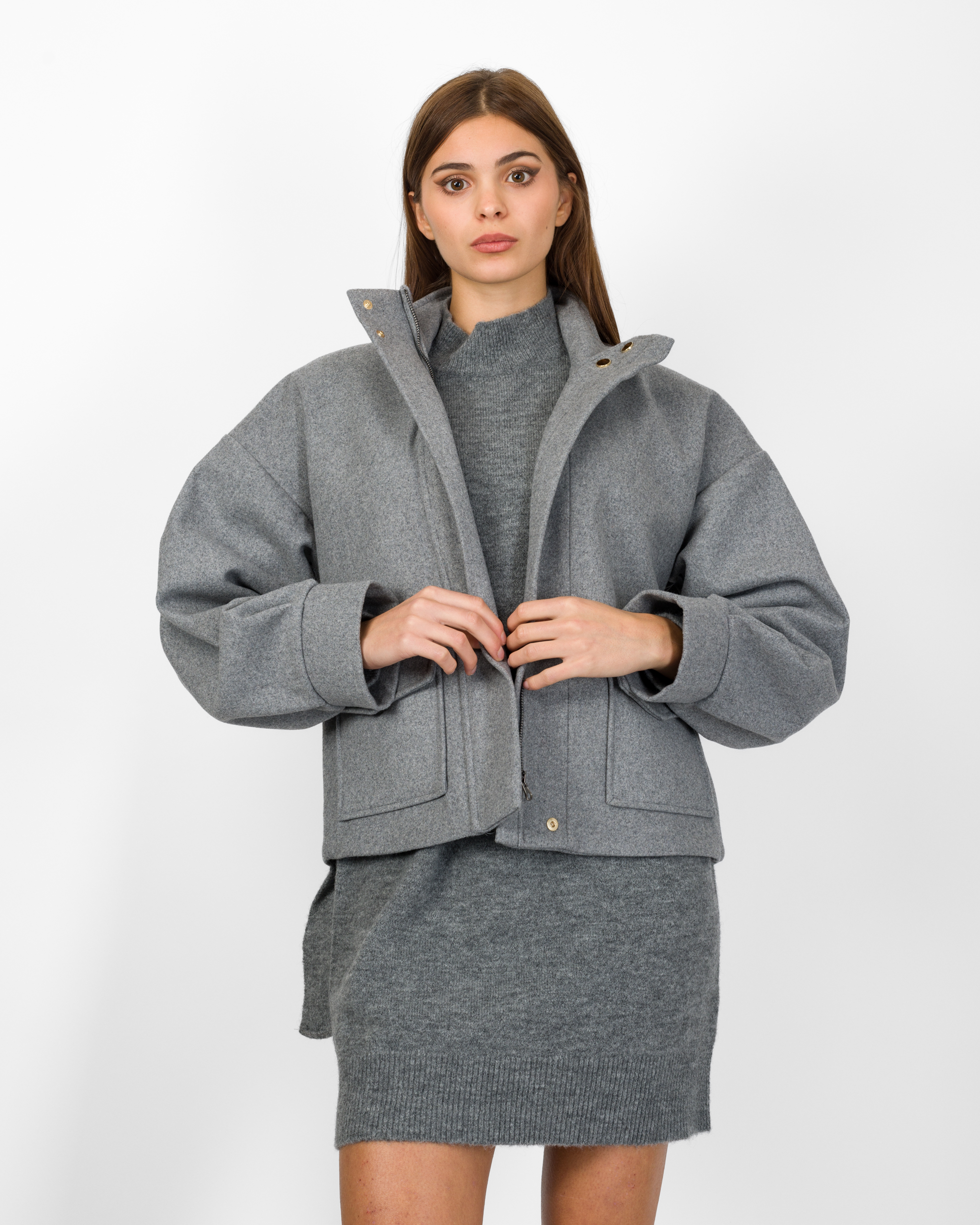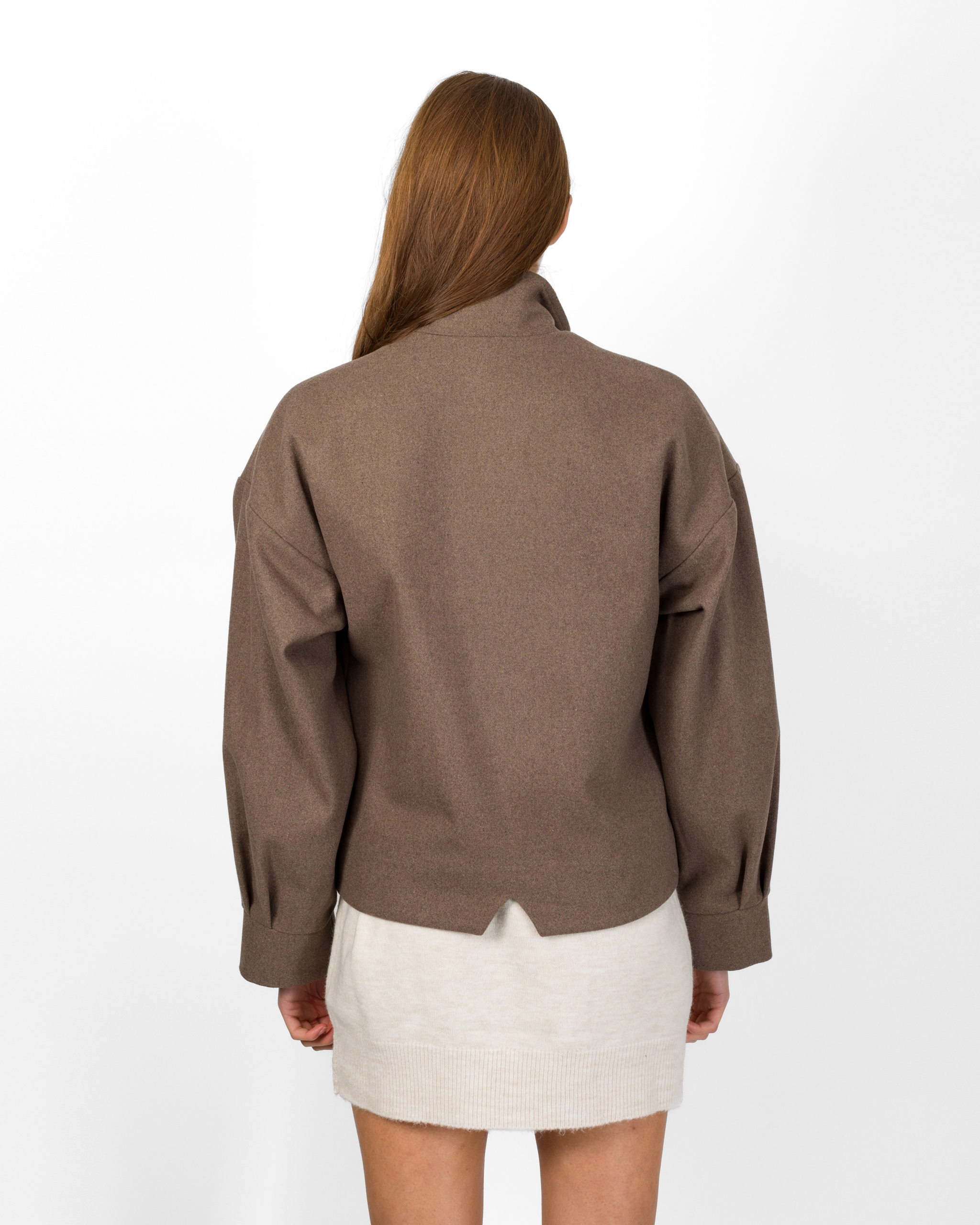 Il bomber in 50% lana della collezione autunno/inverno di Silence Limited punta su un’estetica minimal ma sofisticata. Il design moderno con collo alto strutturato, maniche lunghe ampie con polsino definito, le tasche applicate con patta e l’abbottonatura nascosta conferiscono al capo un tocco sartoriale.