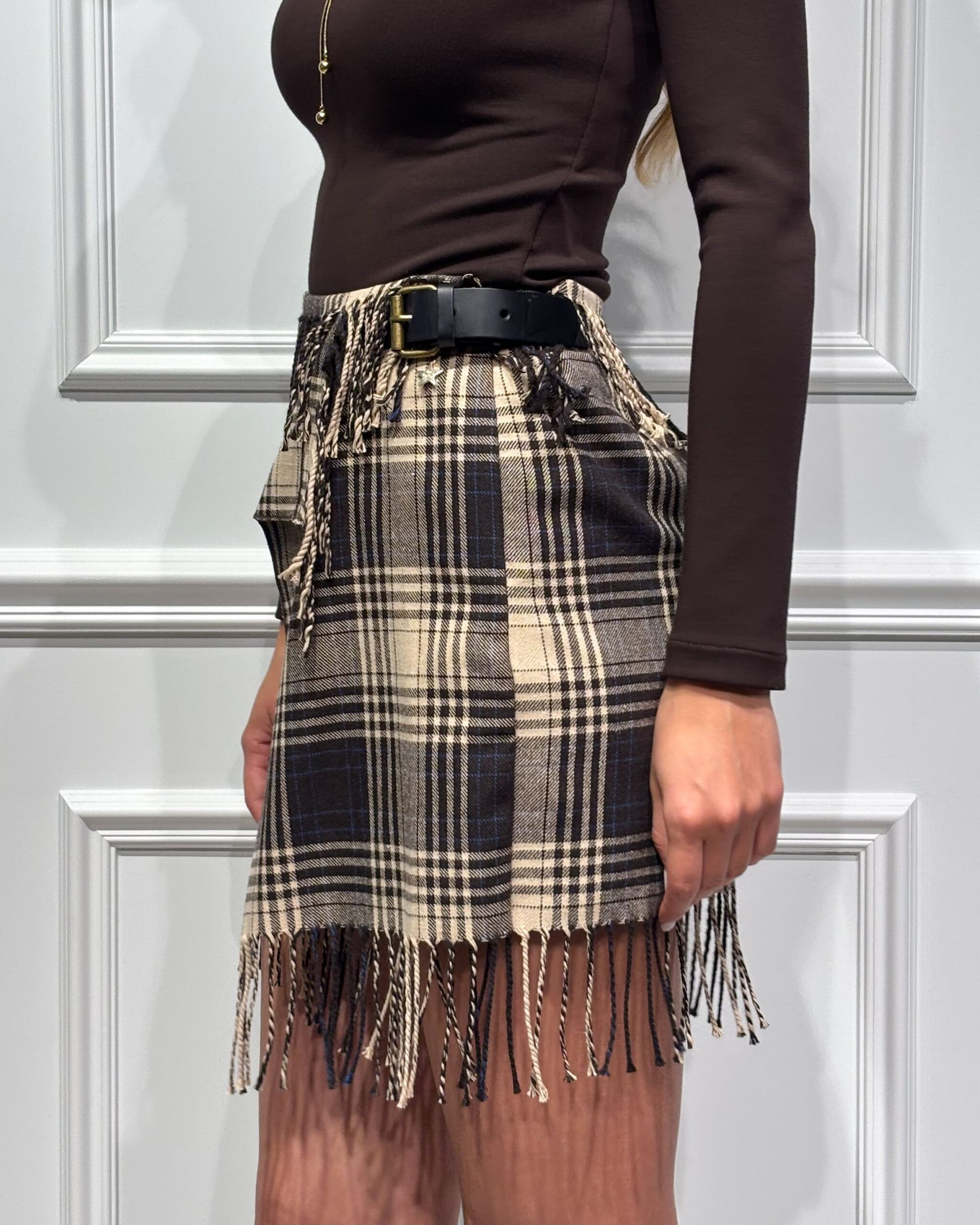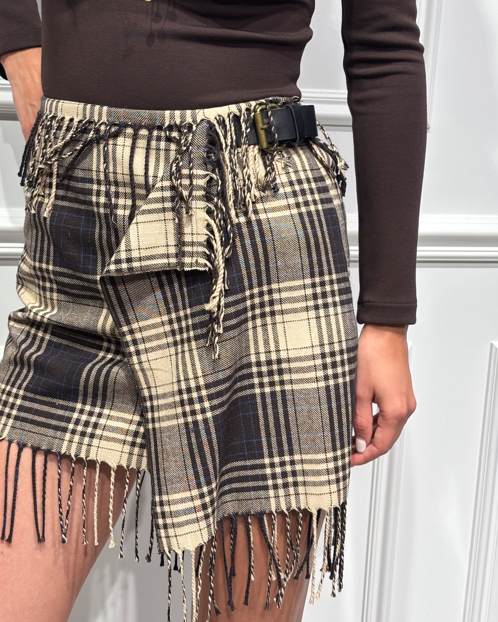 La minigonna misto lana della collezione autunno/inverno di Souvenir si distingue per la fantasia check multicolor ed il dettaglio di frange sul fondo che ne esaltano lo spirito contemporaneo. Chiusura laterale con fibbia metallica e motivo incrociato sul davanti.