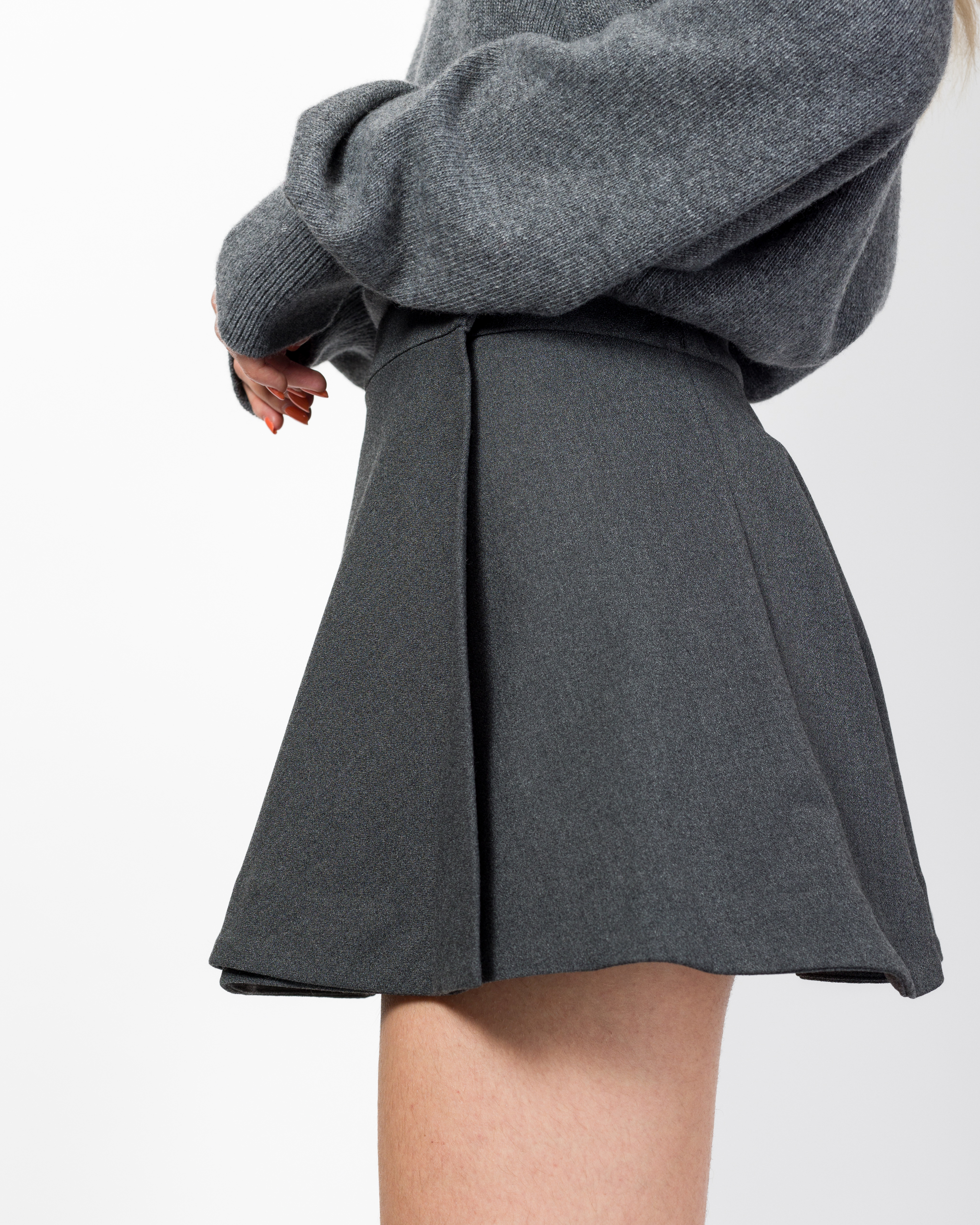 La gonna a ruota della collezione autunno/inverno di Eleh è caratterizzata dal design mini a portafoglio e presenta chiusura con bottone a pressione.