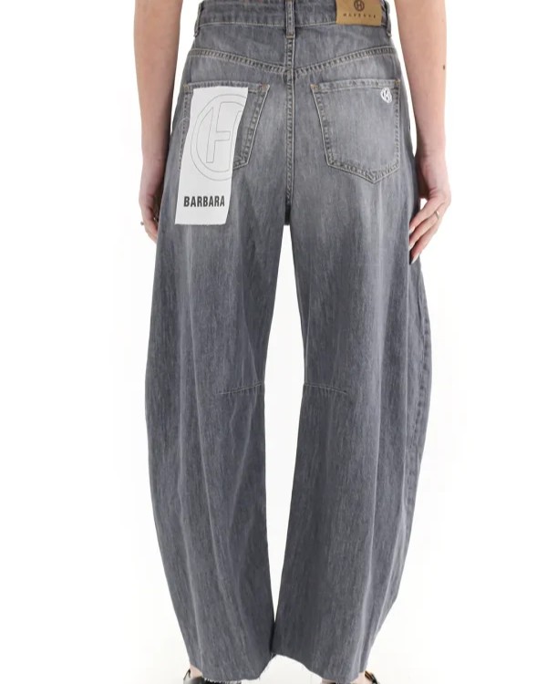 Il denim Barbara in tela leggera della collezione primavera/estate di Haveone è caratterizzato dal design ballon con piccole abrasioni, pinces alle ginocchia e orlo sul fondo a taglio vivo. Modello a cinque tasche e chiusura con bottone metallico e zip a scomparsa.