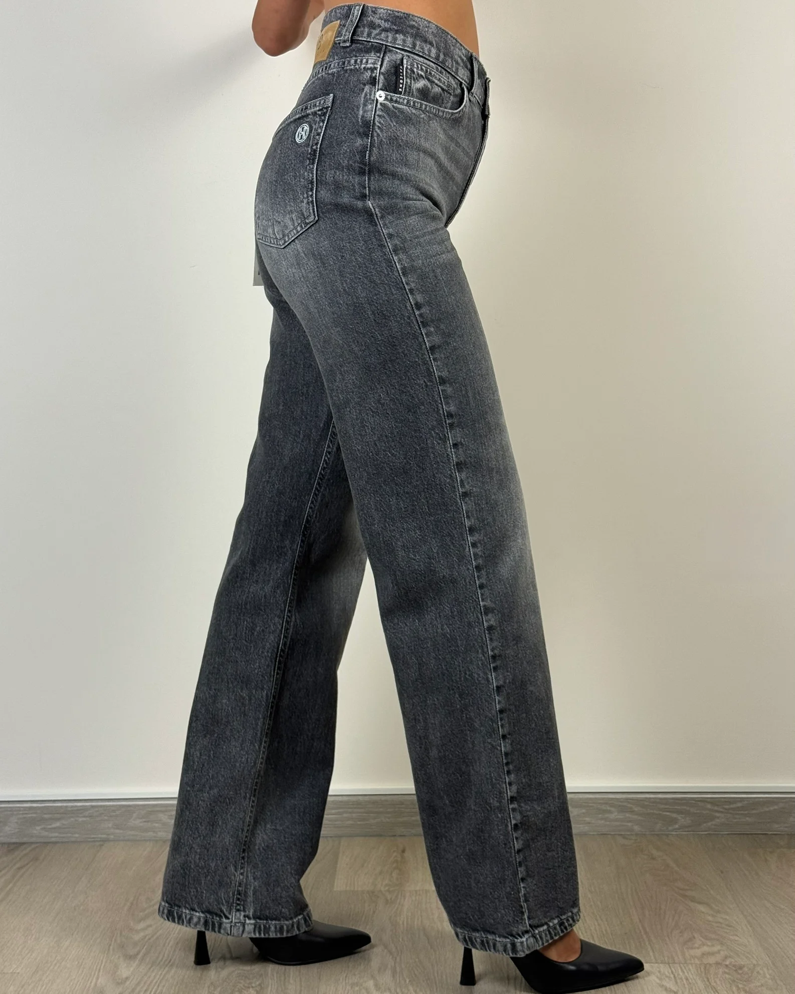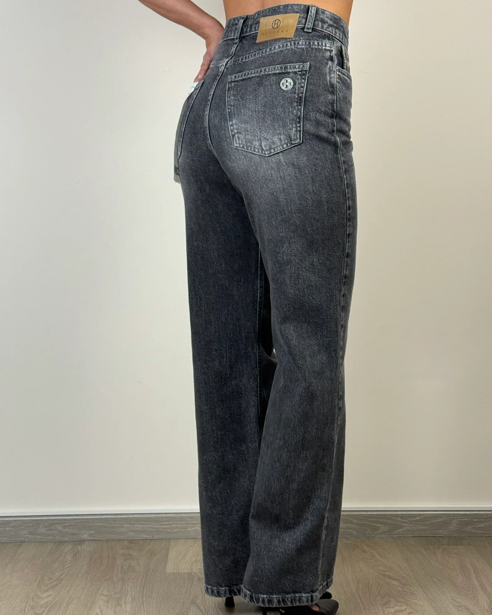 Il denim London della collezione autunno/inverno di Haveone è caratterizzato dal design straight-leg a vita alta con passanti. Modello a cinque tasche, chiusura anteriore con bottone metallico e zip a scomparsa.