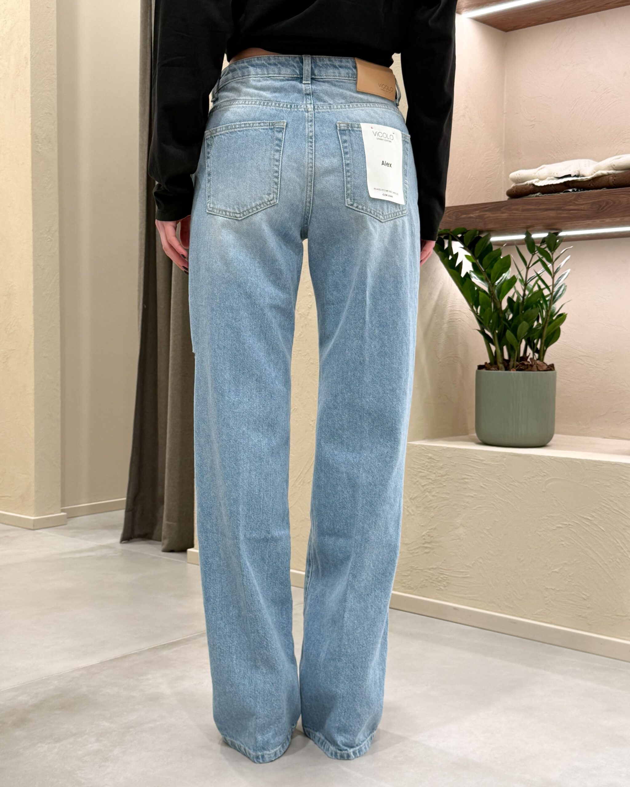 Il denim modello Alex della collezione primavera/estate di Vicolo è caratterizzato dal design straight-leg a vita media con rotture a taglio vivo. Modello non elasticizzato. Chiusura frontale con zip e bottone metallico.
