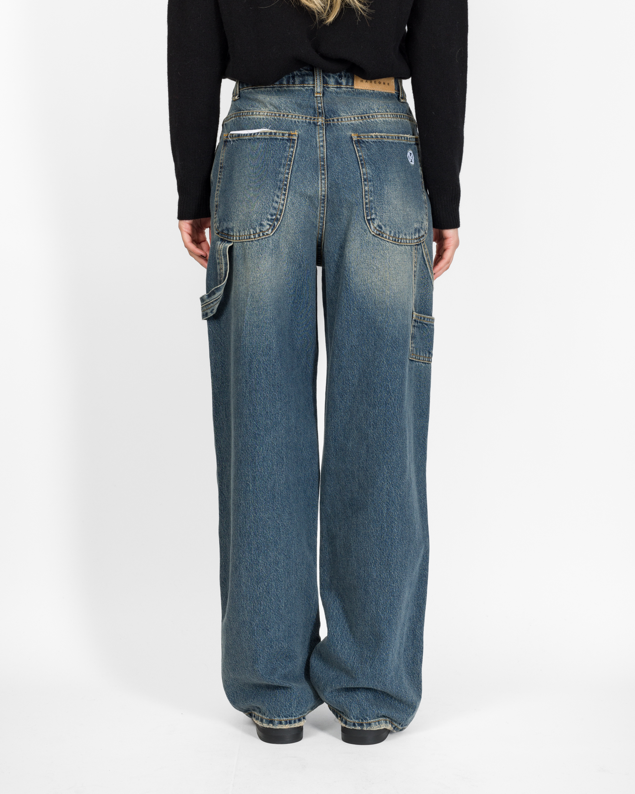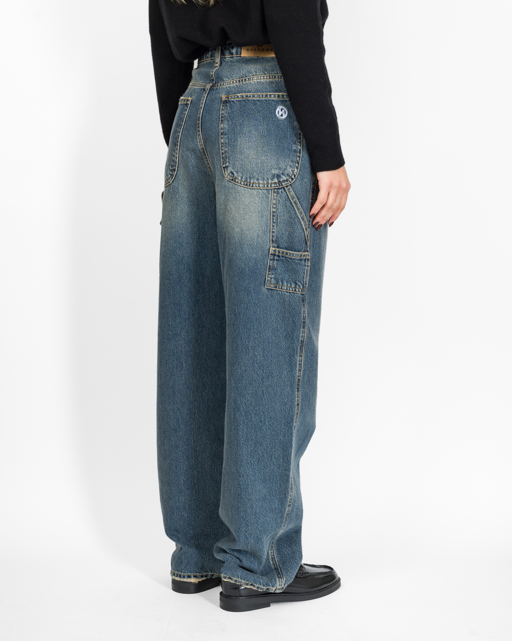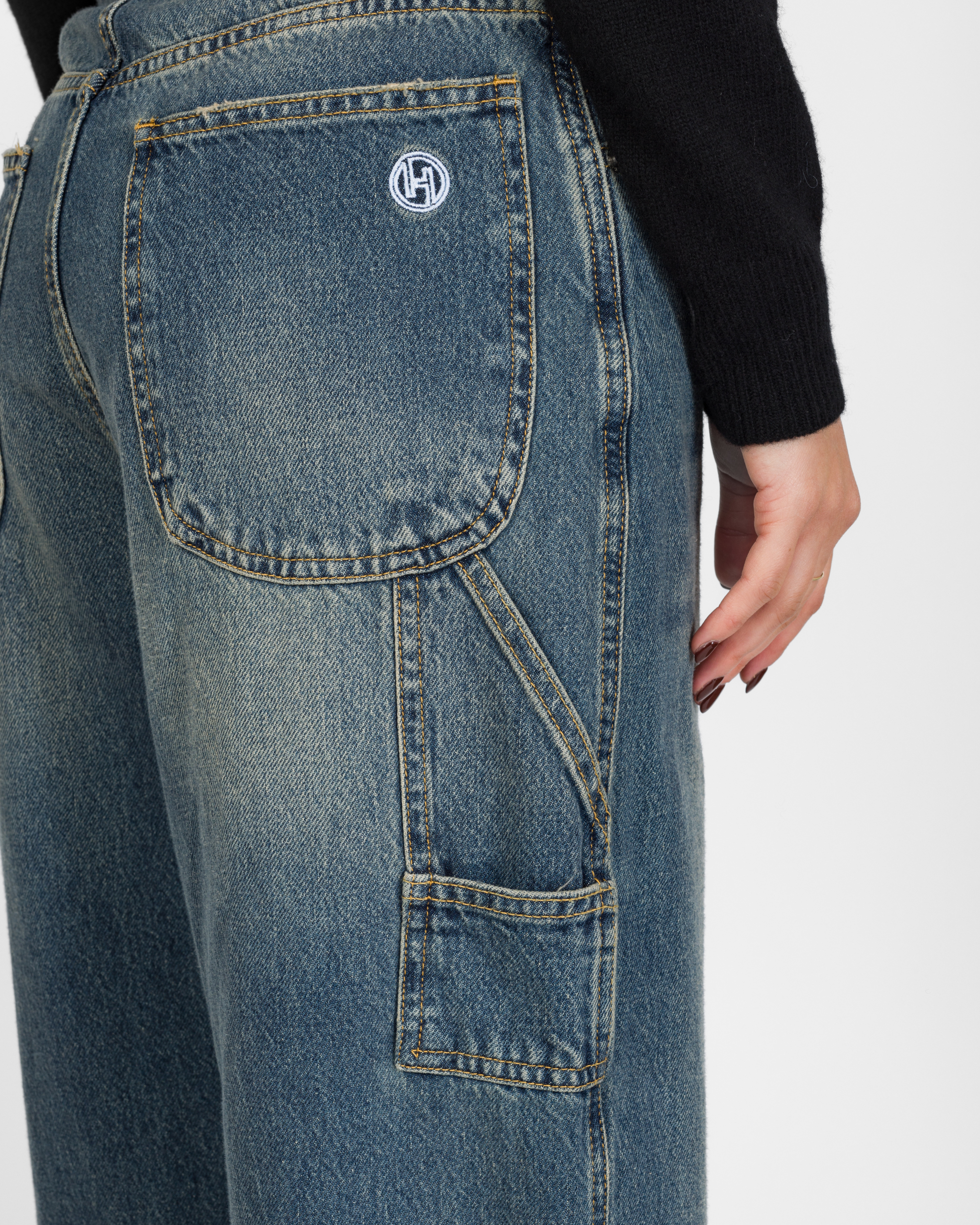 Il denim modello Detroit della collezione autunno/inverno di Haveone è caratterizzato dal design worker wide-leg a vita alta e presenta lavaggio con leggero delavè che dona un effetto naturalmente consumato. Chiusura con bottone e zip a scomparsa. Modello a cinque tasche.