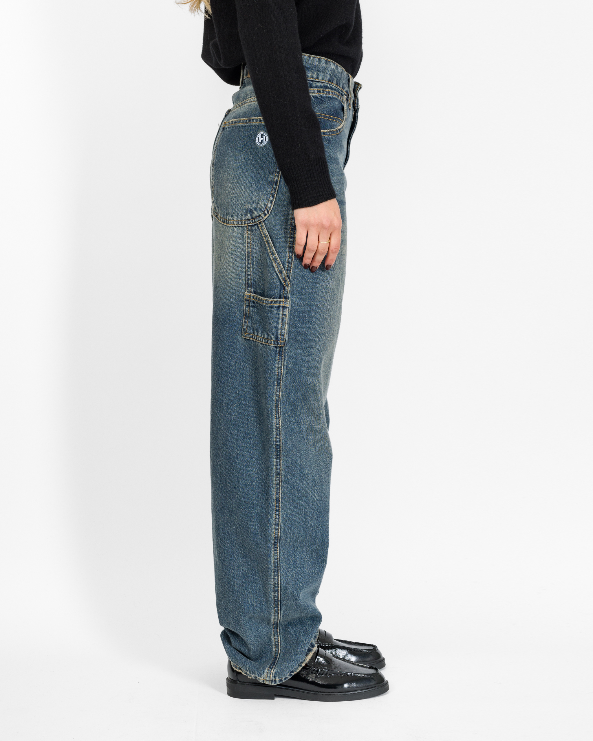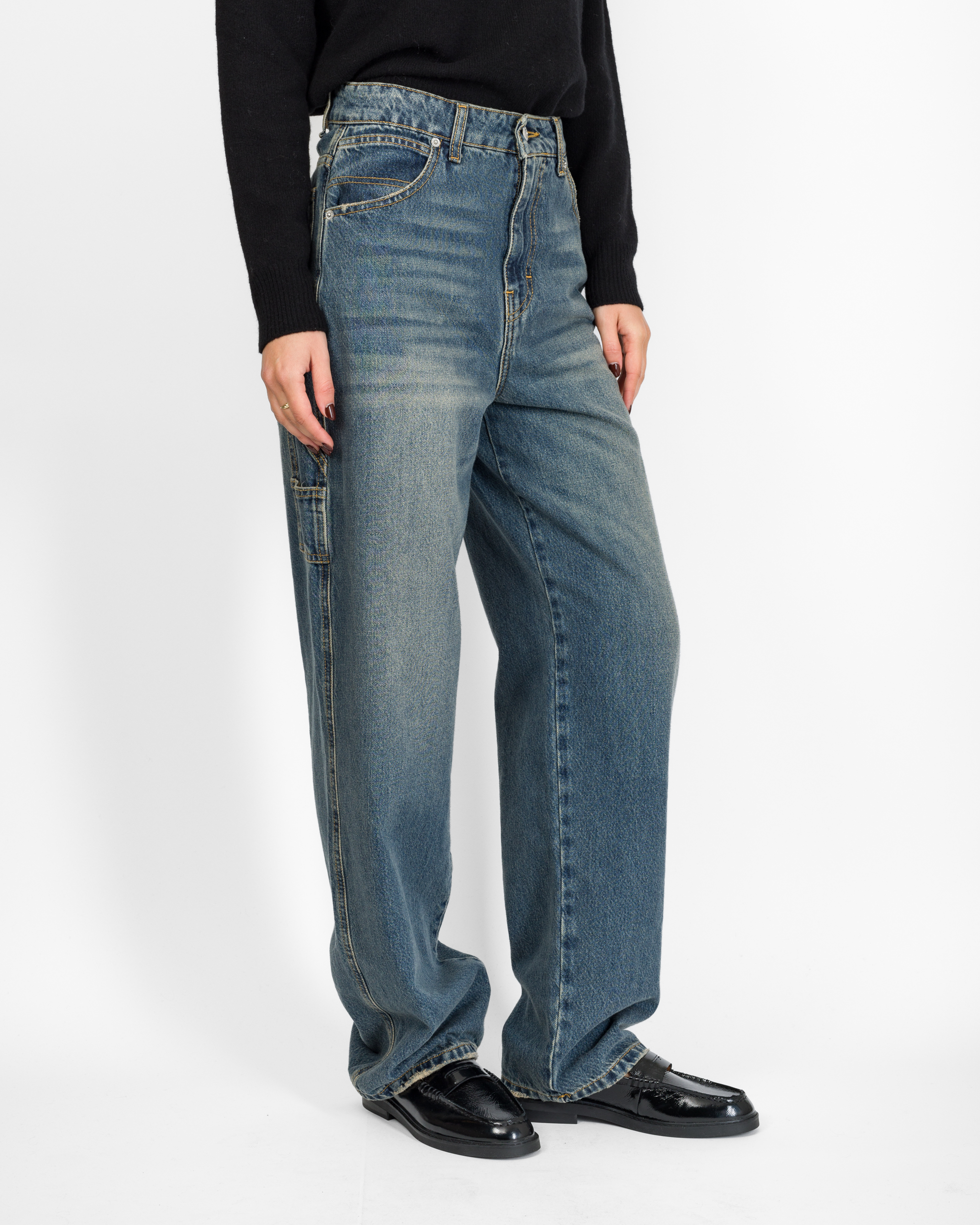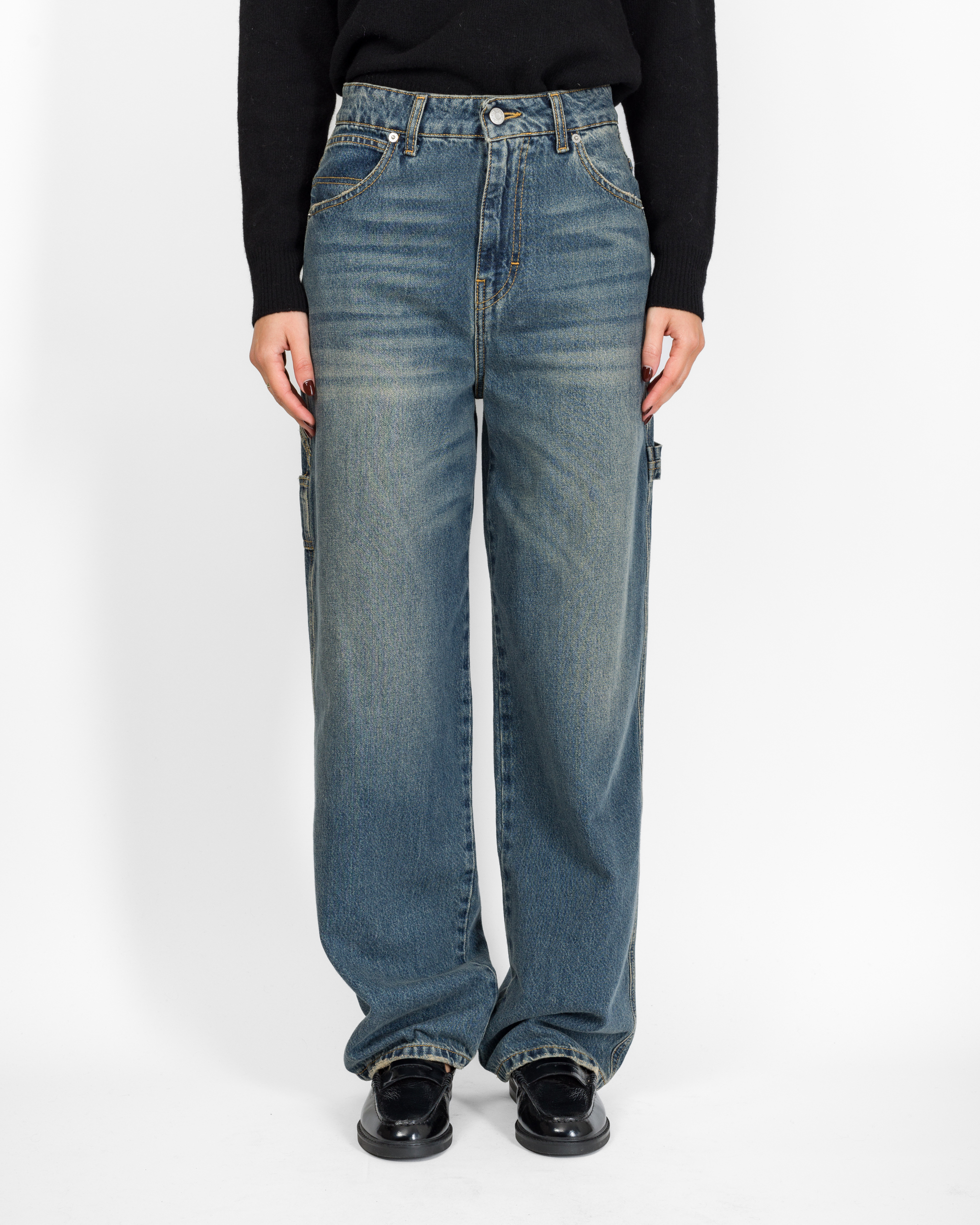 Il denim modello Detroit della collezione autunno/inverno di Haveone è caratterizzato dal design worker wide-leg a vita alta e presenta lavaggio con leggero delavè che dona un effetto naturalmente consumato. Chiusura con bottone e zip a scomparsa. Modello a cinque tasche.