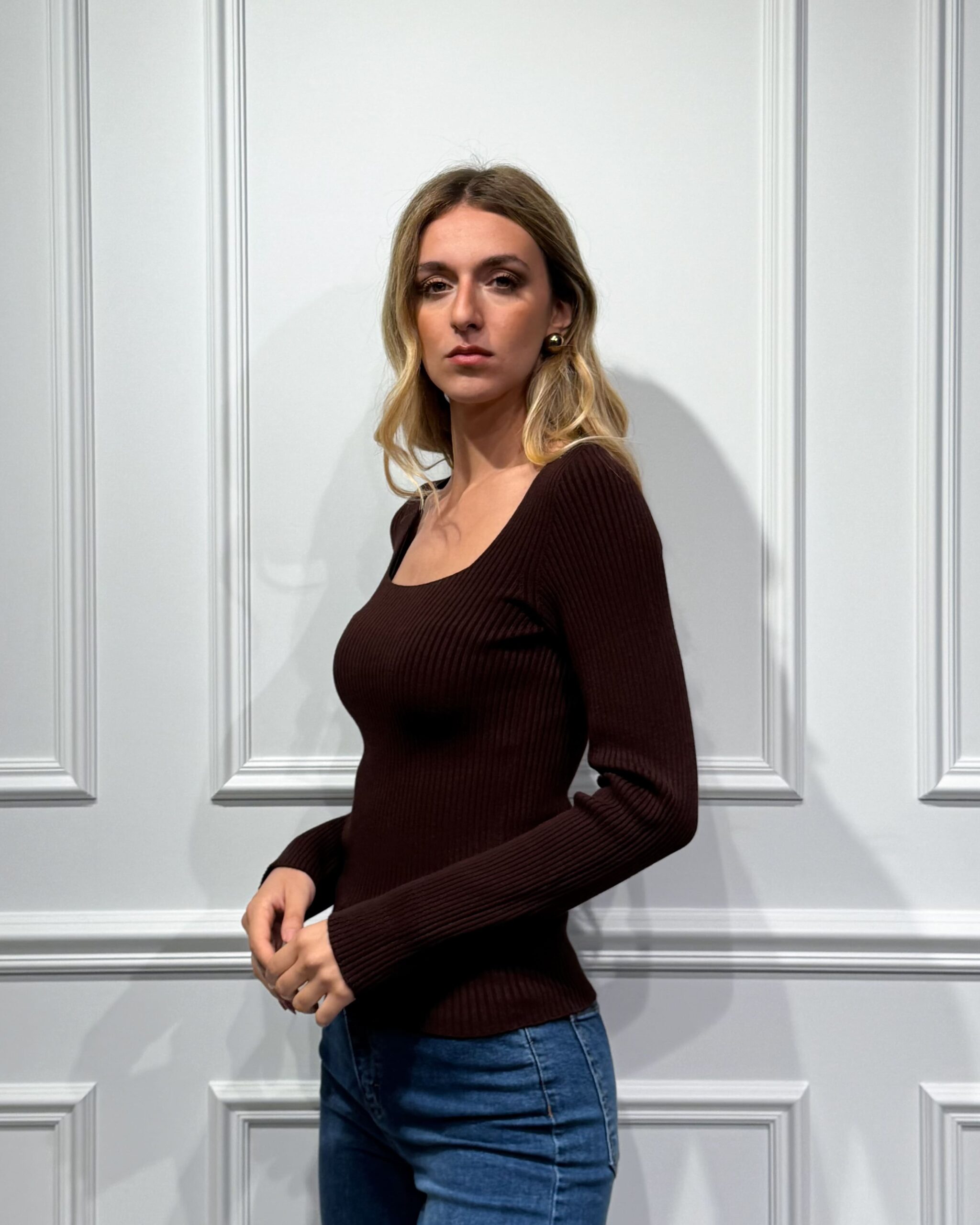 La maglia della collezione autunno/inverno di Kontatto è caratterizzata dalla lavorazione a costine e presenta scollo quadro. Vestibilità aderente e lunghezza al fianco.