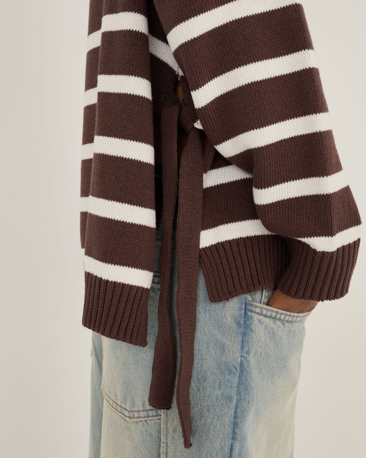 La maglia polo della collezione primavera/estate di Souvenir è caratterizzata dalla lavorazione in maglia a righe orizzontali a contrasto. Presenta colletto classico con scollo a V senza bottoni, maniche lunghe con spalla leggermente scesa e polsini a coste. I lacci laterali rappresentano il dettaglio distintivo e la vestibilità è morbida e rilassata.