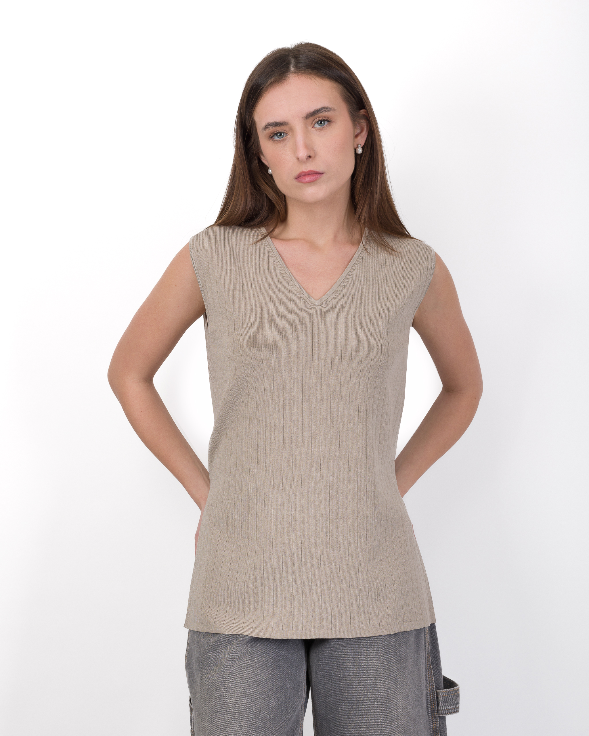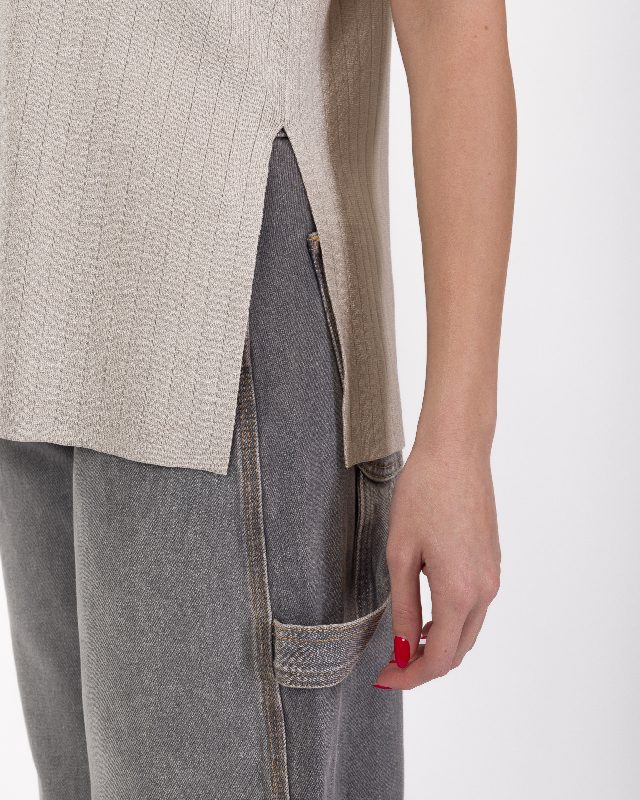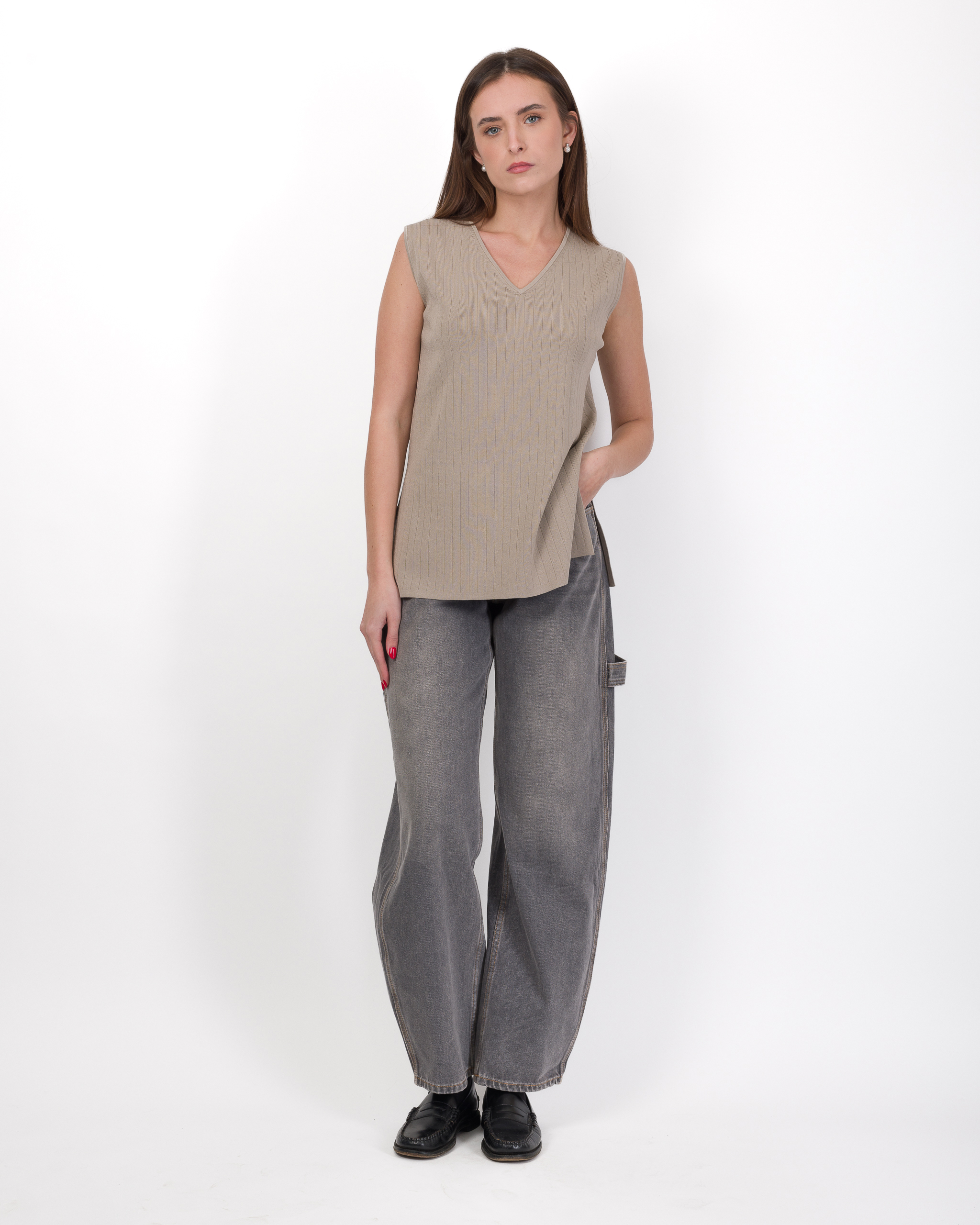 La maglia smanicata della collezione primavera/estate di Eleh si distingue per il design lineare e contemporaneo. Dotata di scollo a V e spalla ampia, presenta una vestibilità morbida. La lavorazione a coste verticali aggiunge profondità visiva, mentre gli spacchi laterali valorizzano il movimento del capo.