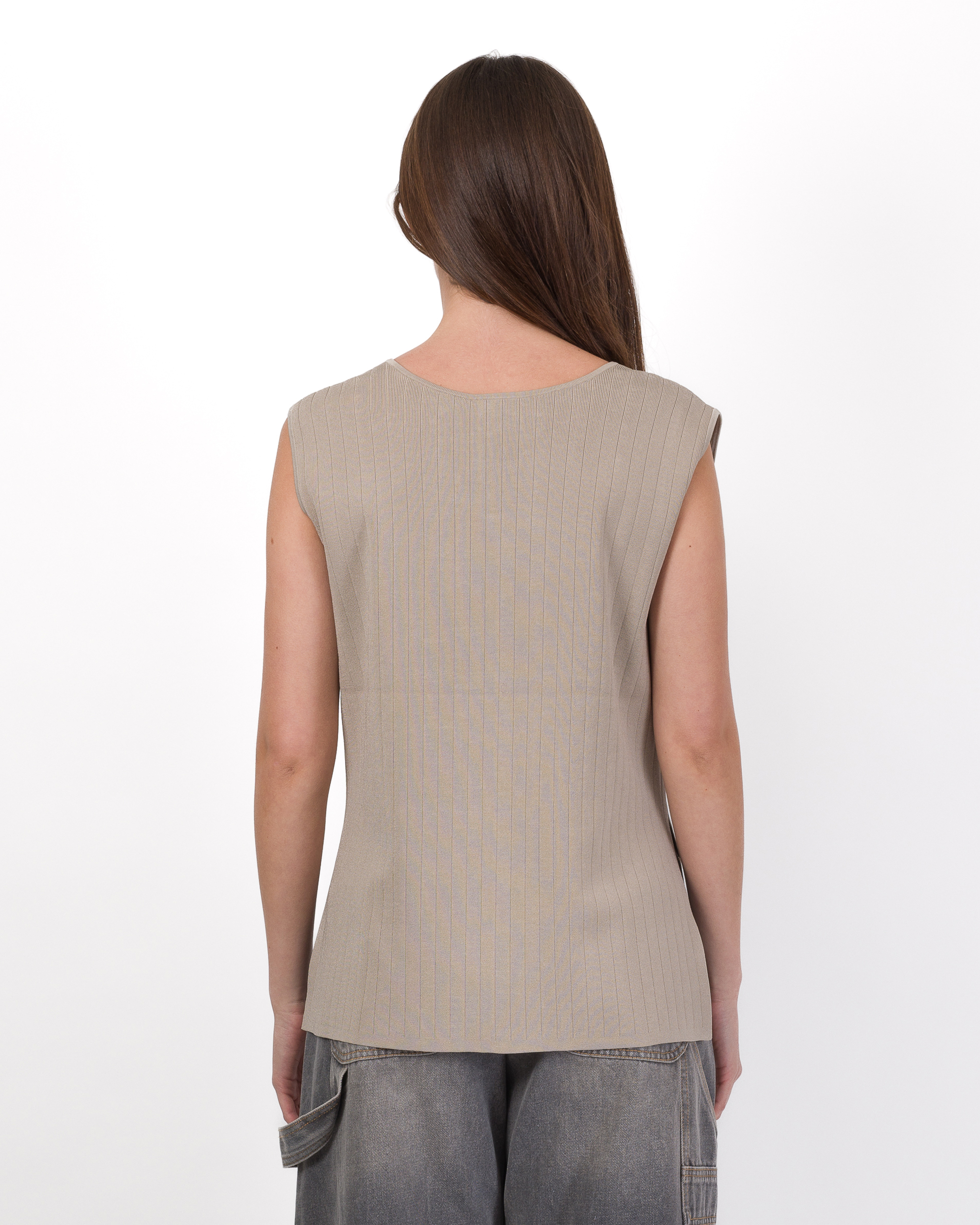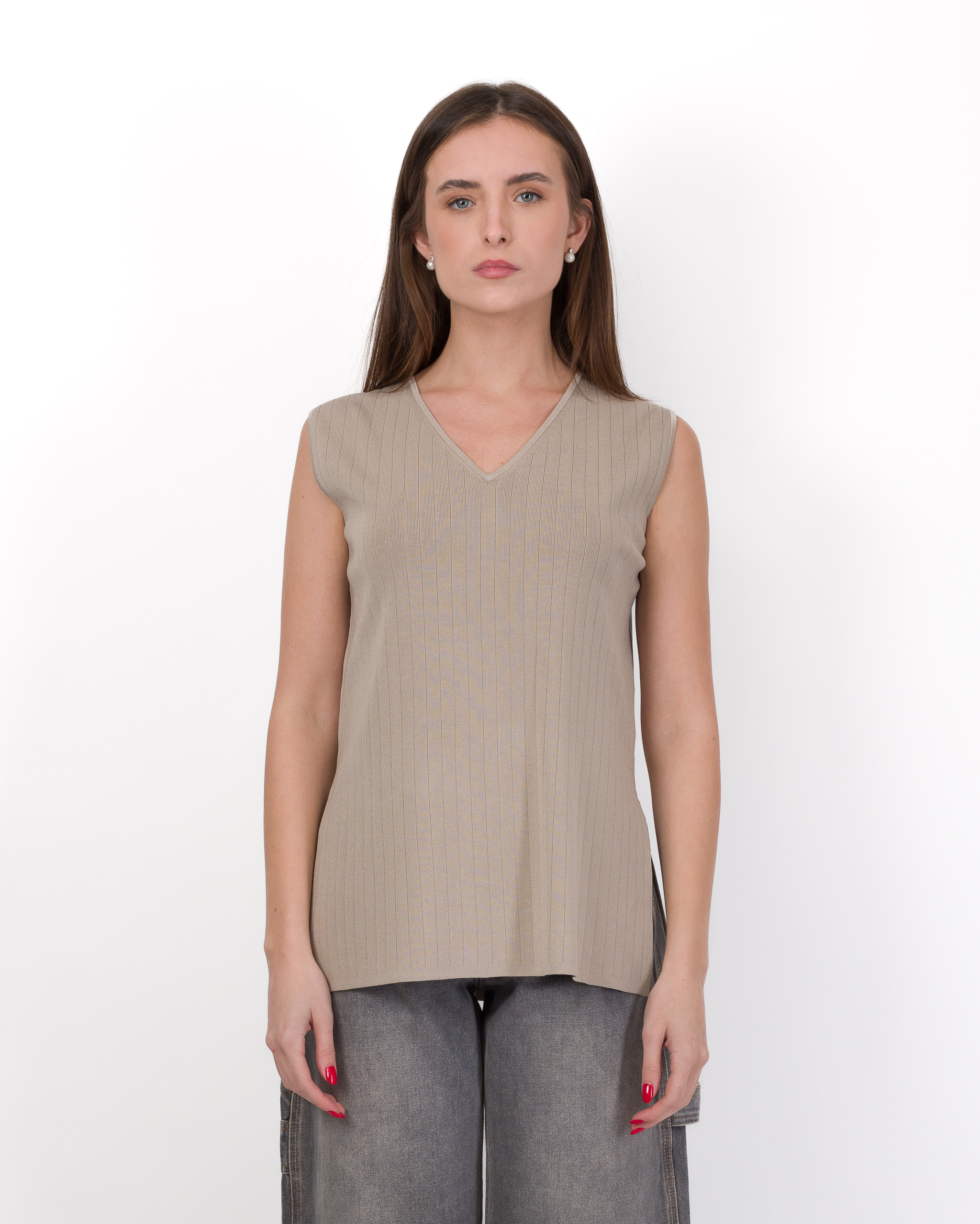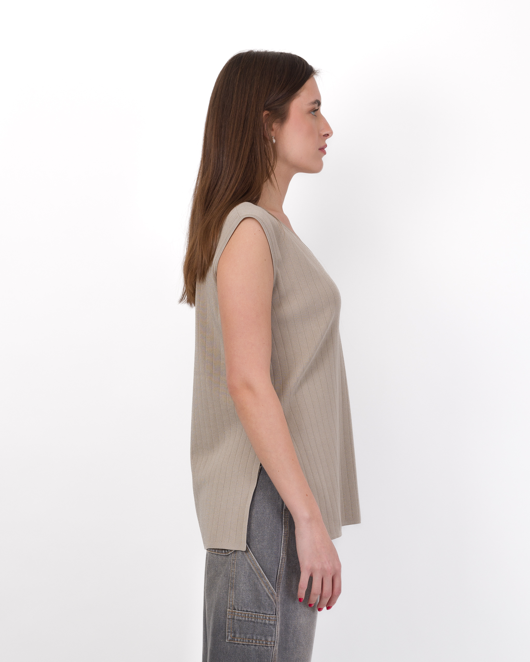 La maglia smanicata della collezione primavera/estate di Eleh si distingue per il design lineare e contemporaneo. Dotata di scollo a V e spalla ampia, presenta una vestibilità morbida. La lavorazione a coste verticali aggiunge profondità visiva, mentre gli spacchi laterali valorizzano il movimento del capo.