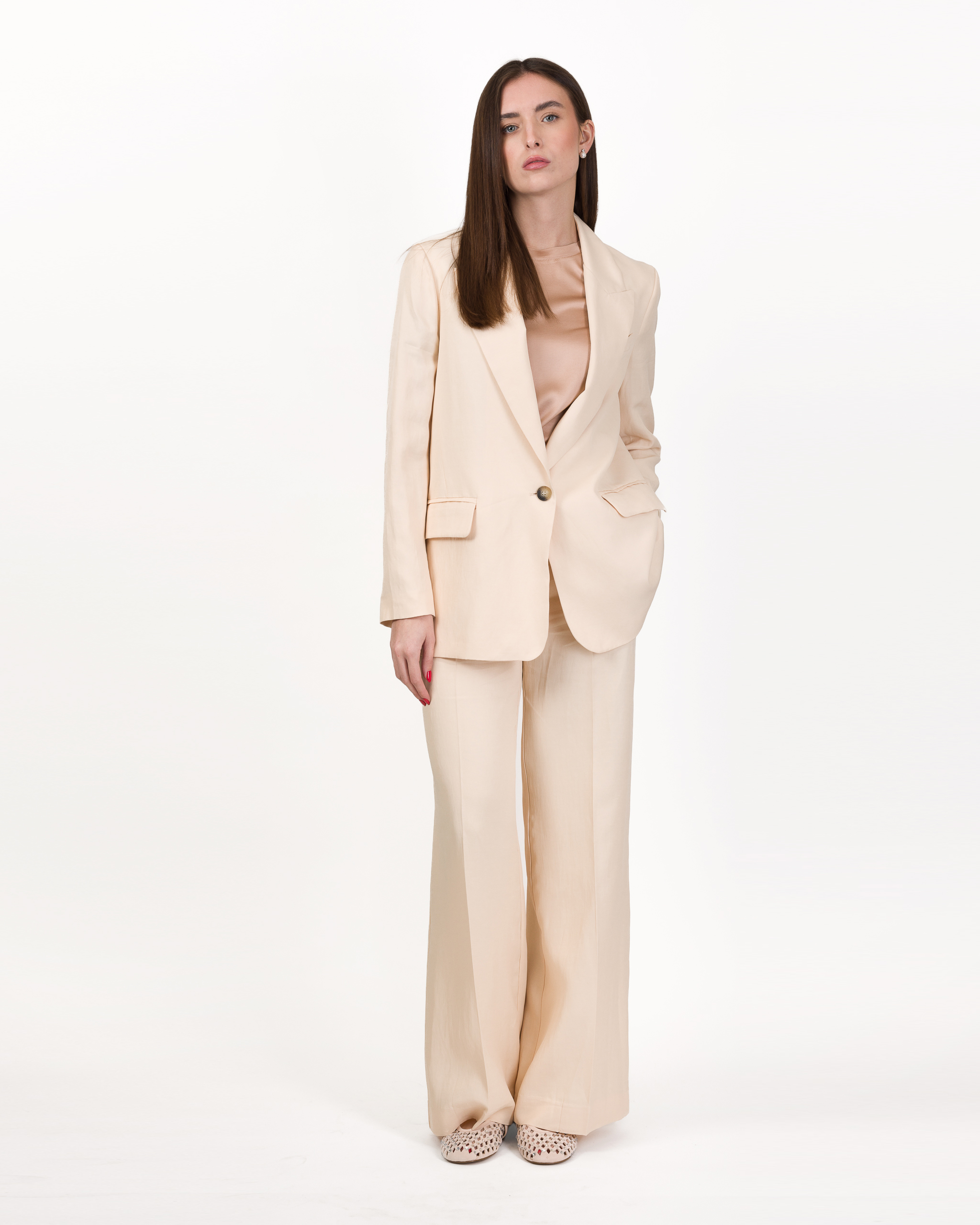 Tailleur oversize in un tessuto brillante: eleganza e modernità per un look sofisticato e di tendenza.