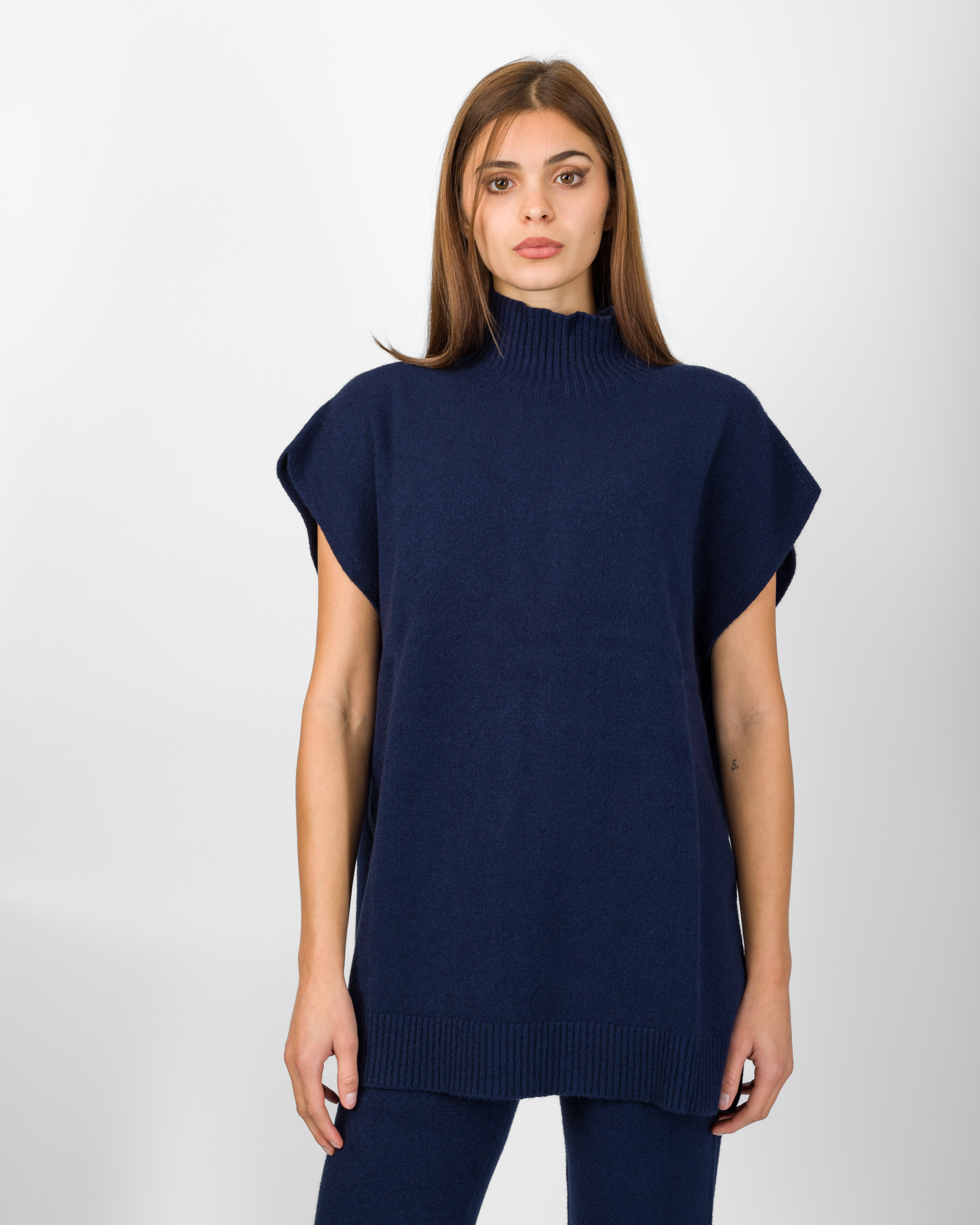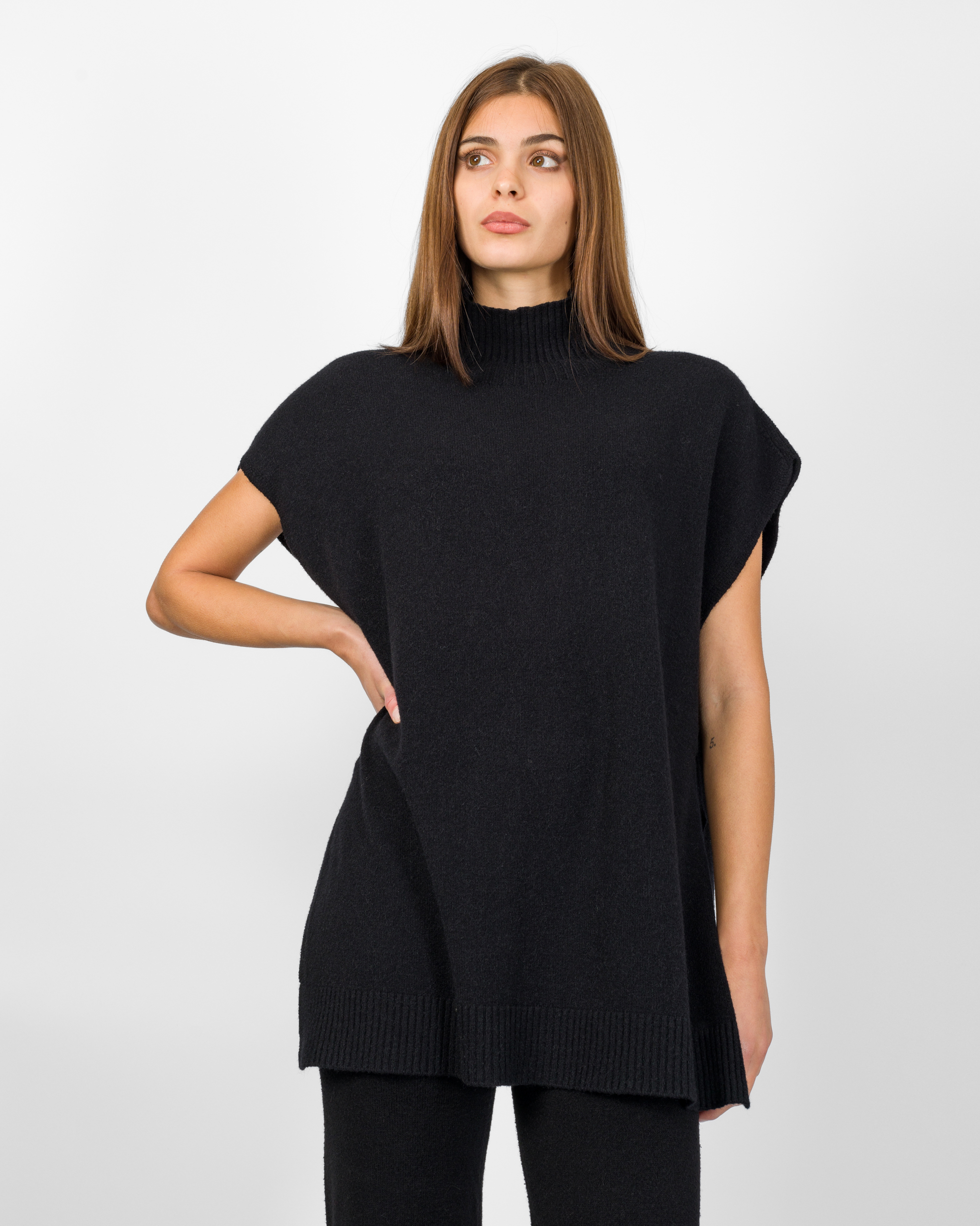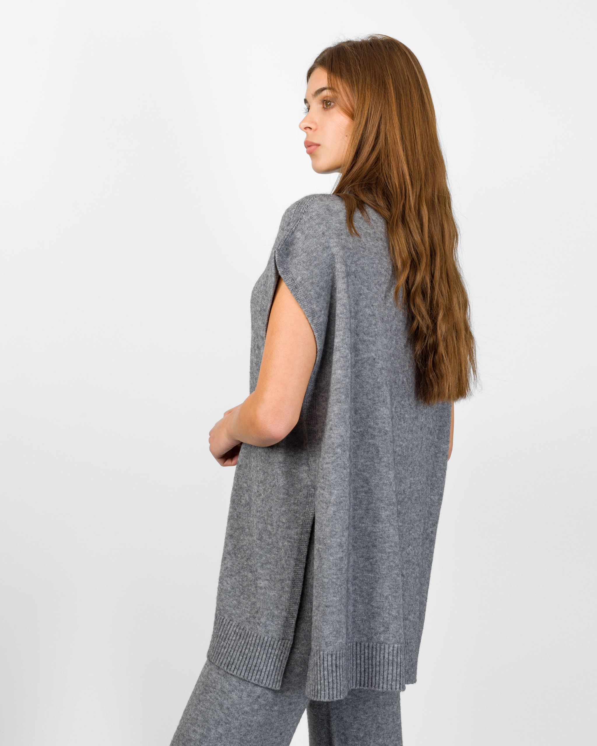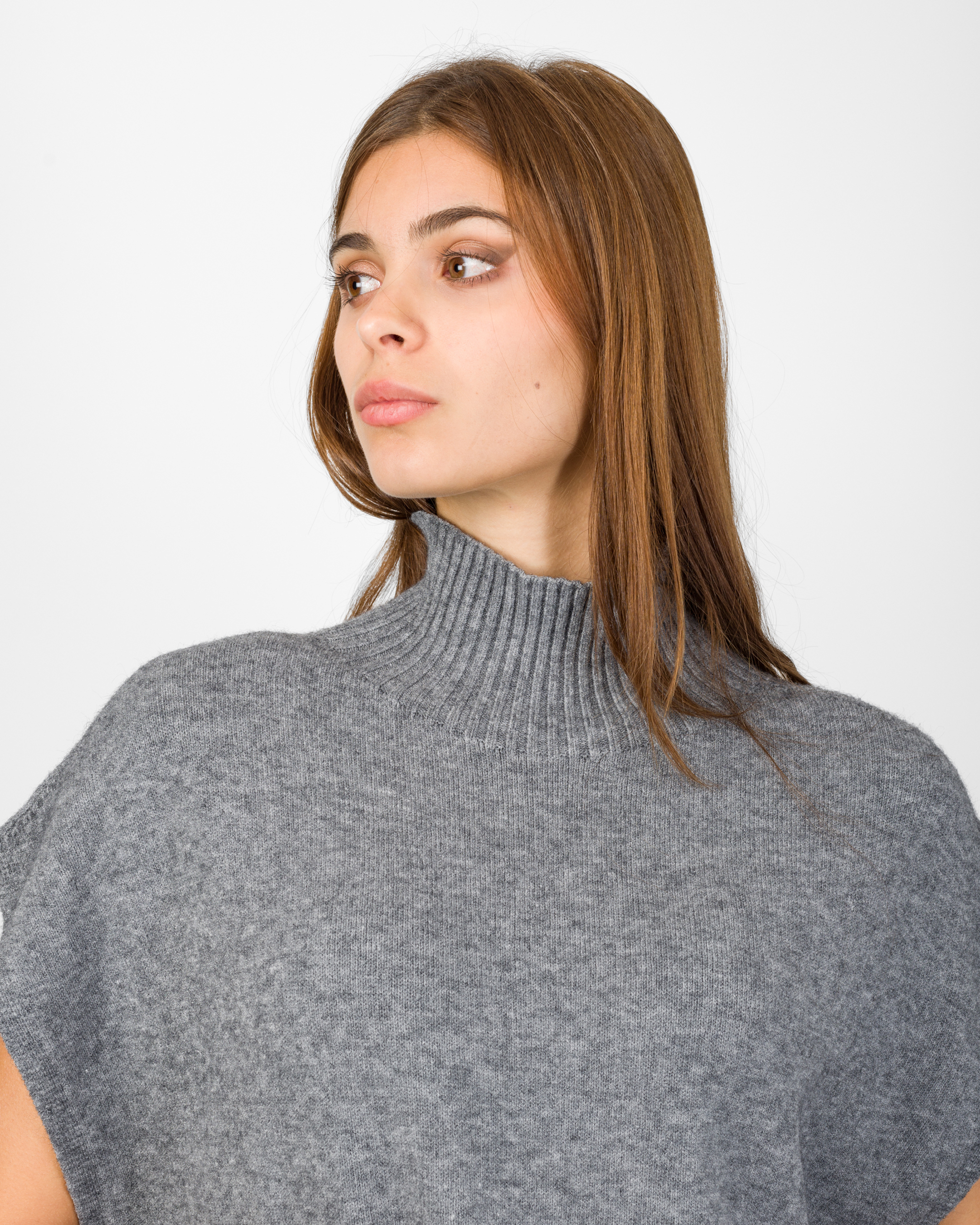 Il poncho della collezione autunno/inverno di Kontatto rappresenta l’alternativa sofisticata al coordinato tradizionale. Smanicato e con spalla scesa, si distingue per la linea morbida ed i delicati spacchetti laterali che ne accentuano il movimento.