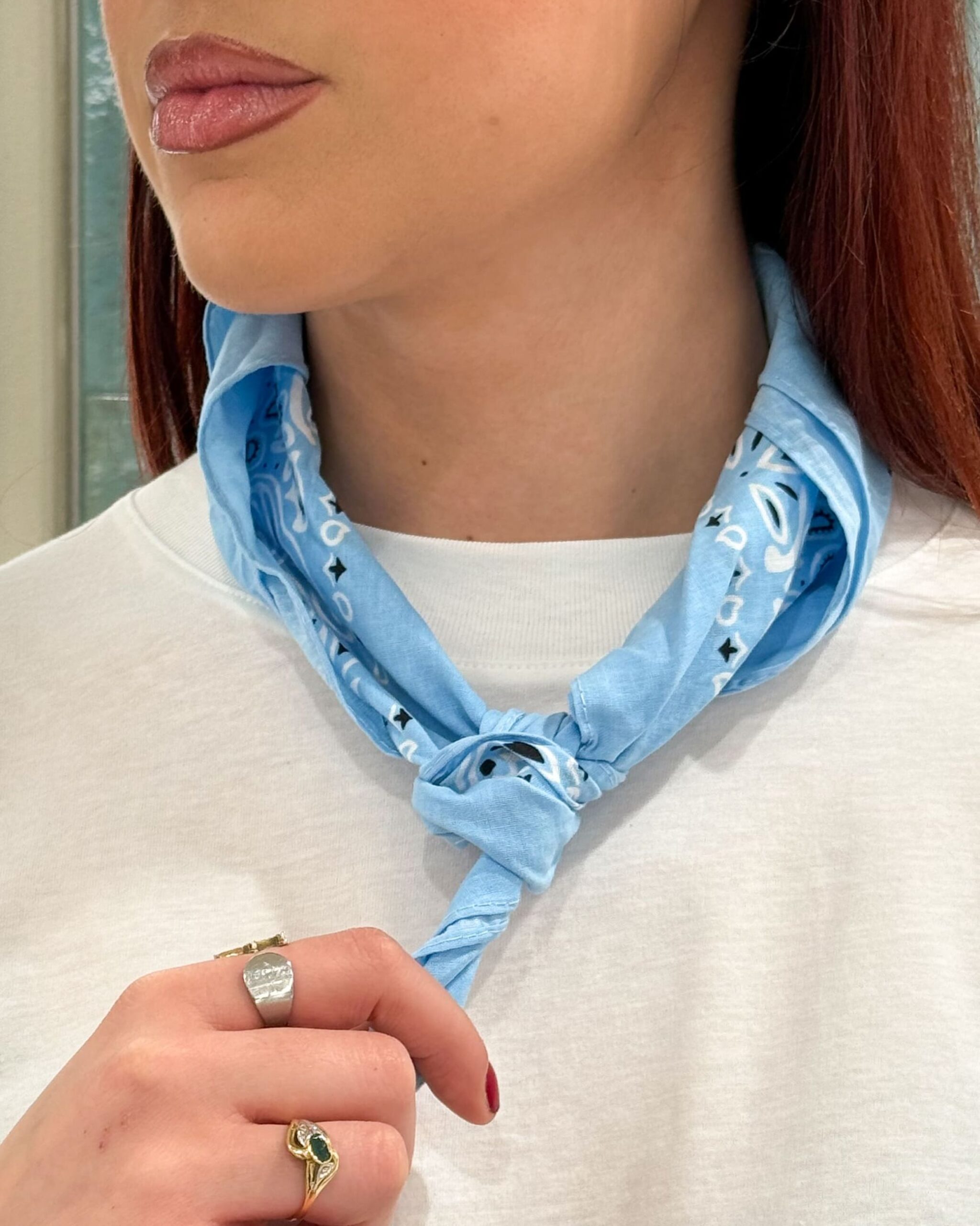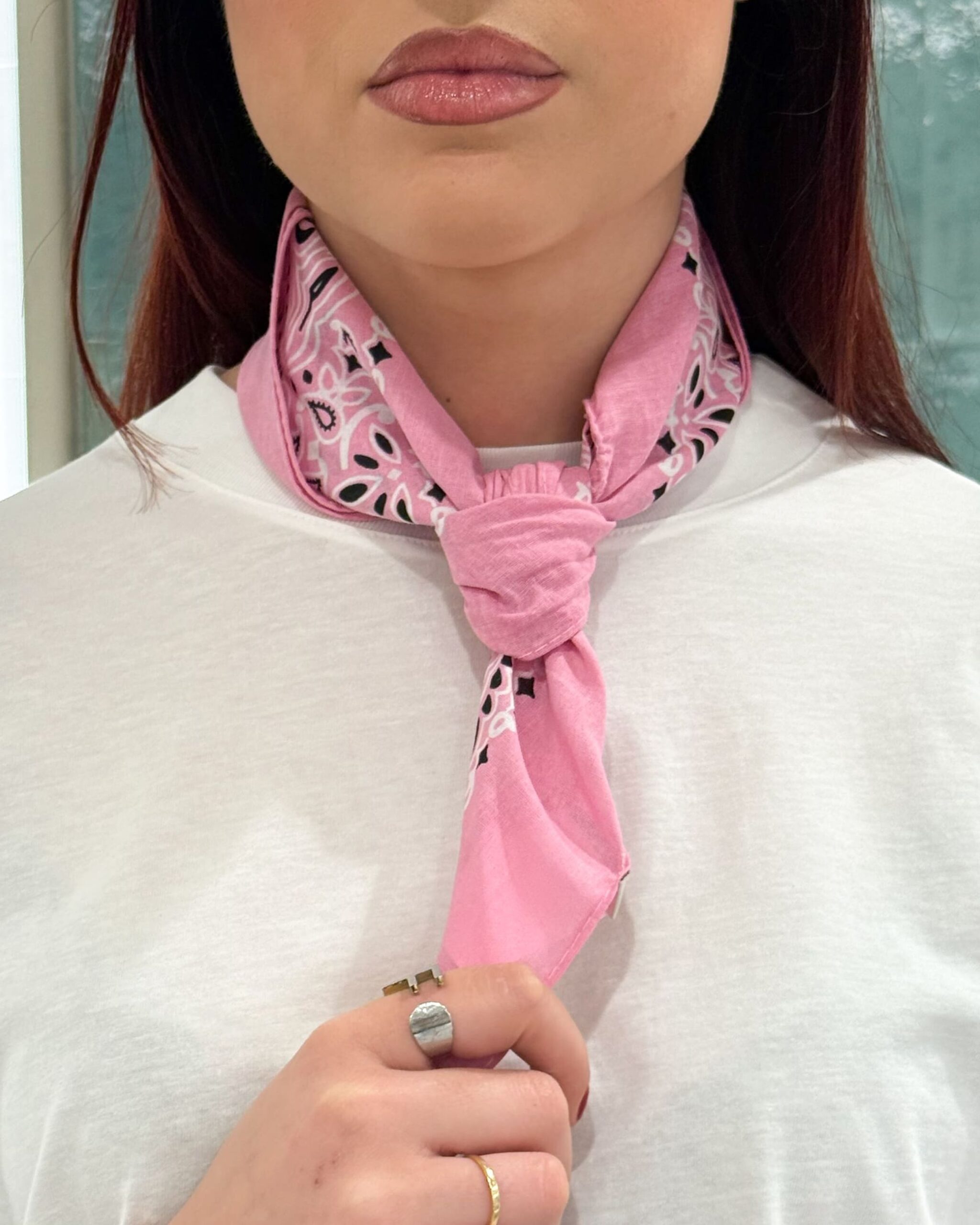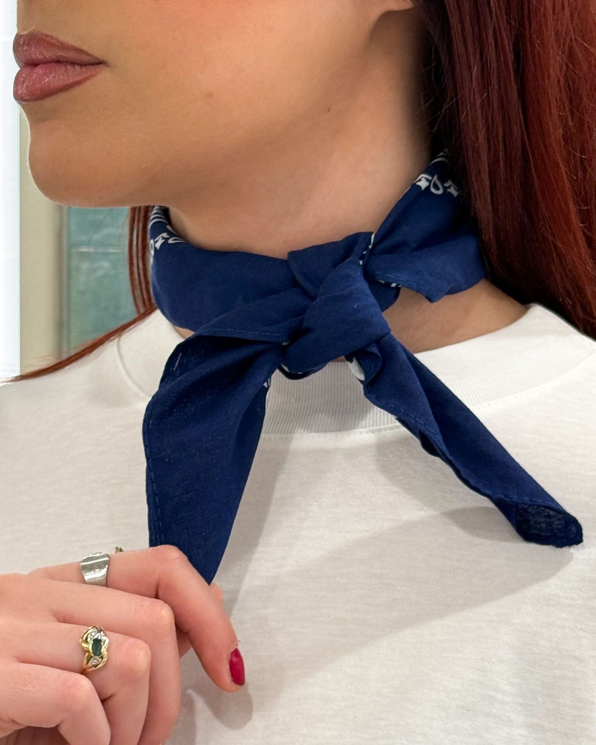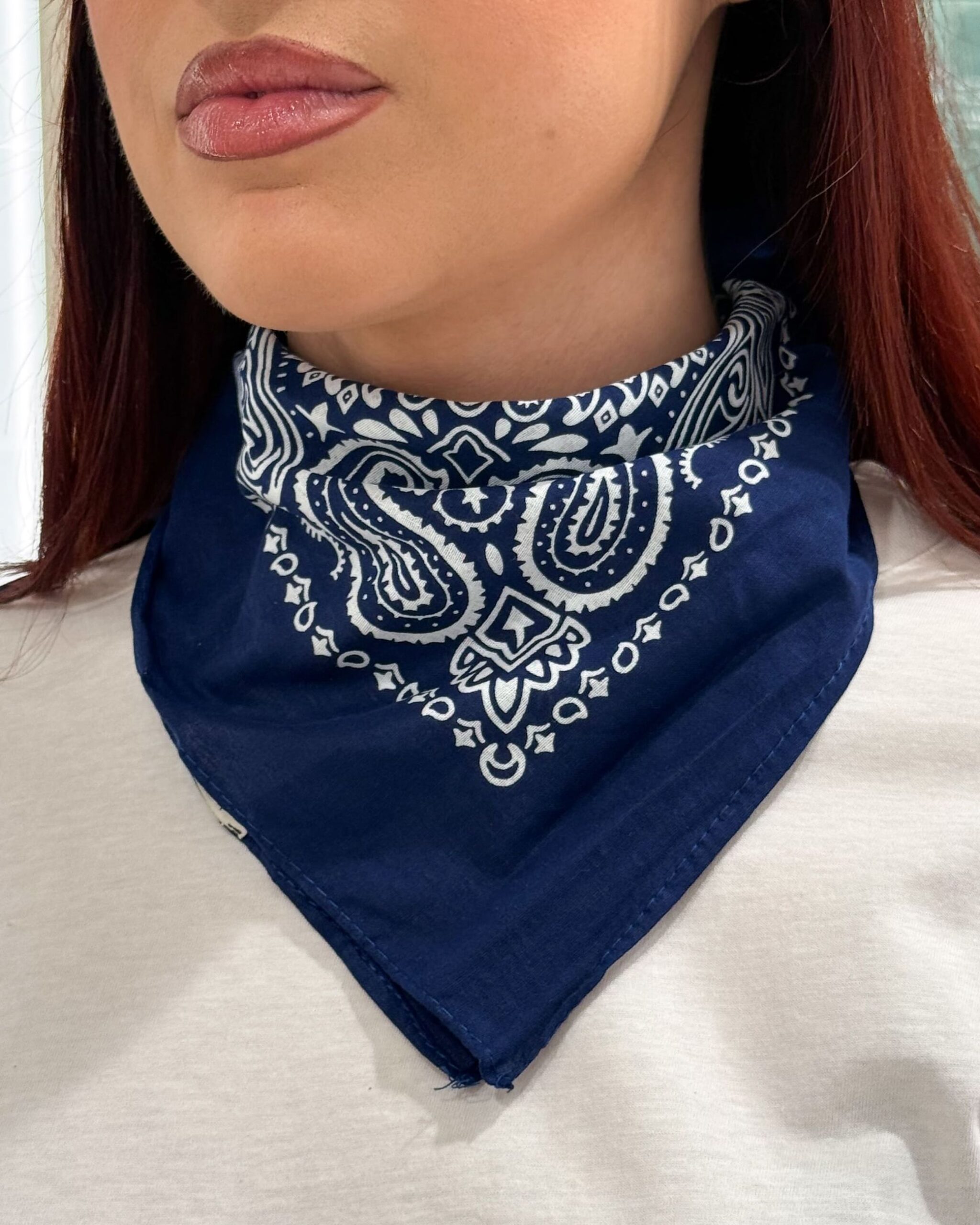 Il foulard bandana della collezione primavera/estate di Vicolo è caratterizzato dall’iconica stampa paisley a contrasto. Realizzato in tessuto leggero e morbido, presenta bordi rifiniti e una texture fresca ideale da indossare in ogni stagione.