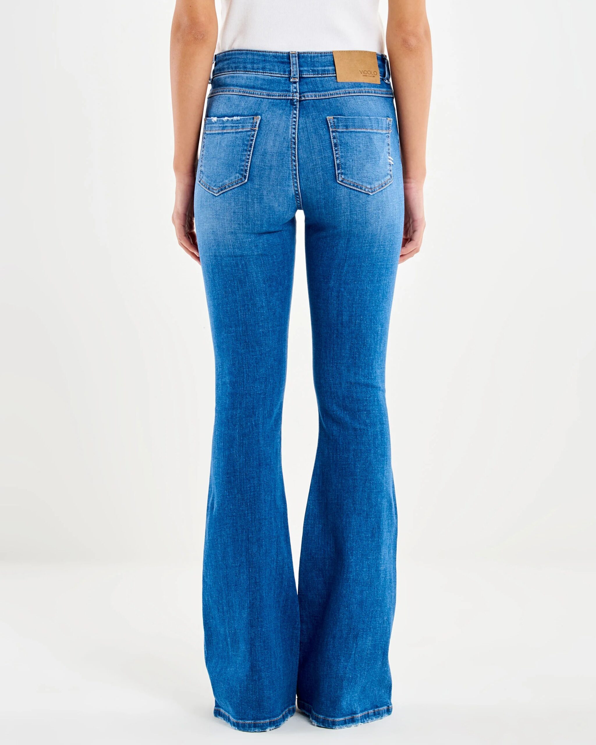 Il denim Gisele della collezione primavera/estate di Vicolo è caratterizzato dal design flare a vita media. Modello a cinque tasche e chiusura con bottone metallico e zip a scomparsa.