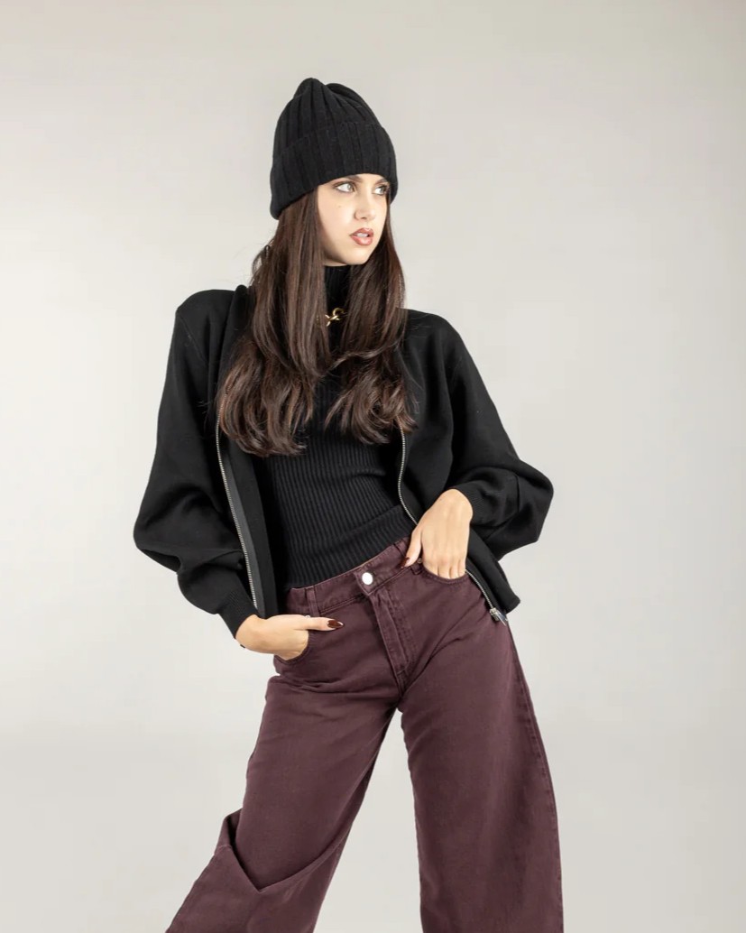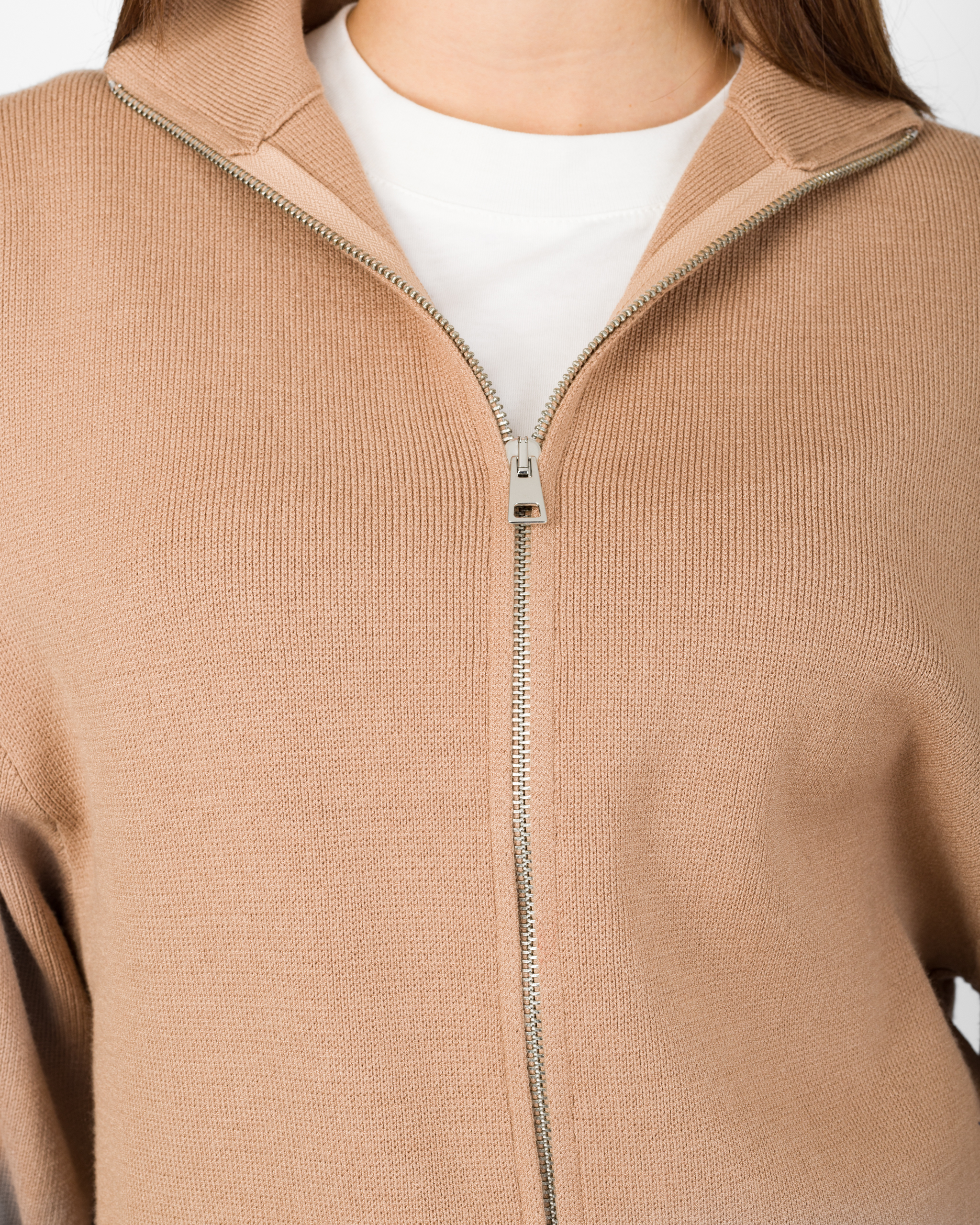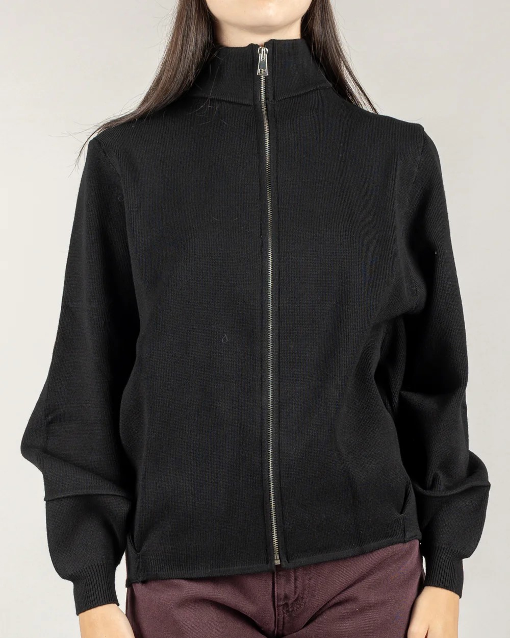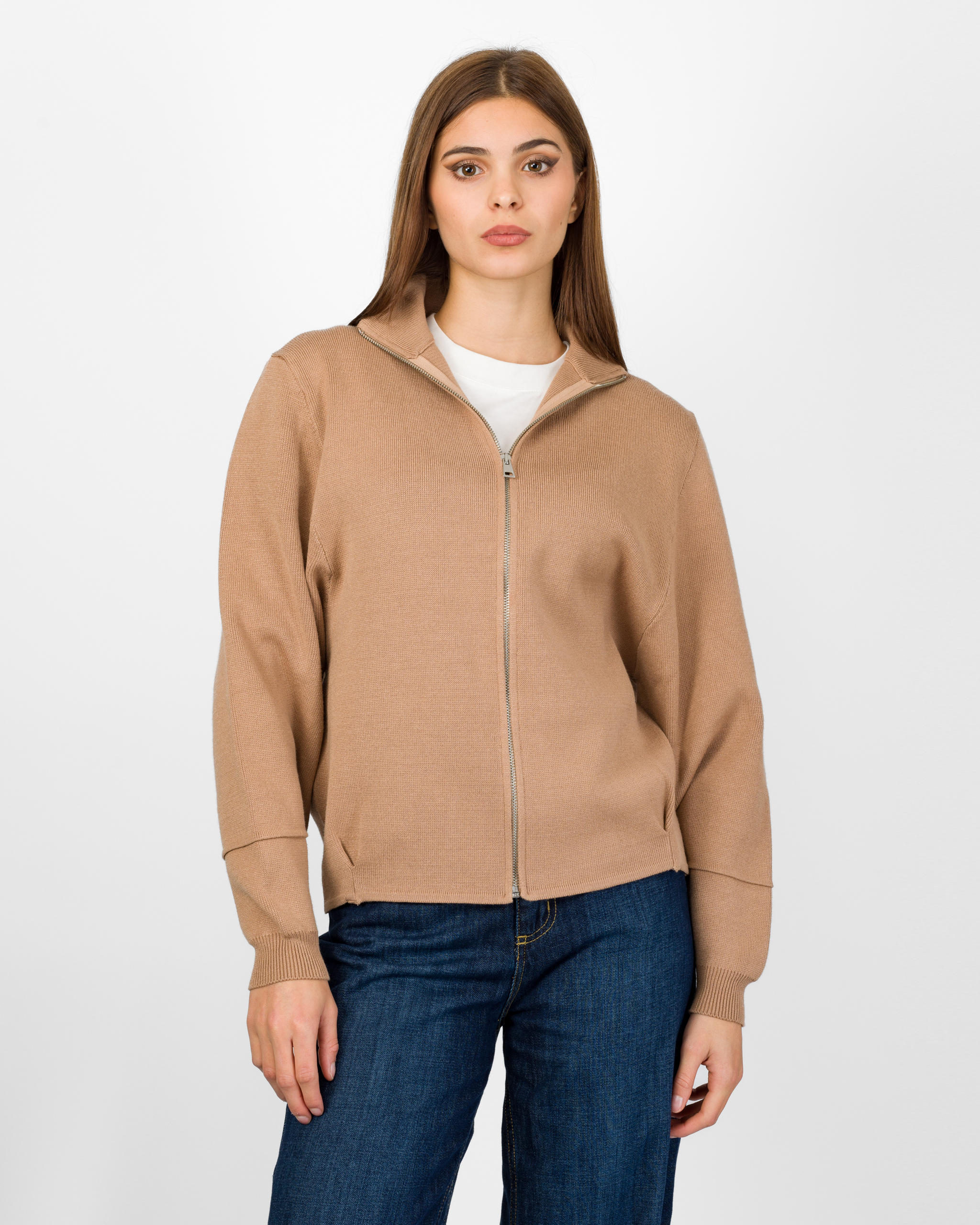 Il pull della collezione autunno/inverno di Kontatto è caratterizzato da un design moderno e avvolgente. Presenta collo alto con chiusura frontale a zip metallizzata, maniche lunghe voluminose ed una linea con lunghezza regolare che rende il capo versatile e facile da sovrapporre.