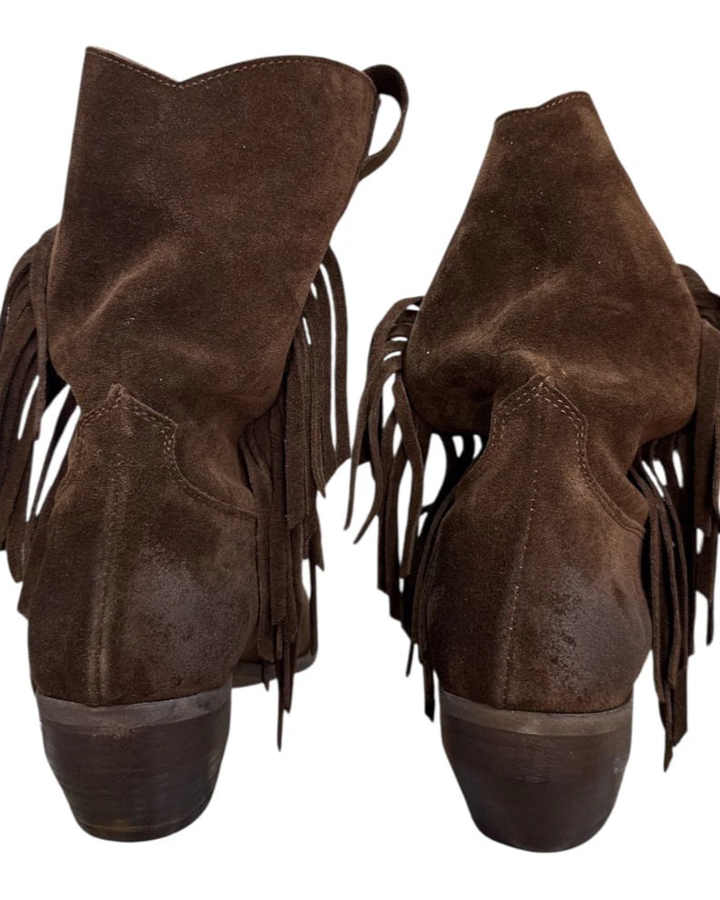 Lo stivale texano della collezione primavera/estate di Ovyé è caratterizzato da una silhouette ankle boot dal fascino western contemporaneo. Presenta punta affusolata, gambale morbido con profilo sagomato, tacco basso inclinato e pratico tirante posteriore. Le frange laterali in tono aggiungono movimento e personalità, mentre la finitura effetto camoscio color moro ne esalta il carattere autentico.