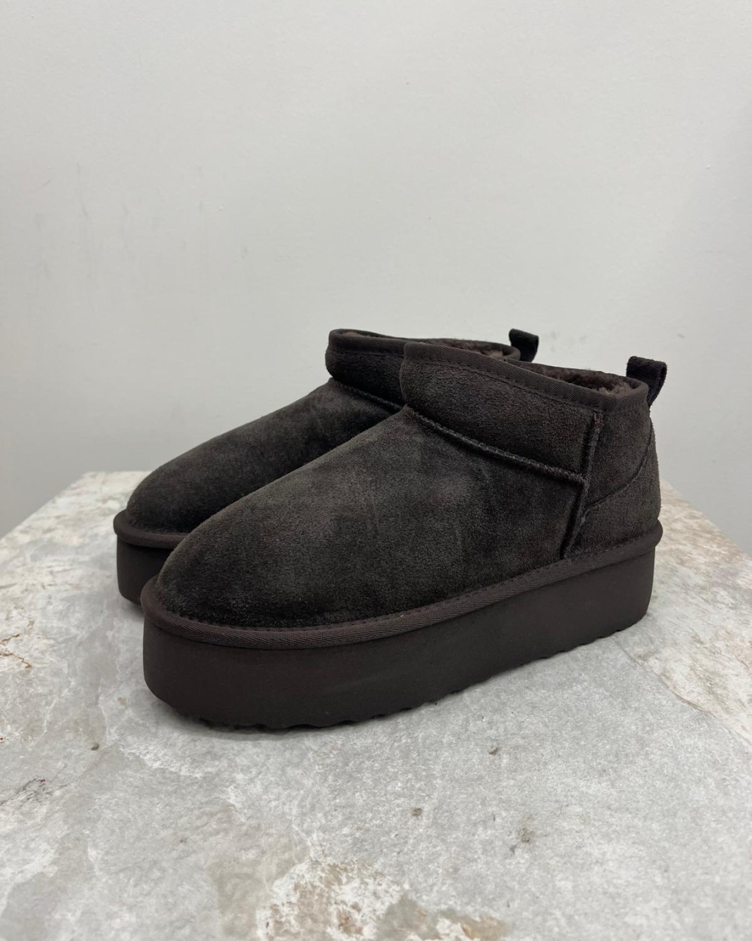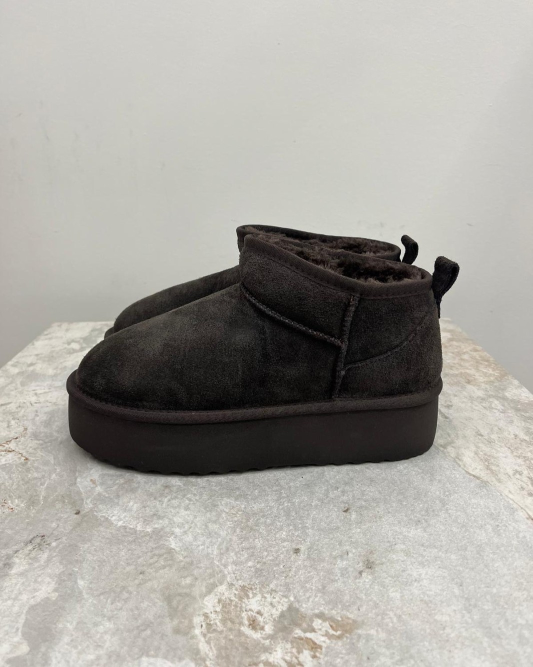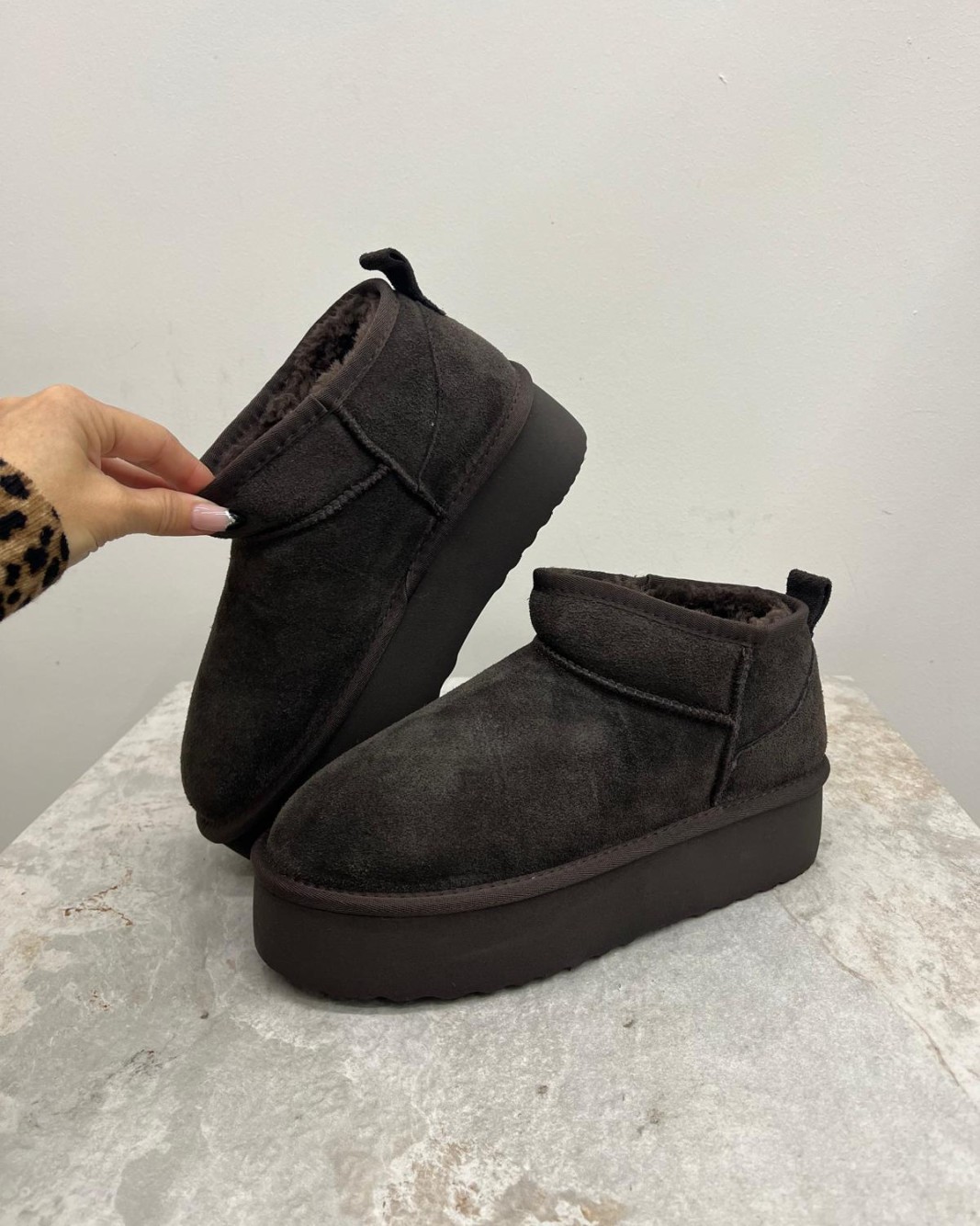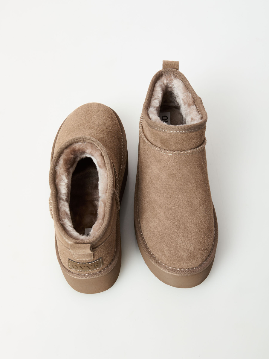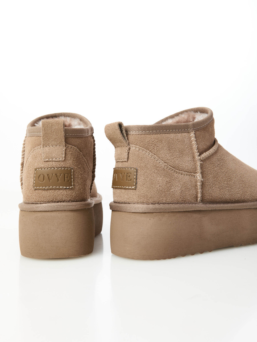 Lo stivaletto in suede della collezione autunno/inverno di Ovyé by Cristina Lucchi si distingue per la suola platform che dona altezza ed un twist contemporaneo al classico modello. Interamente foderato in tessuto eco-pelliccia, garantisce morbidezza e calore. Altezza alla caviglia e punta stondata. Presenta linguetta per una facile calzata.