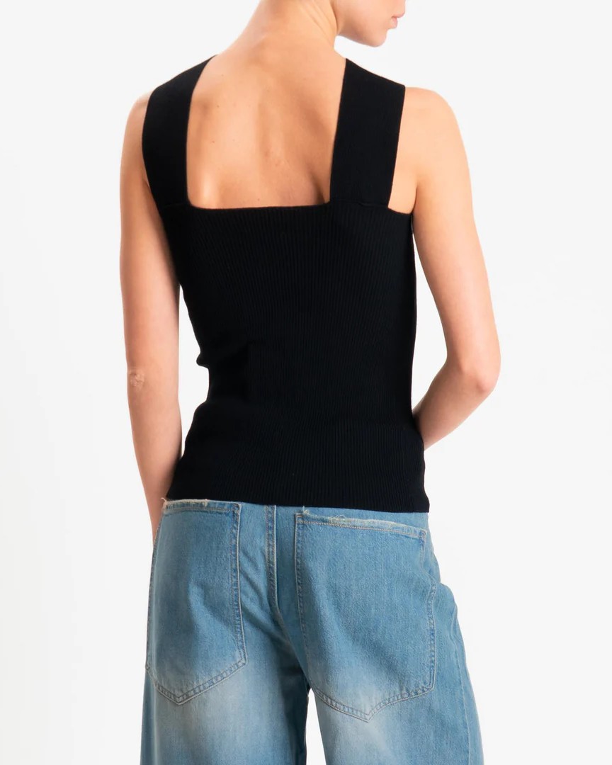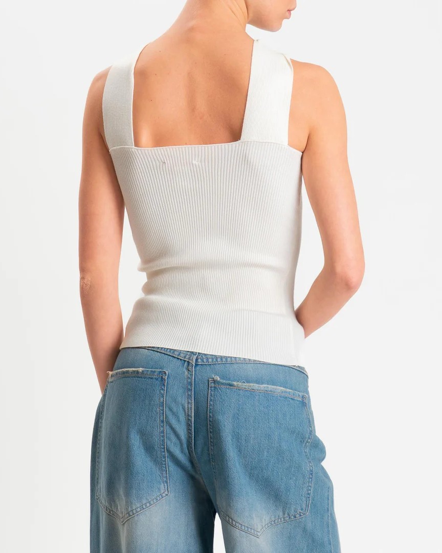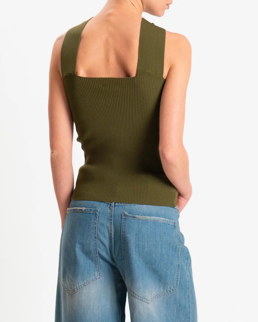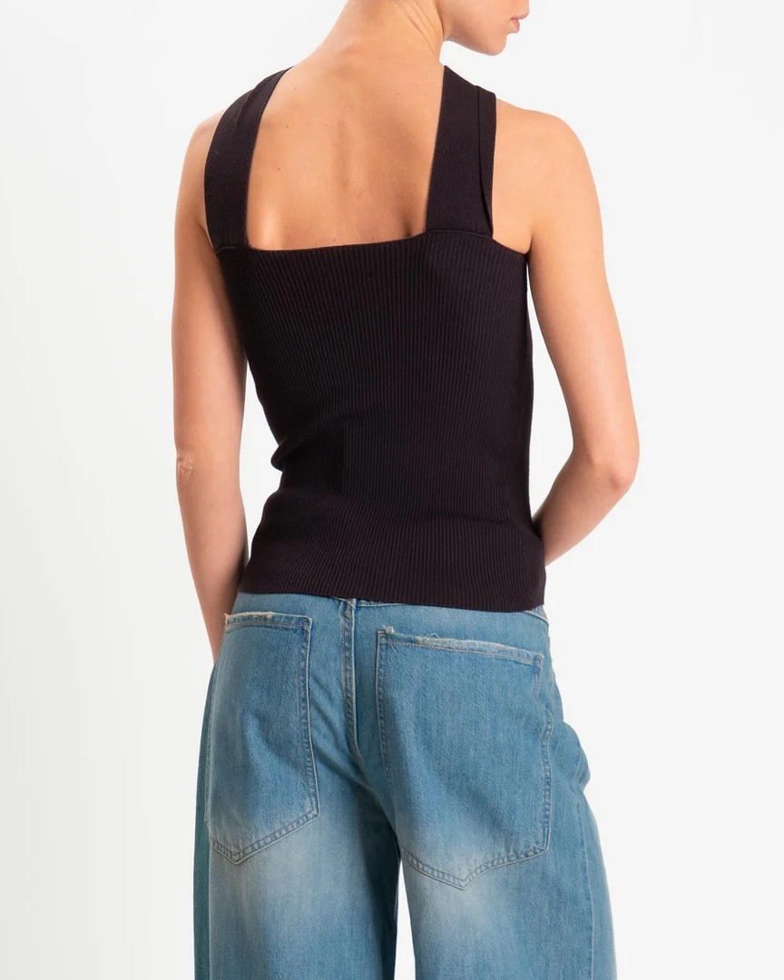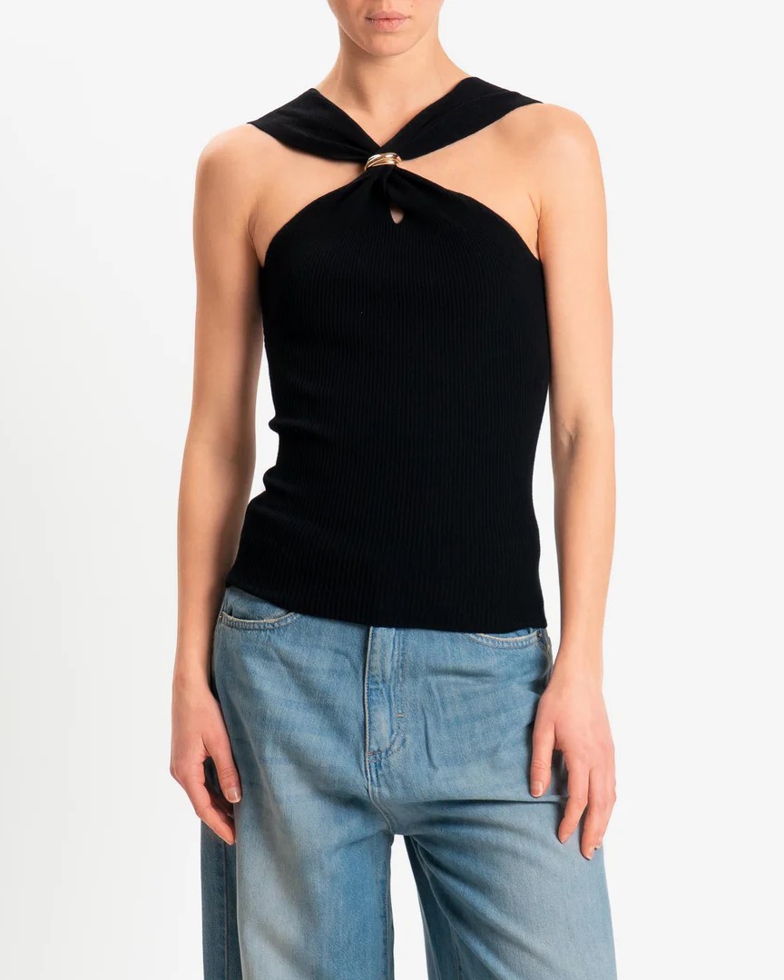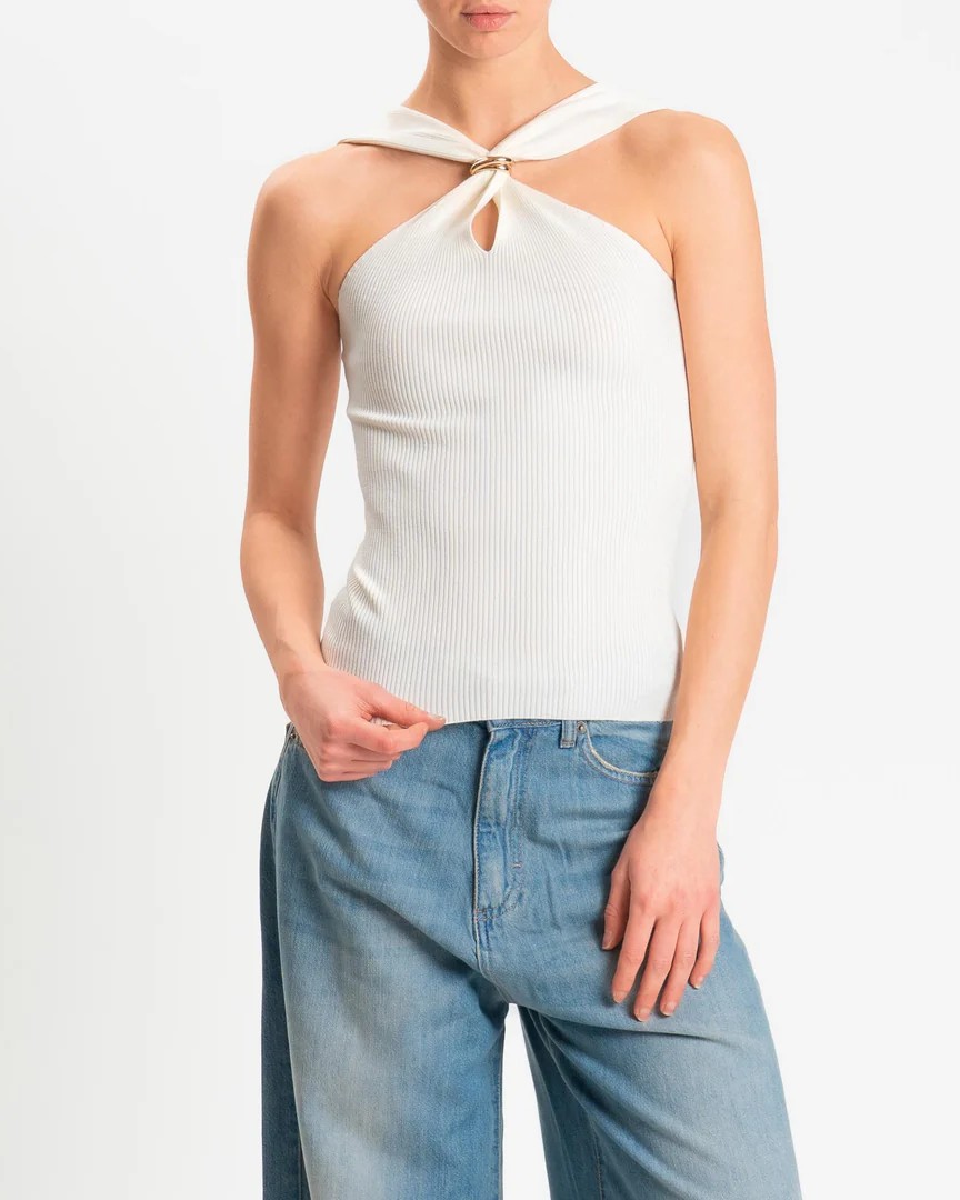 Il top della collezione primavera/estate di Kontatto è caratterizzato dalla lavorazione a costine verticali e si distingue per l’incrocio frontale con nodo centrale fermato da un anello gioiello gold, elemento che diventa protagonista del design. La linea aderente valorizza la silhouette, mentre il tessuto elasticizzato assicura comfort e definizione.